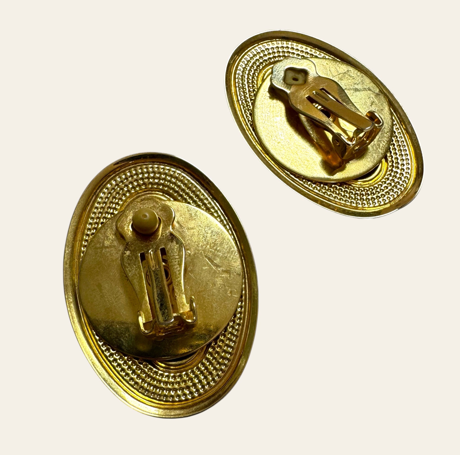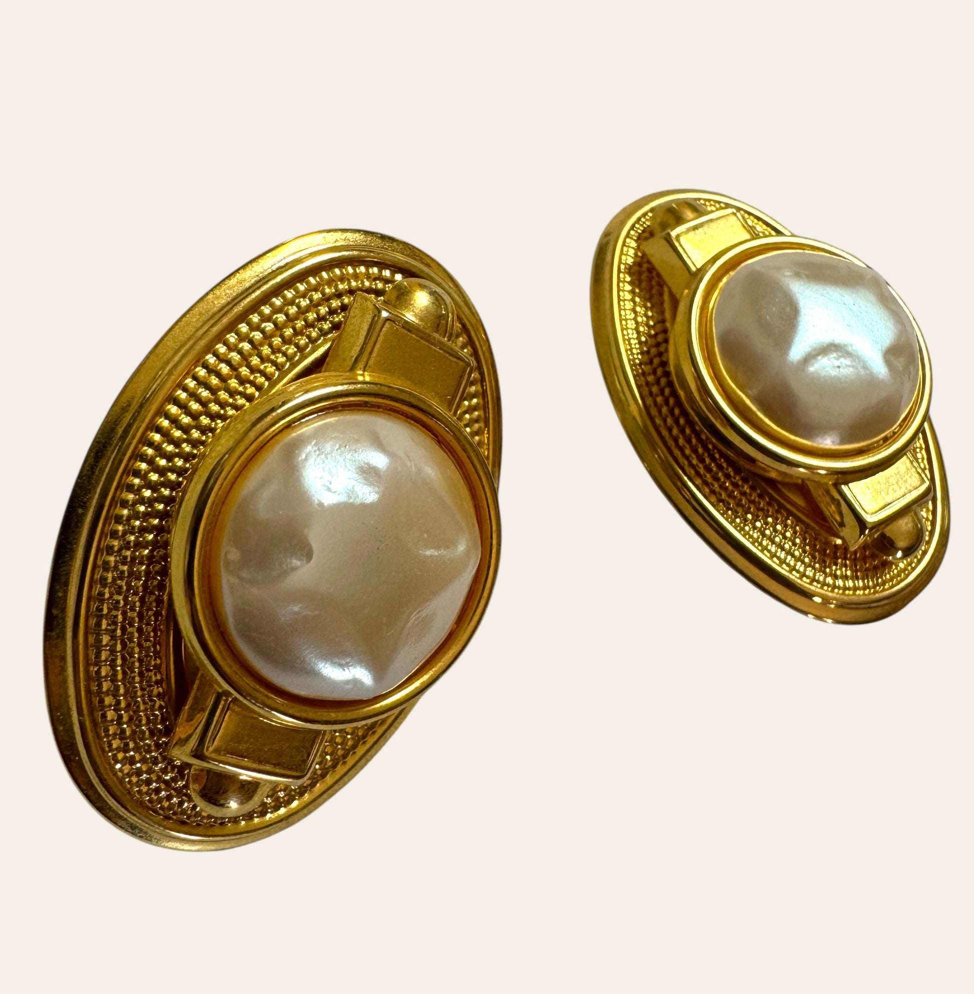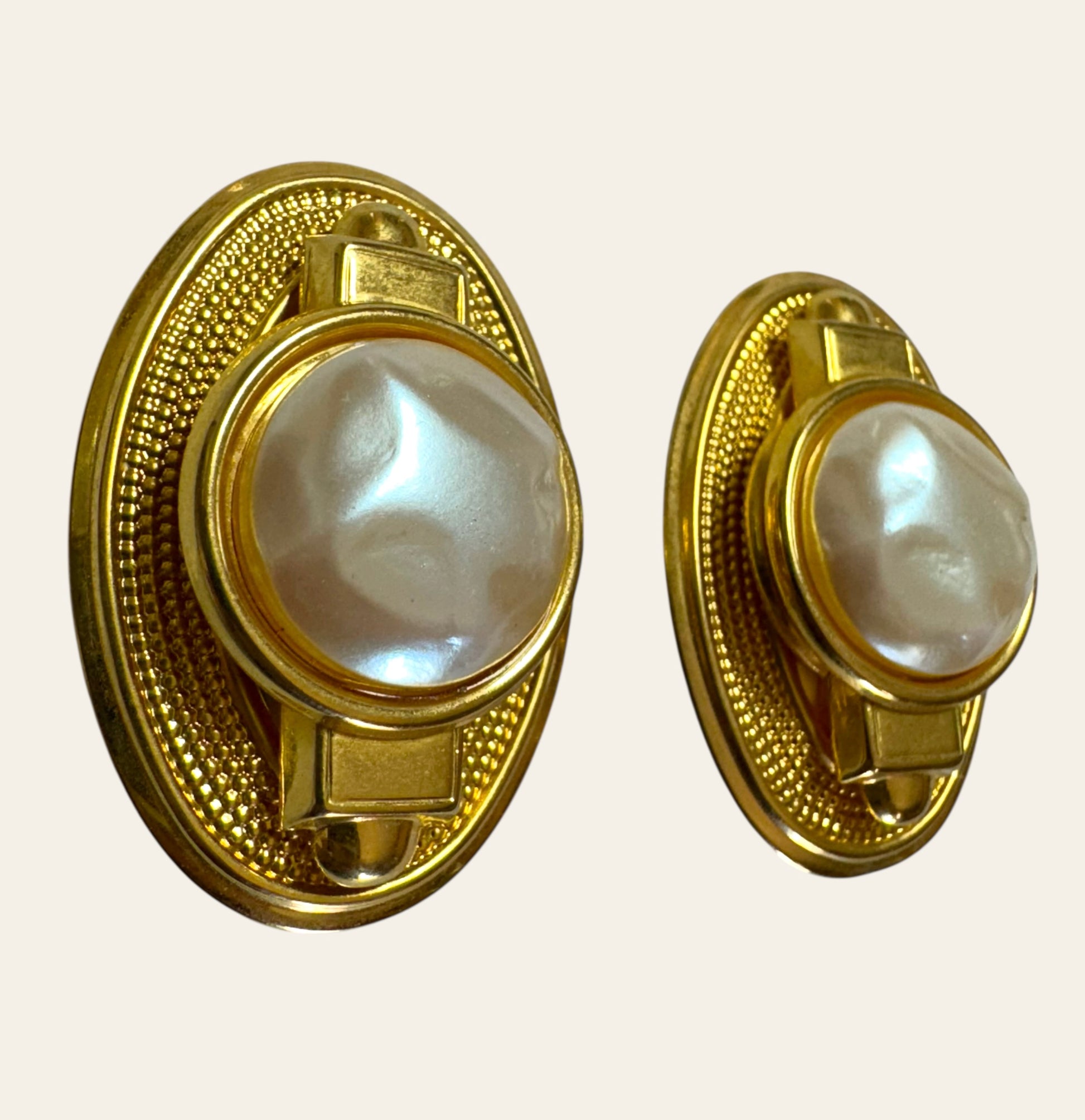 These striking vintage earrings feature domed faux baroque pearl cabochons set at the center of an ornate oval gold-tone base. The textured bezel is framed by an elegant granulated border and accented with geometric Art Deco-style details at the top and bottom. The pearlescent center has a soft, organic luster that contrasts beautifully with the rich gold finish, making these earrings both bold and regal. Clip-on backs ensure comfort and timeless elegance—perfect for elevating any ensemble with a touch of old-world glamour.