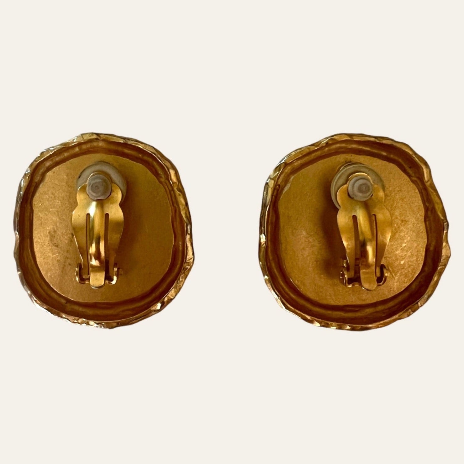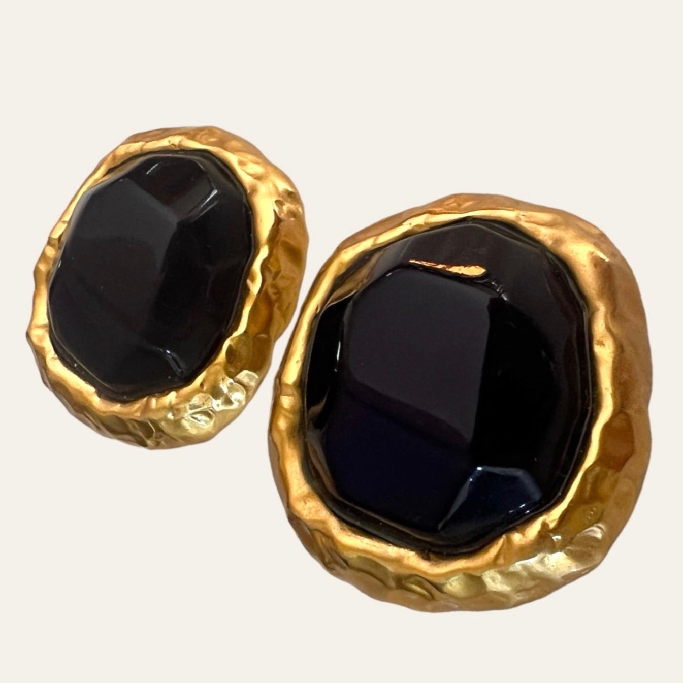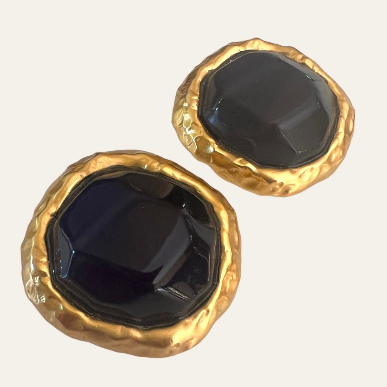 Statement extra large brushed gold tone clip on earrings with large multifaceted cut purple stones. Gorgeous!