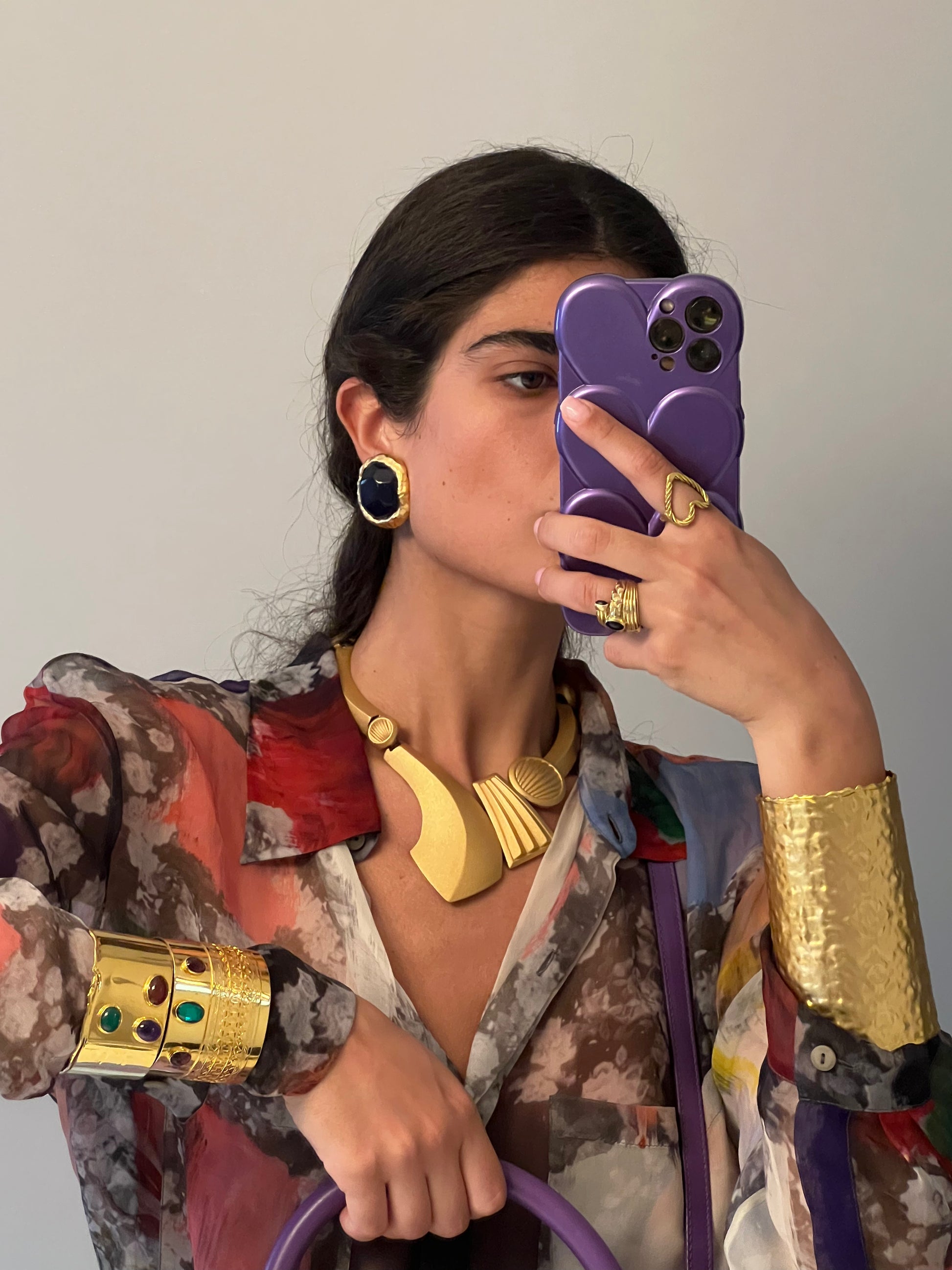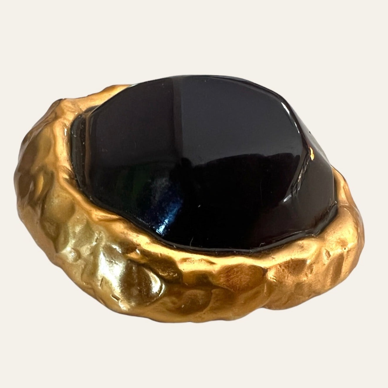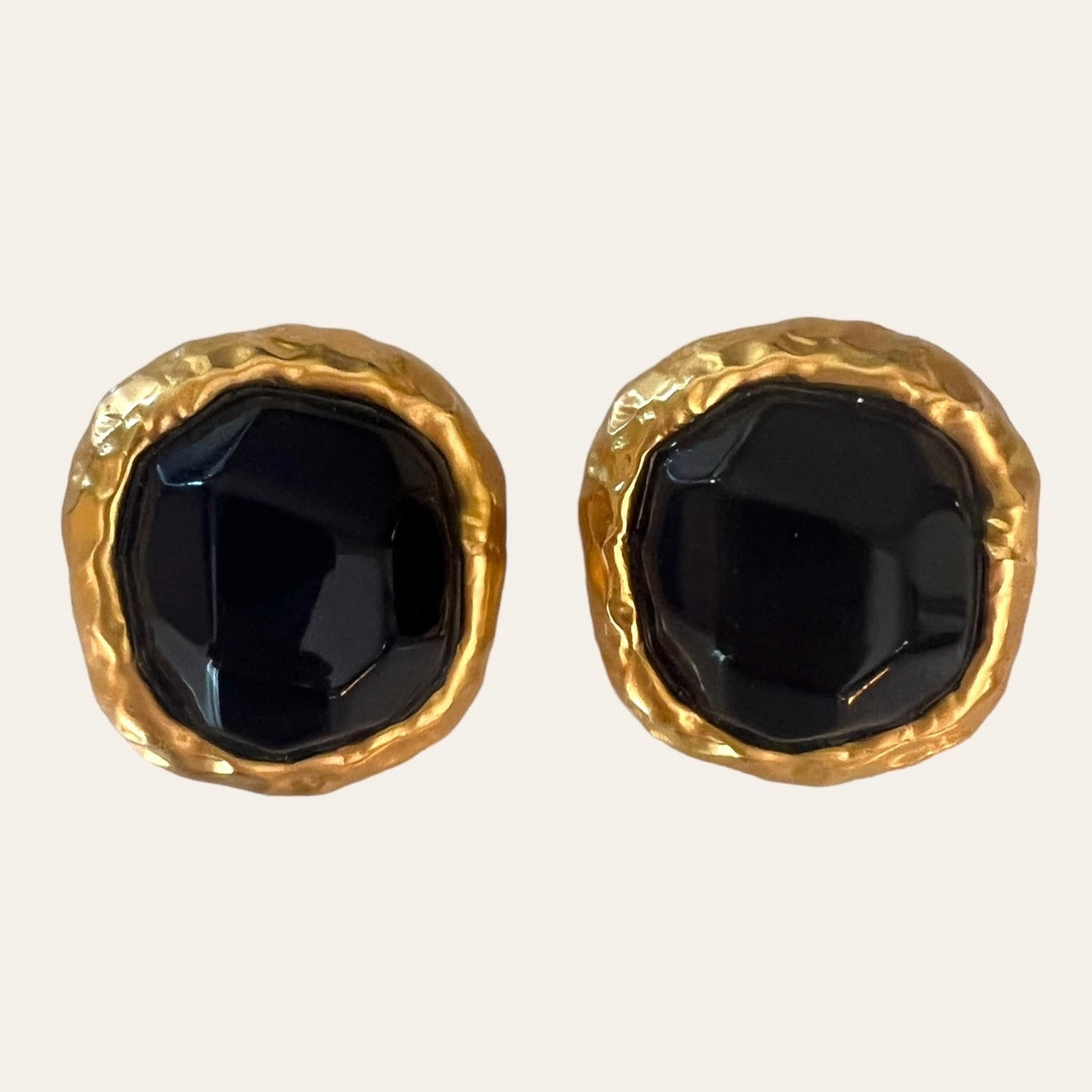 Statement extra large brushed gold tone clip on earrings with large multifaceted cut purple stones. Gorgeous!