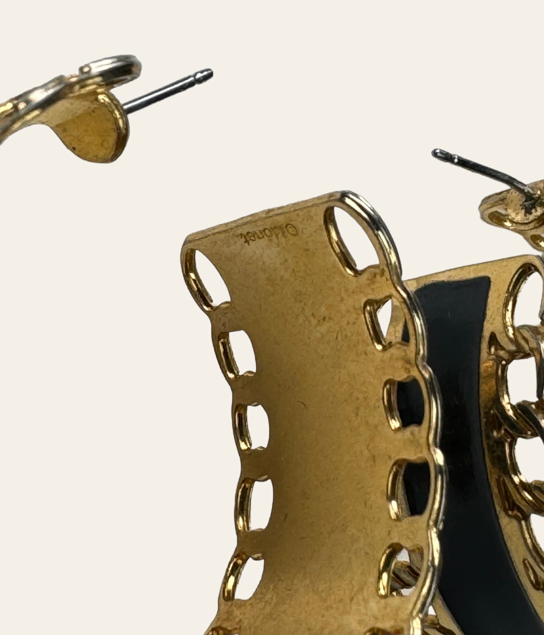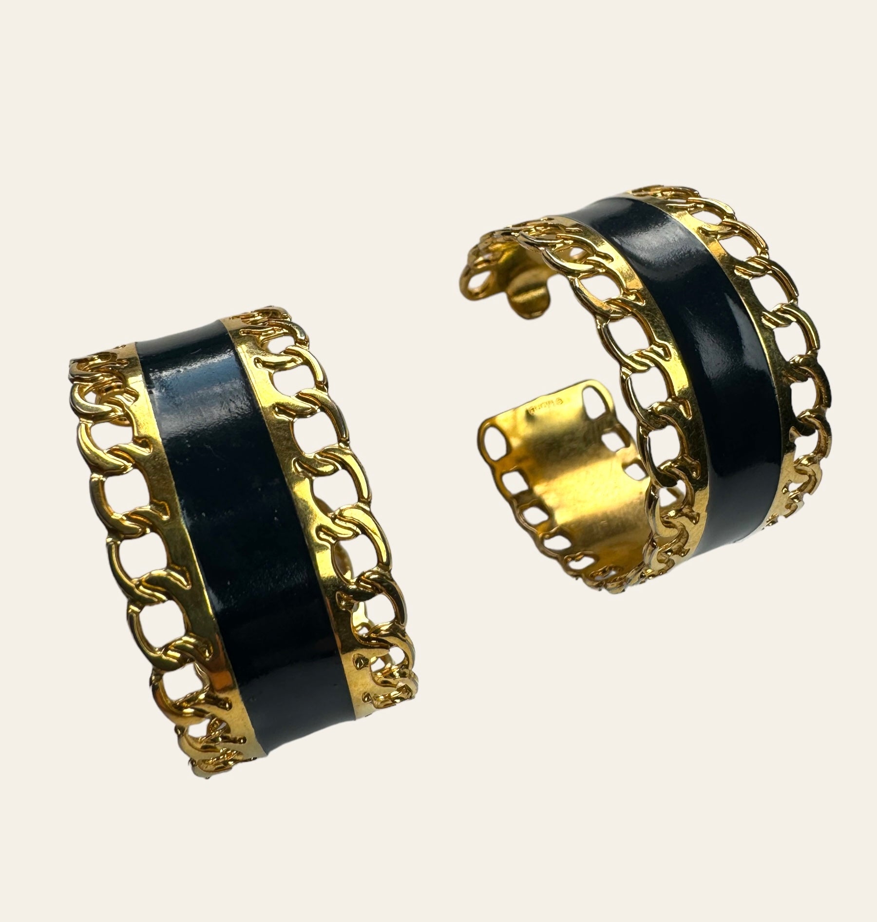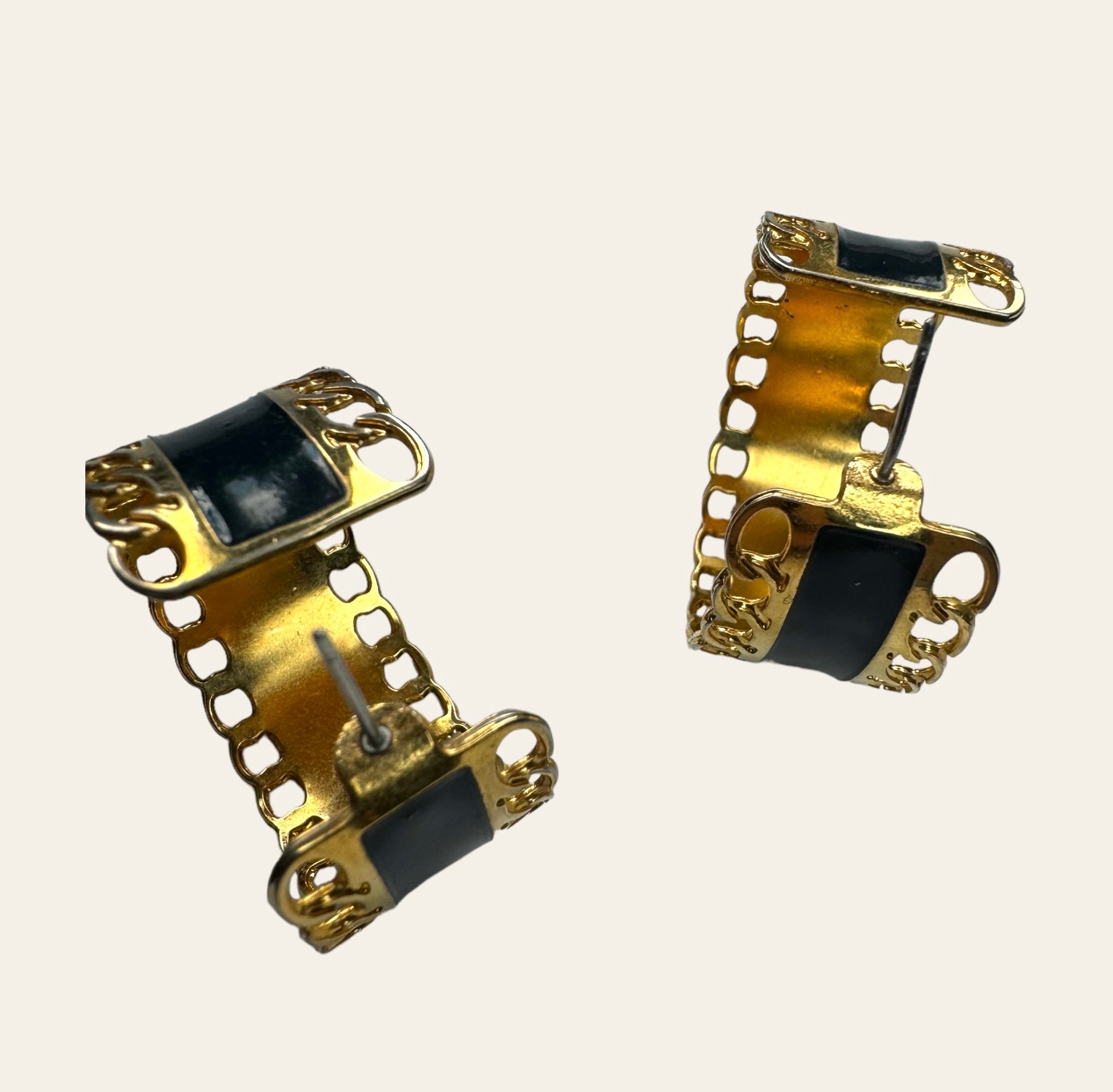Beautiful earrings by Monet featuring a gold tone metal with a navy blue enamel in between a chain style edging. A Romy's fav!