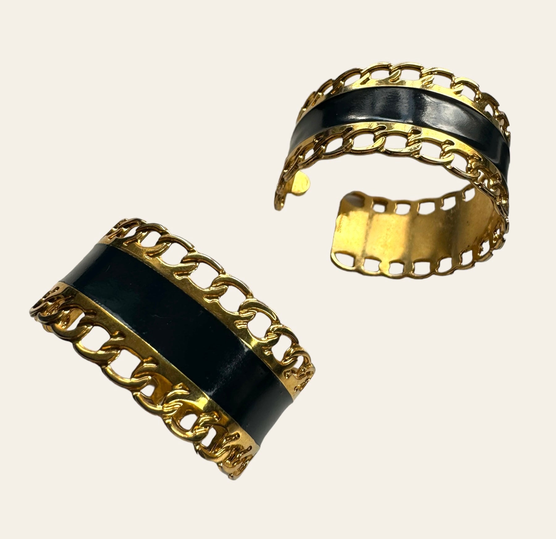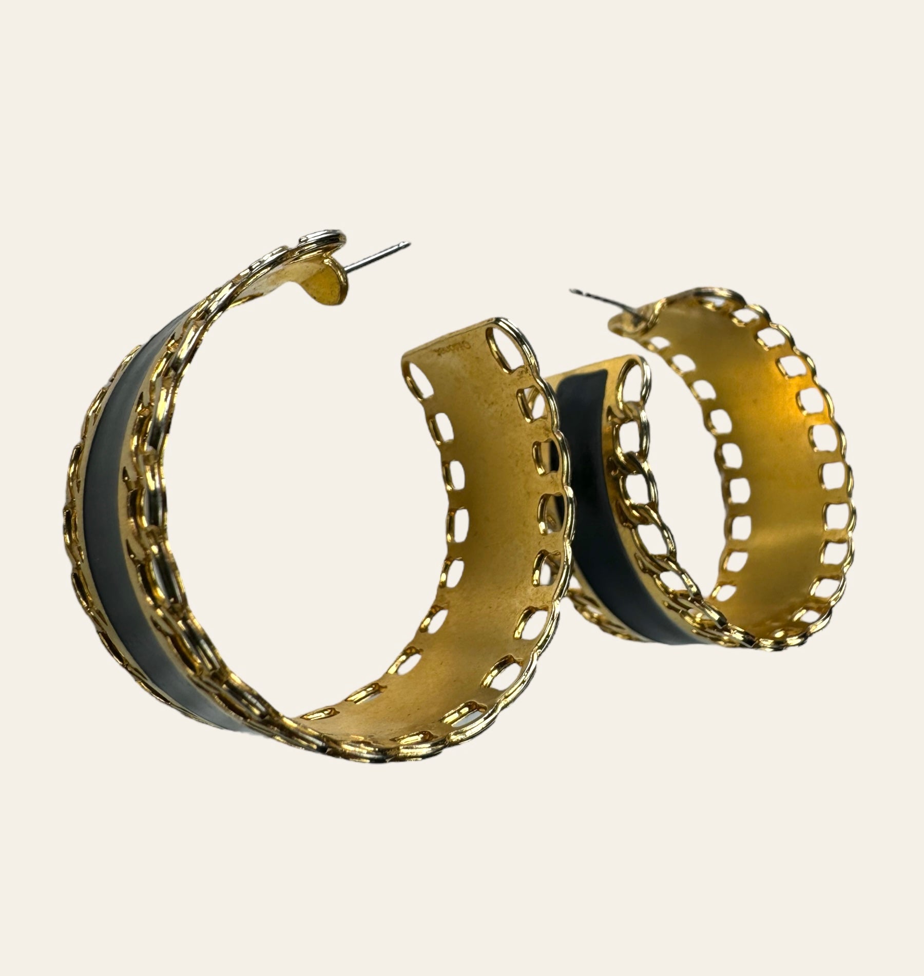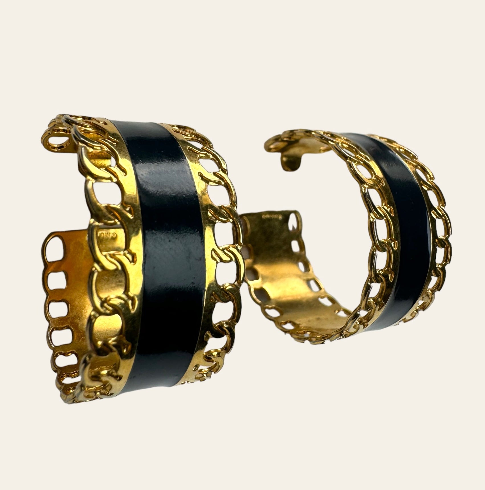 Beautiful earrings by Monet featuring a gold tone metal with a navy blue enamel in between a chain style edging. A Romy's fav!
