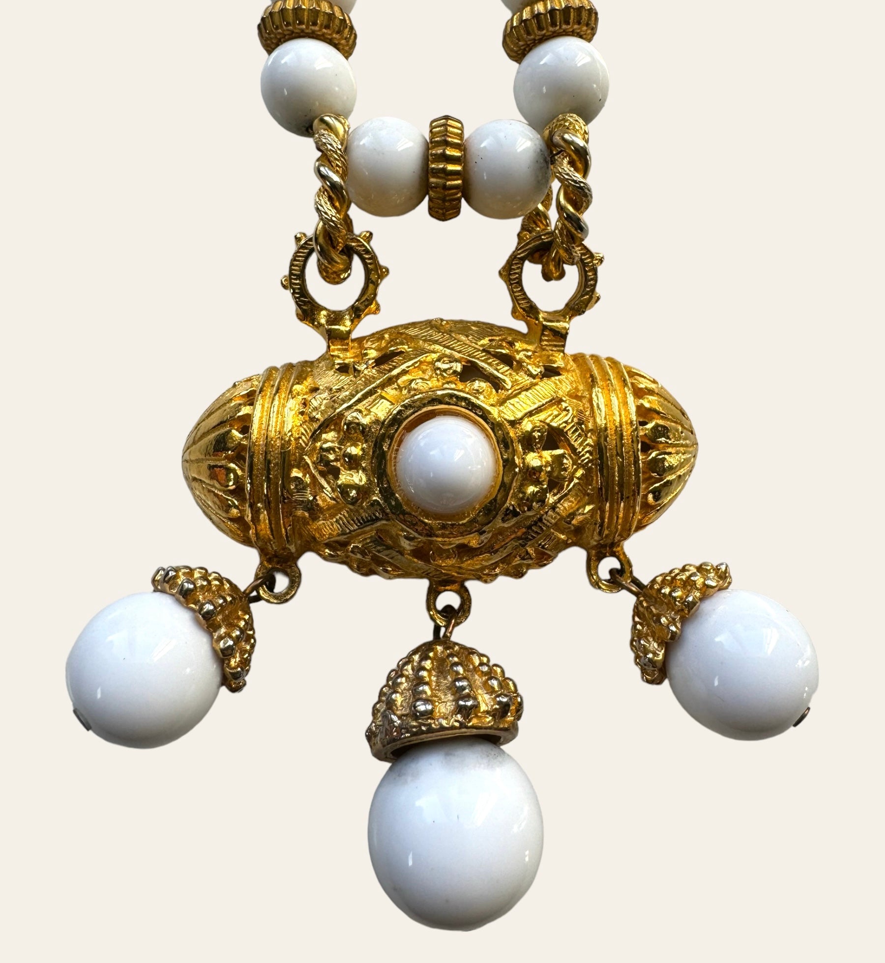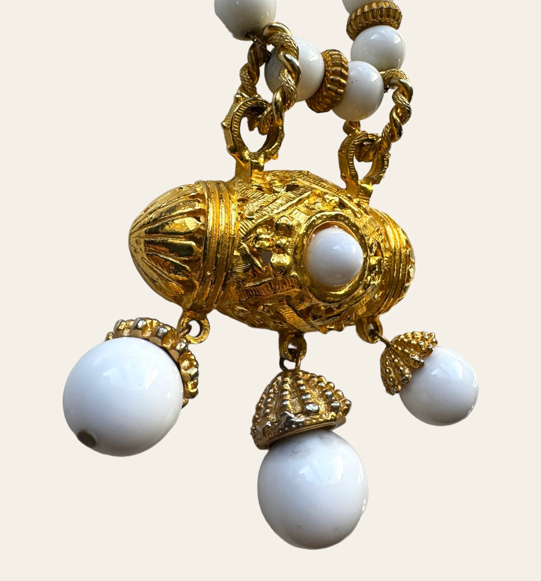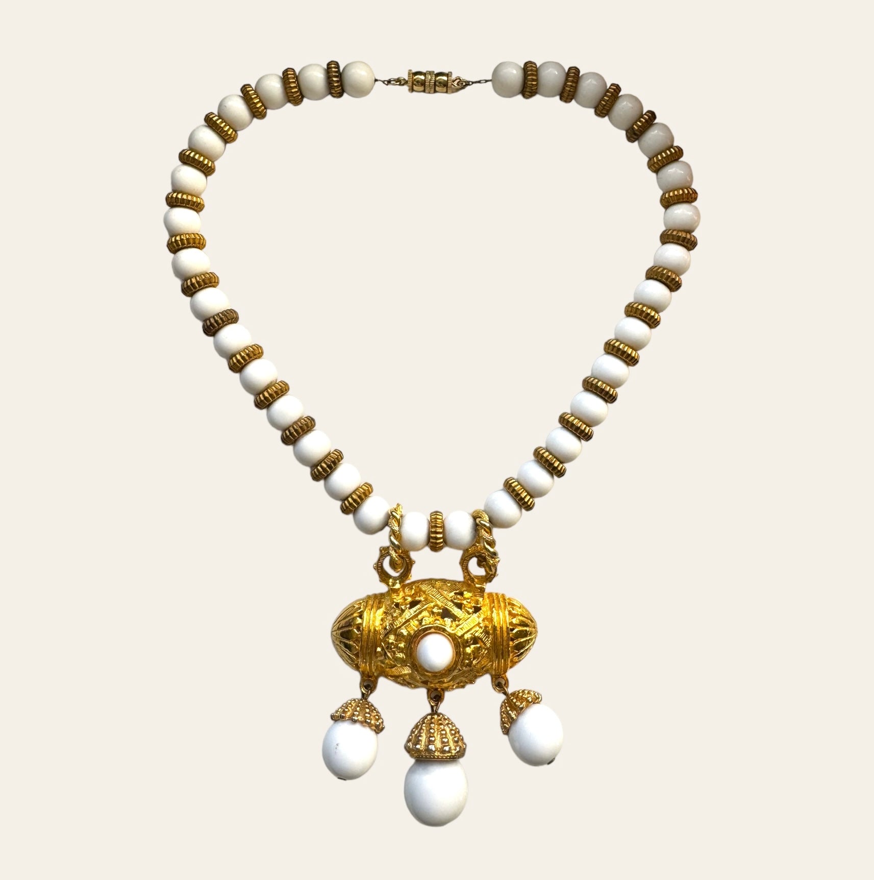 Gorgeous Etruscan style gold gilt chunky necklace signed Les Bernard, featuring elegant large chunky white beads separated by textured gold tone spacers. The shiny gold gilt pendant is beautifully textured and has large beads dangles. This is a Goddess statement designer necklace like no other!