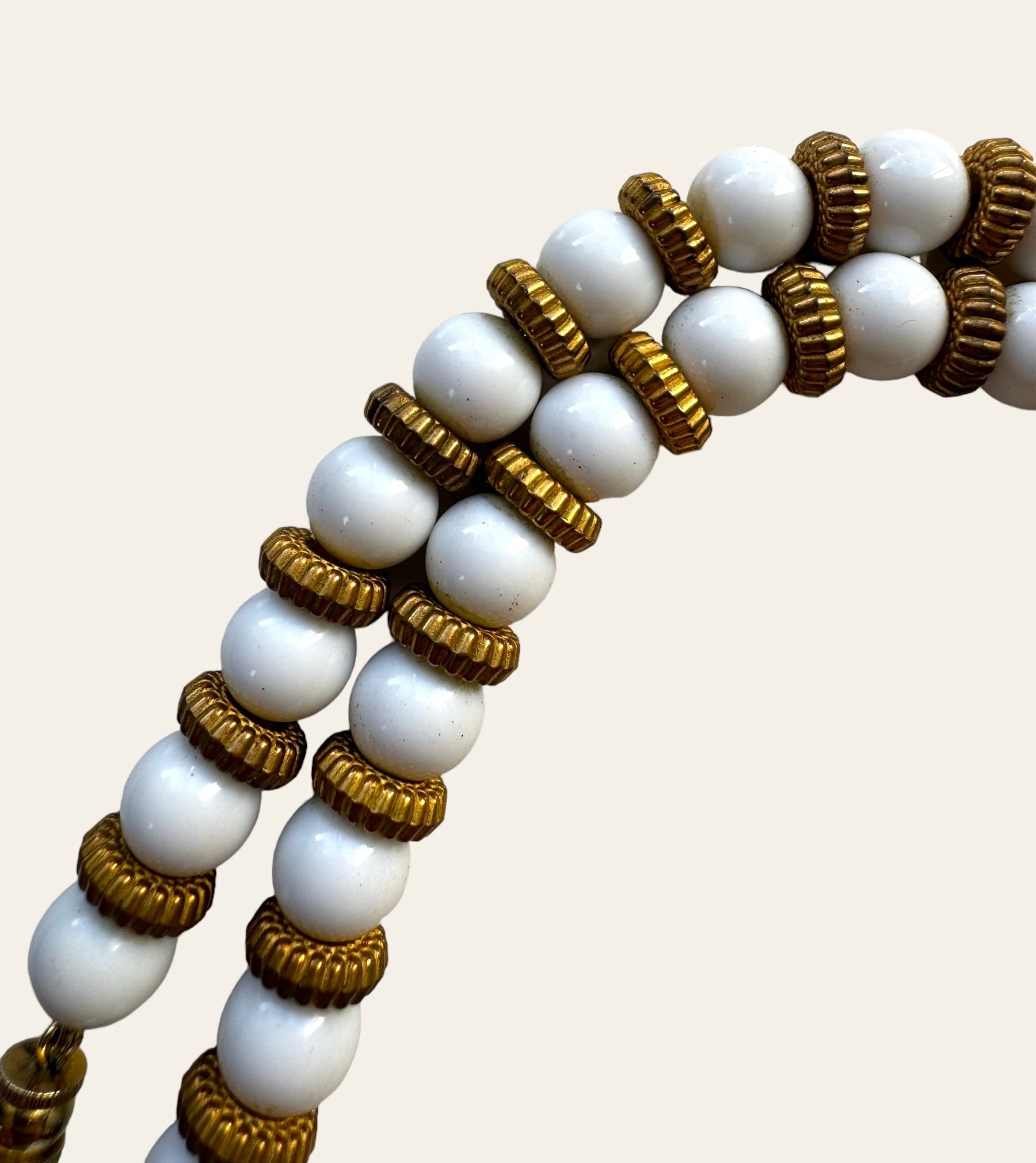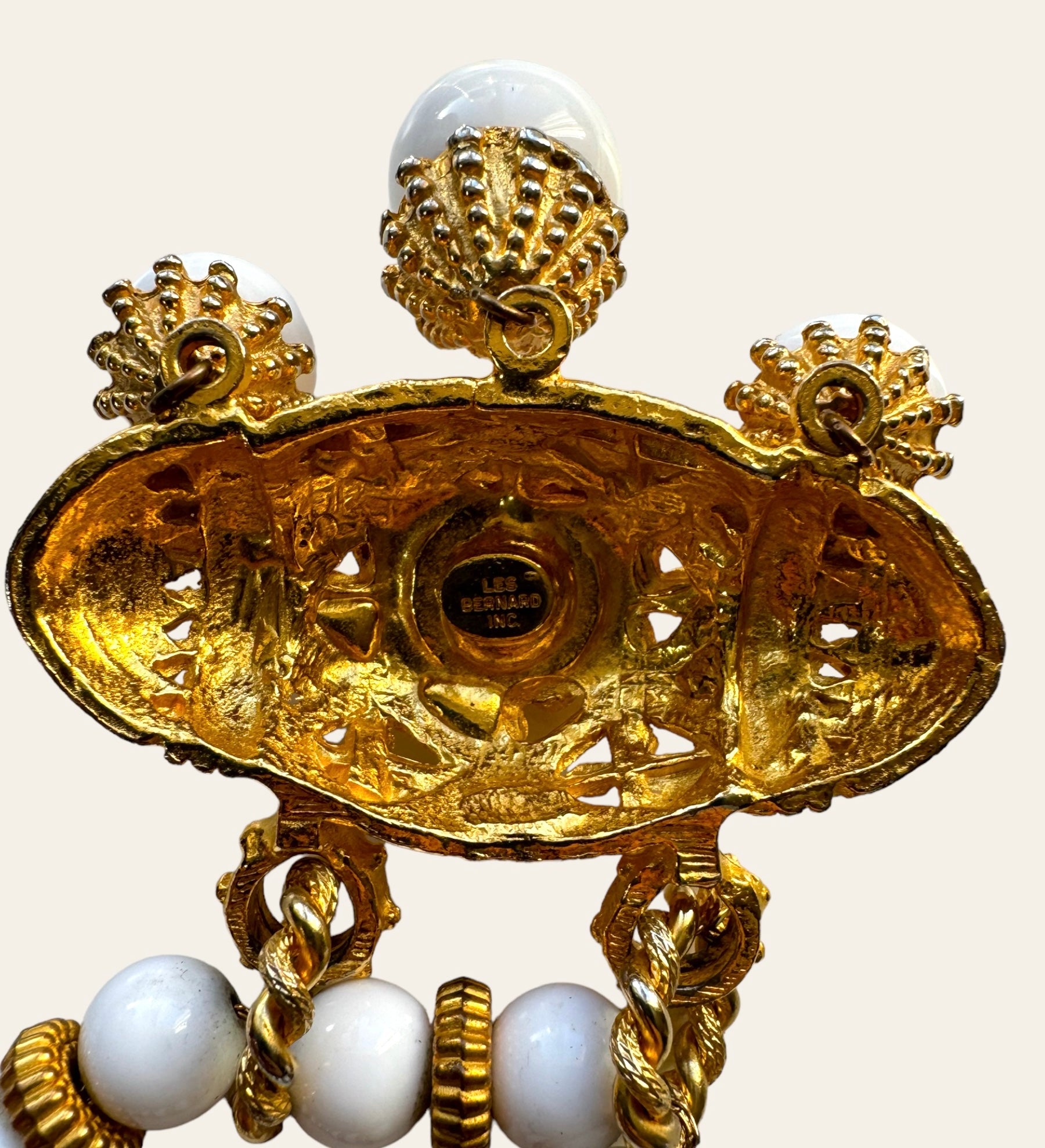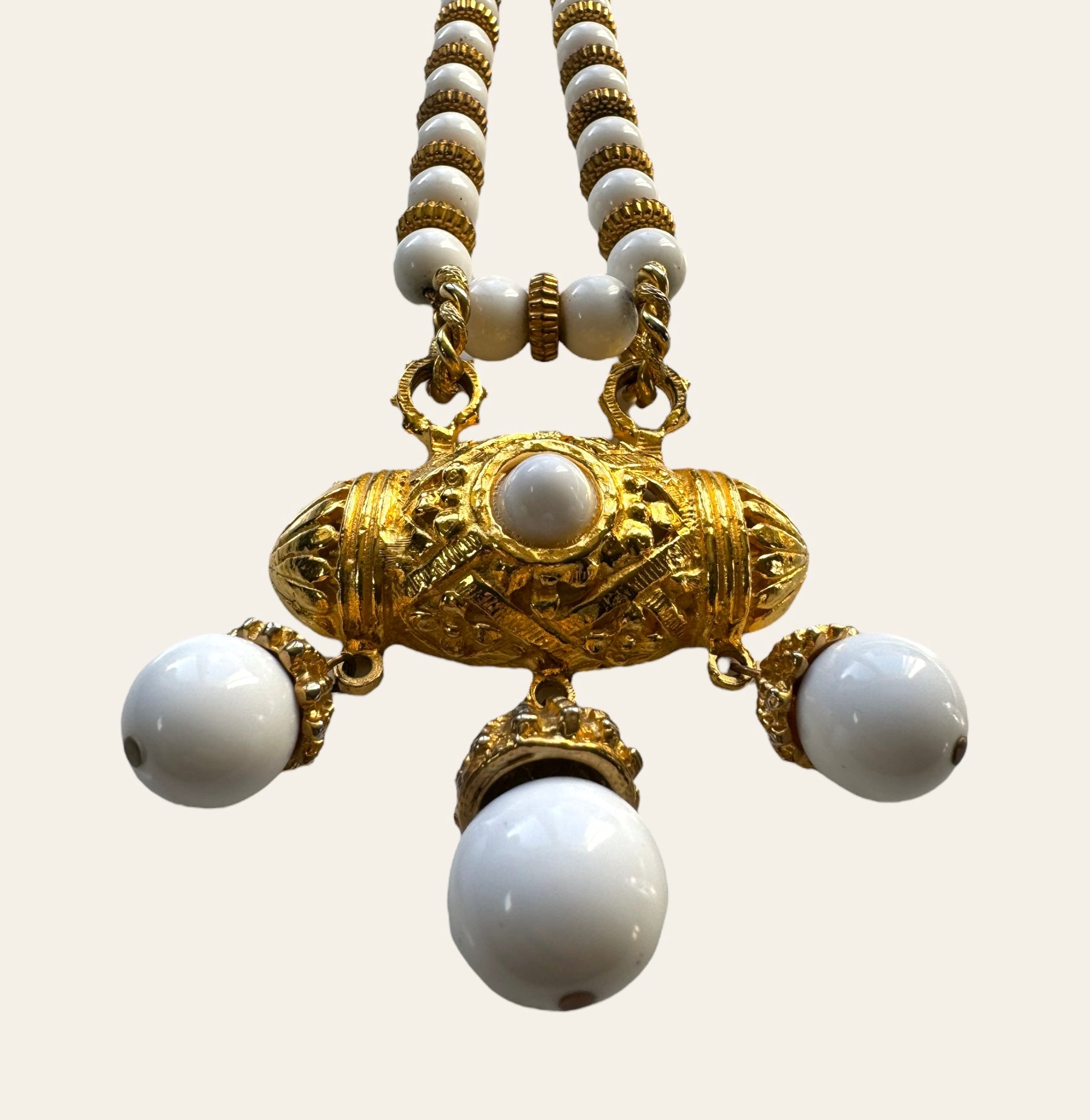 Gorgeous Etruscan style gold gilt chunky necklace signed Les Bernard, featuring elegant large chunky white beads separated by textured gold tone spacers. The shiny gold gilt pendant is beautifully textured and has large beads dangles. This is a Goddess statement designer necklace like no other!