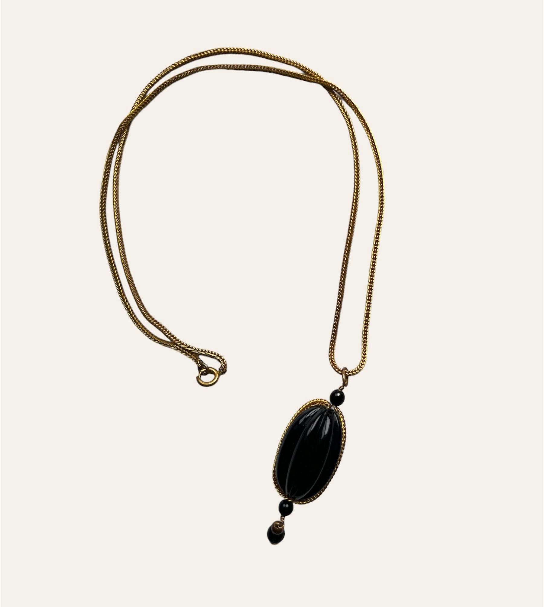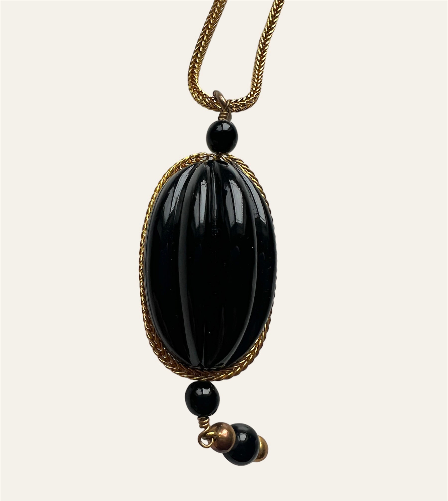 A nice rope chain in a rich gold tone with a nice oval shaped pearl in a shiny black with dangled beads attached to it. It is an unsigned.