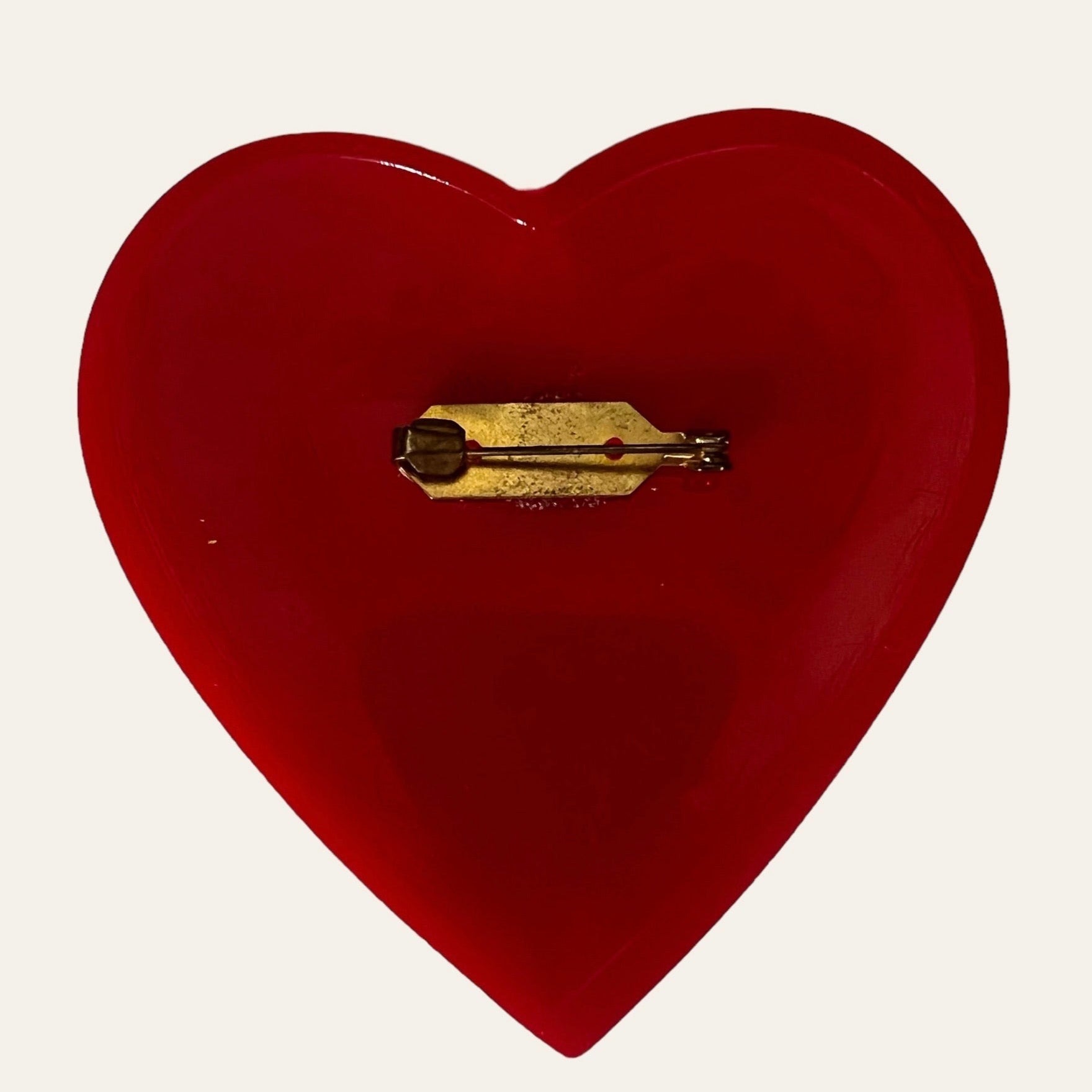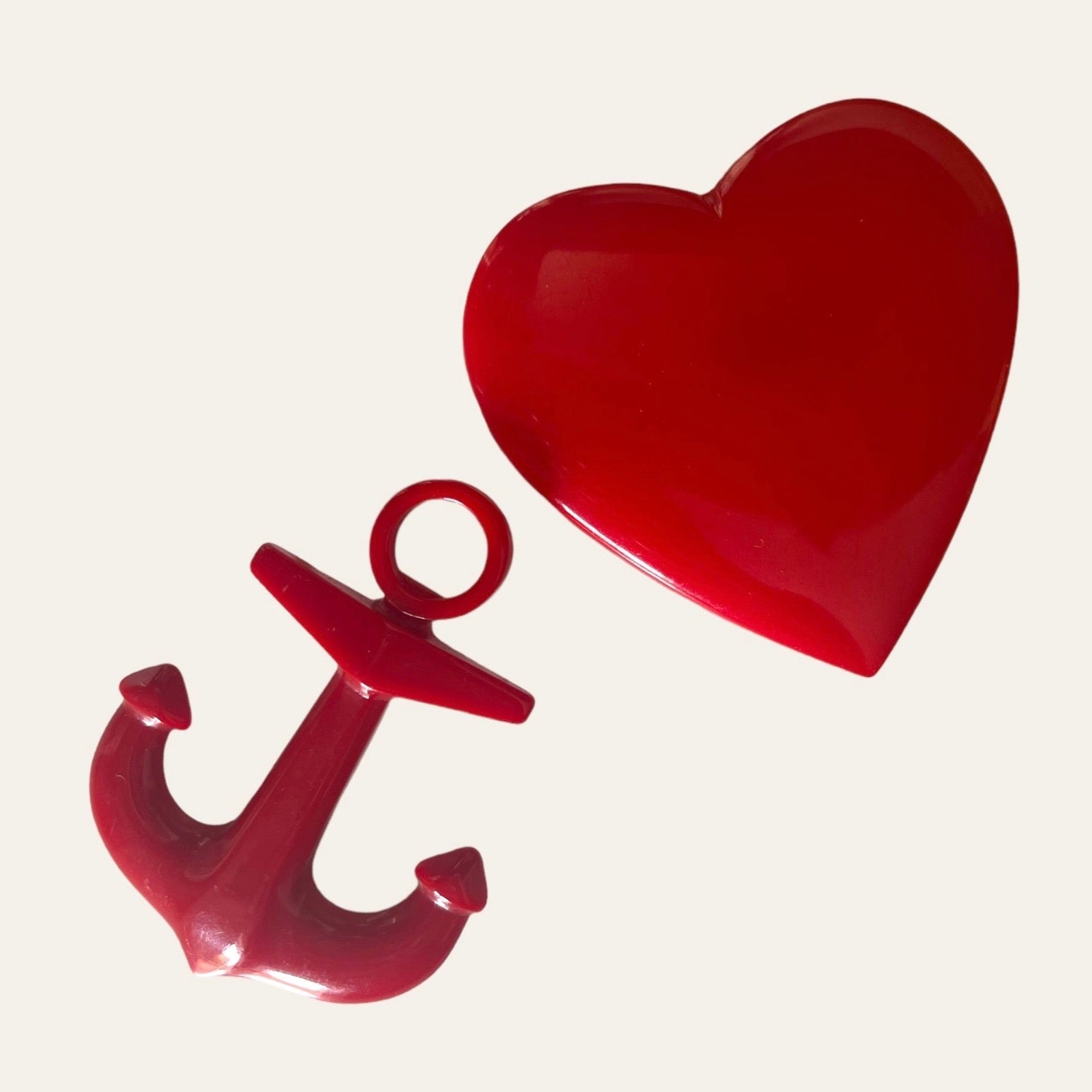 Unsigned massive red bakelite brooches in the shape of a heart and sea anchor. These are so cheeky and cute and will decorate any black little outfit or blazer.