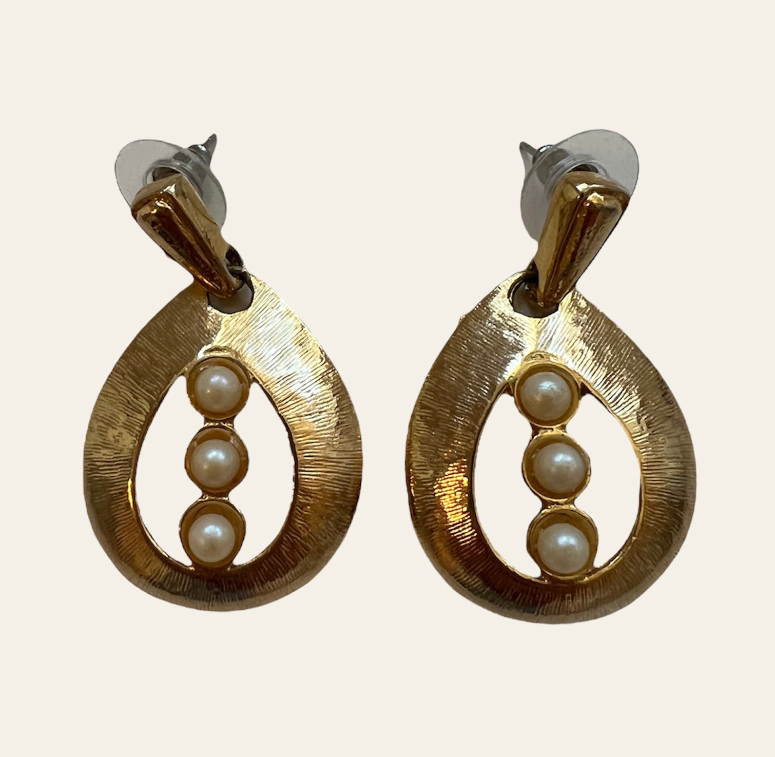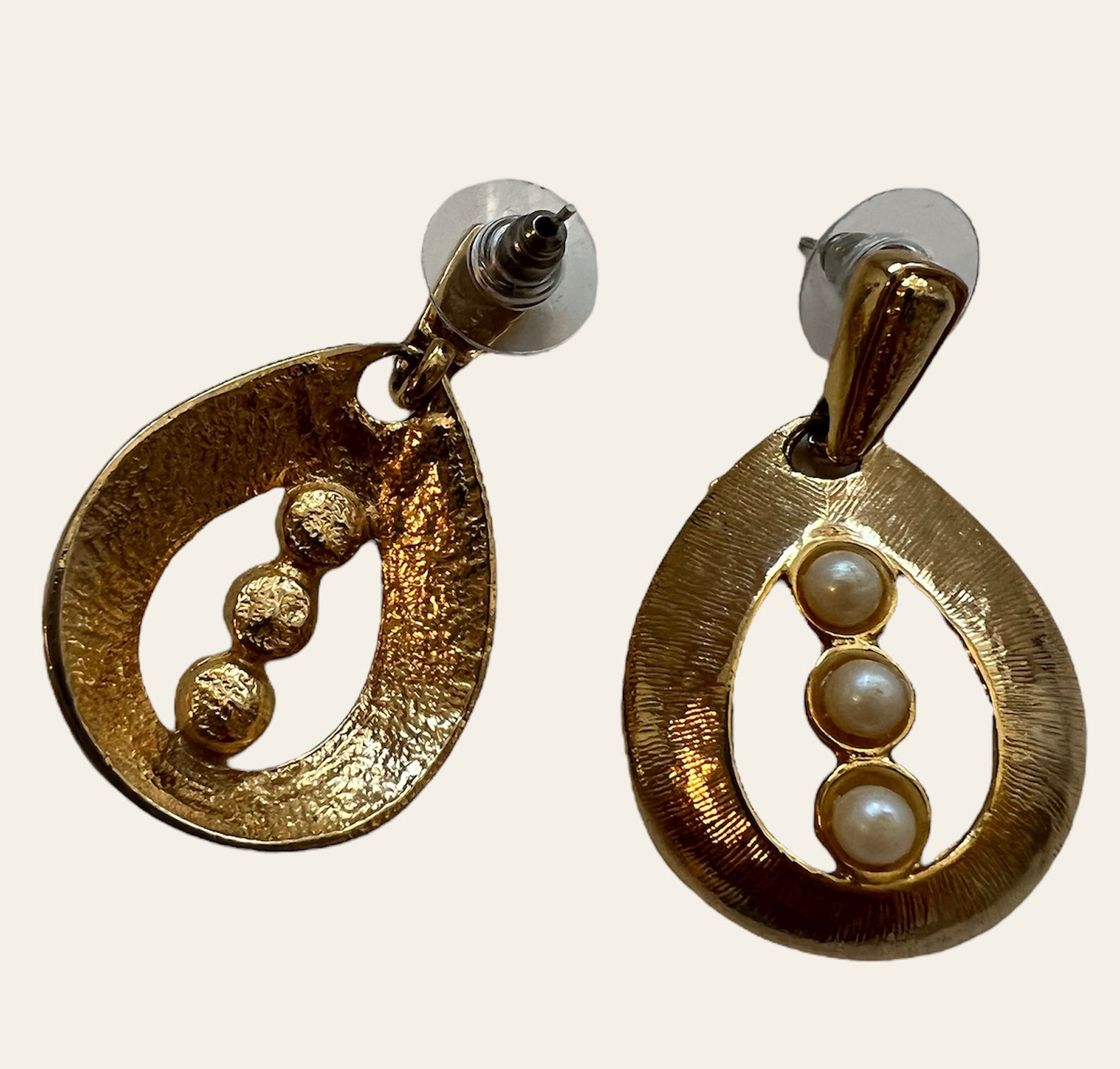 Those etched and gold tone nicely designed earrings are over 50 years old. They have 3 faux pearls on each that might be real cultured pearls. If you're into simple and chic, those earrings are for you! So nice with a summer dress!