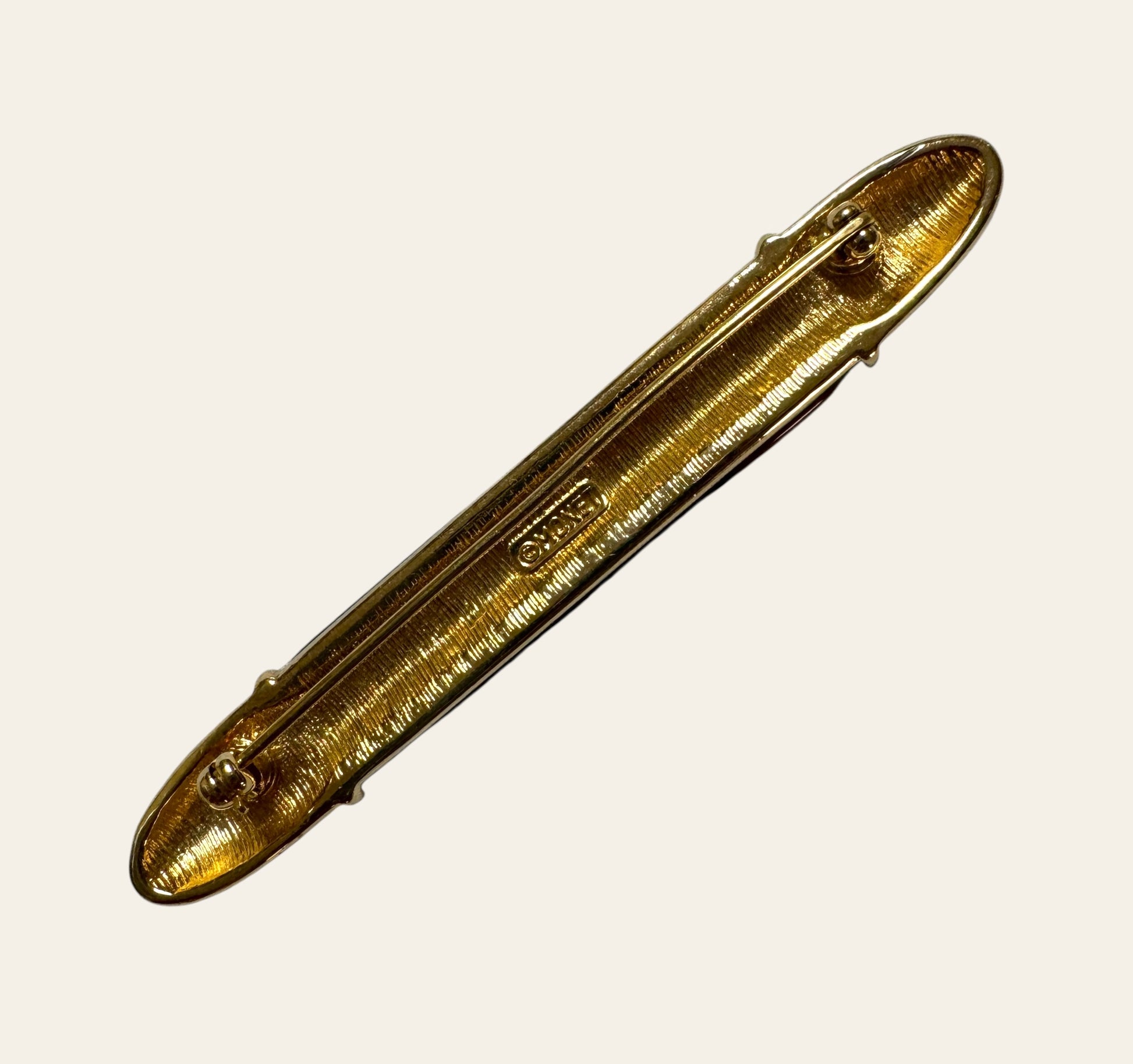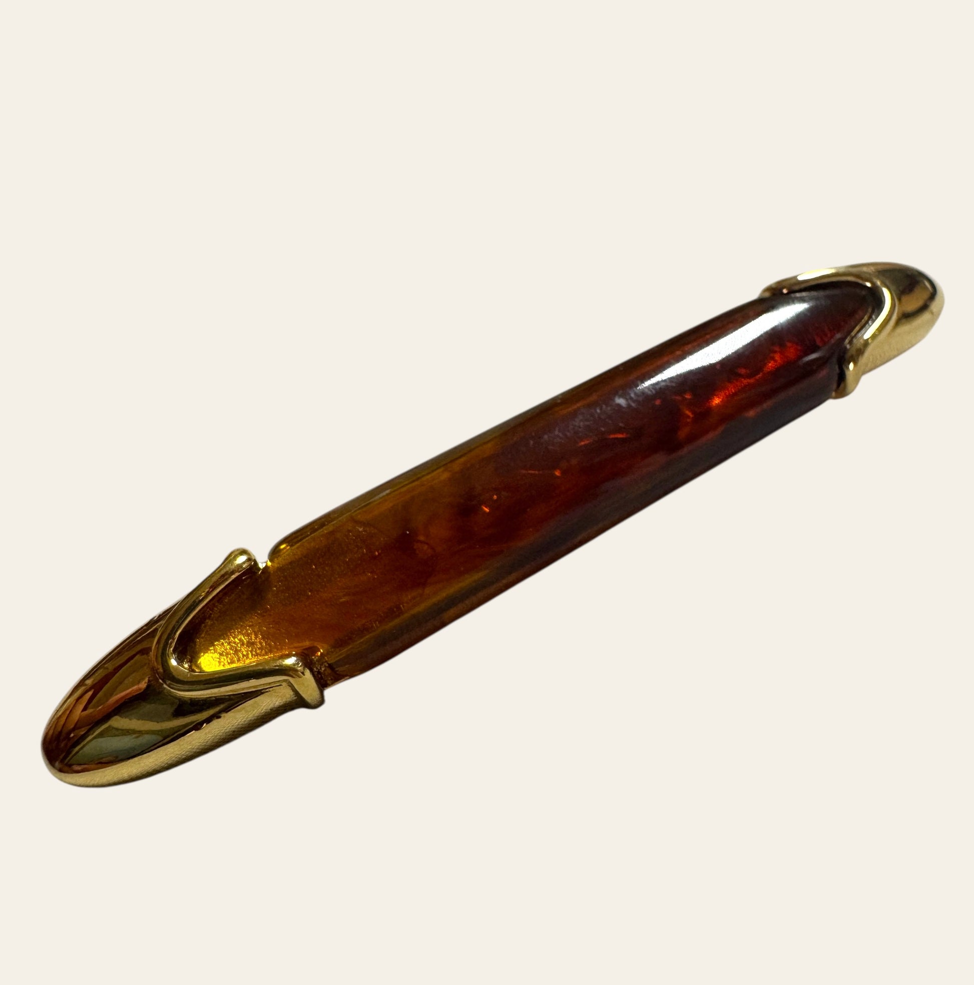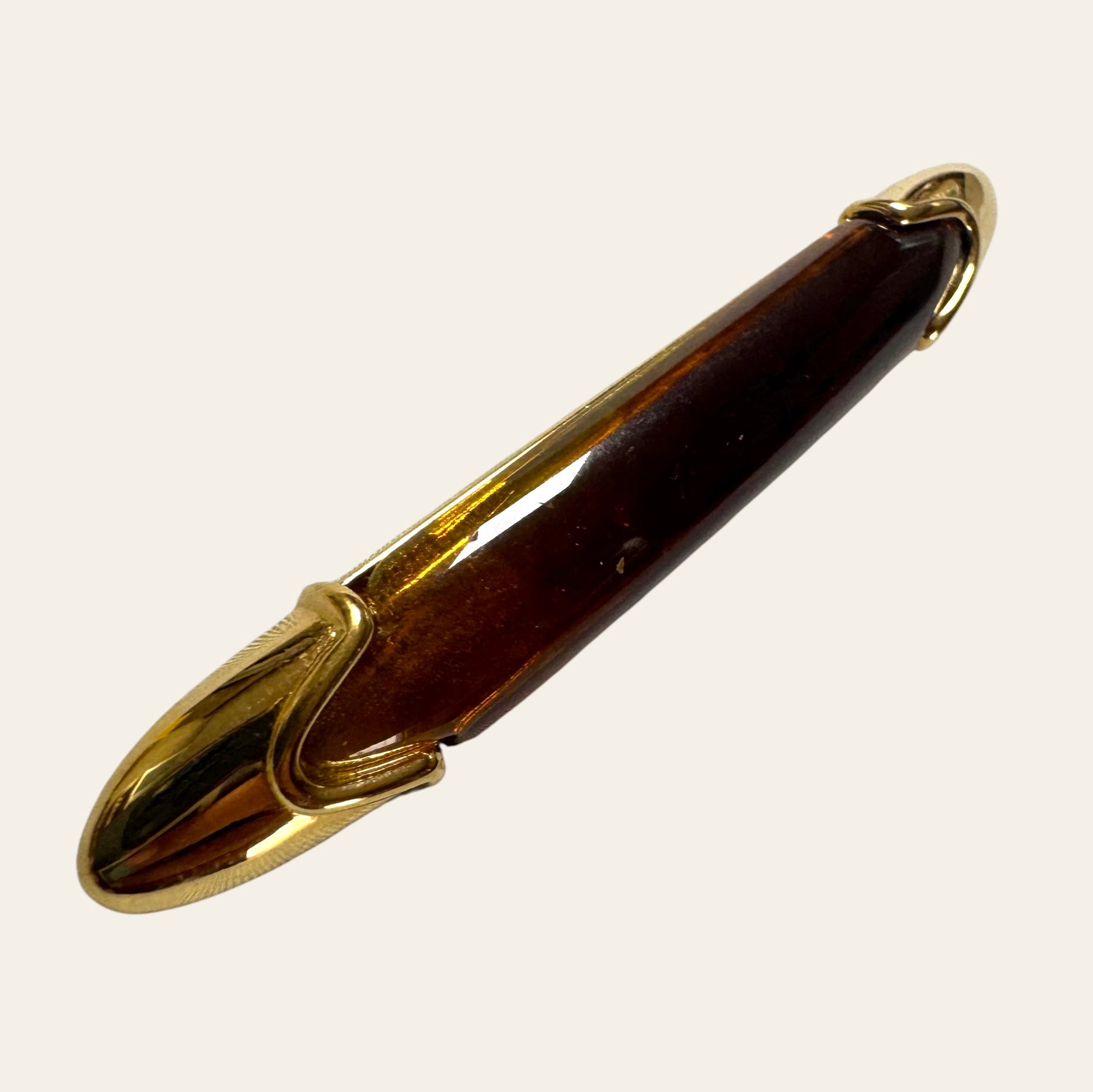 This sleek and sophisticated vintage Monet brooch features a stunning tortoise-colored lucite centerpiece set in a fluid, sculpted gold-tone frame. The lucite glows with deep brown, caramel, and honey tones, reminiscent of vintage tortoiseshell, but more translucent and dimensional. The gold frame wraps the form with architectural precision, clean, smooth, and subtly bold. Signed MONET on the back, this piece is a true nod to vintage elegance with a modernist edge. A Romy's fav!