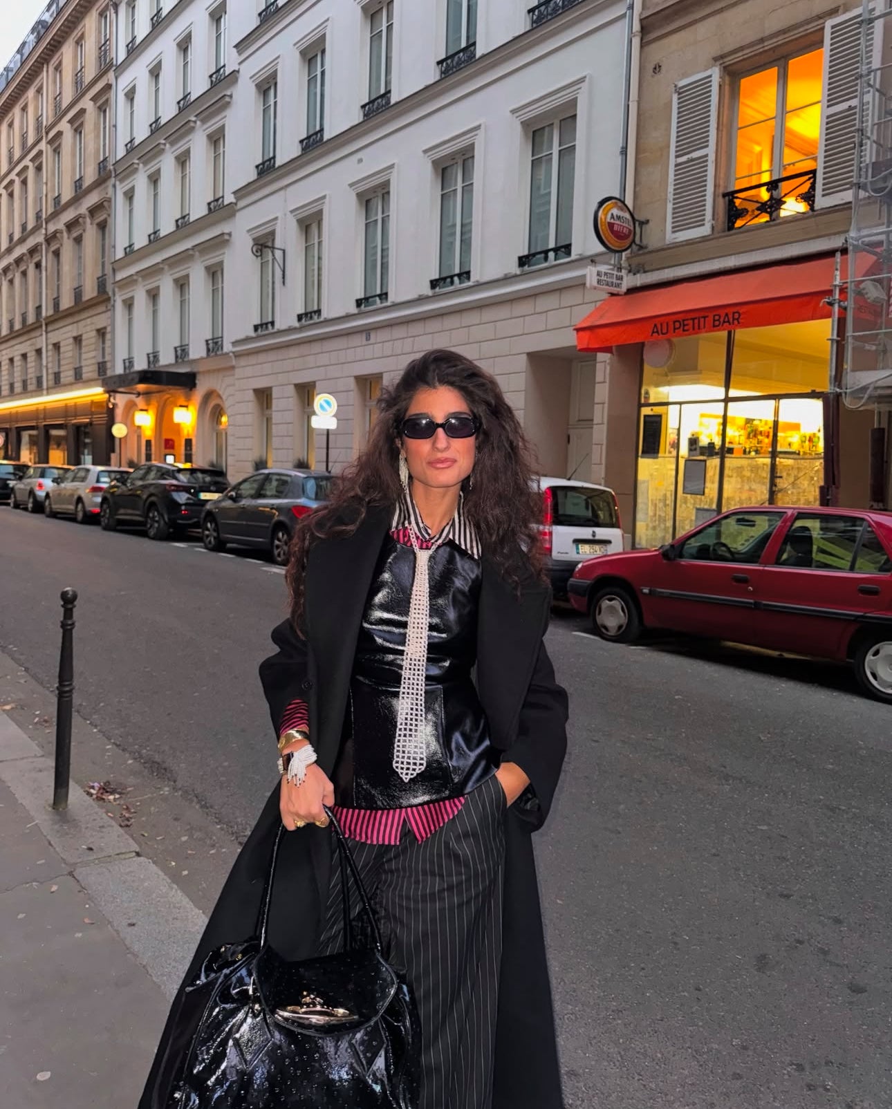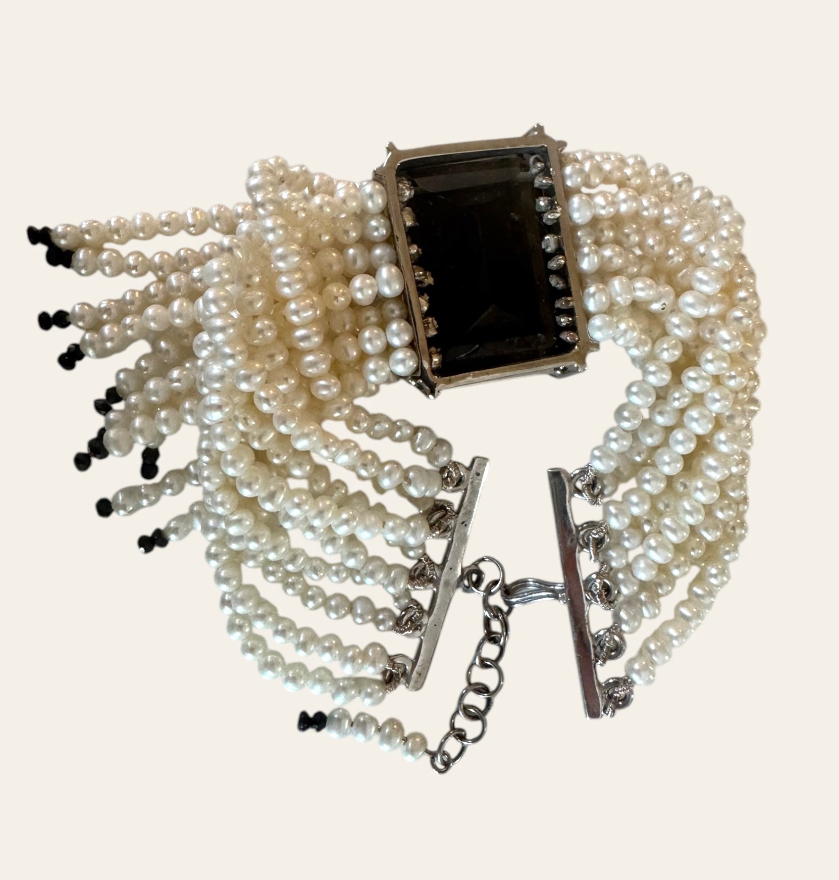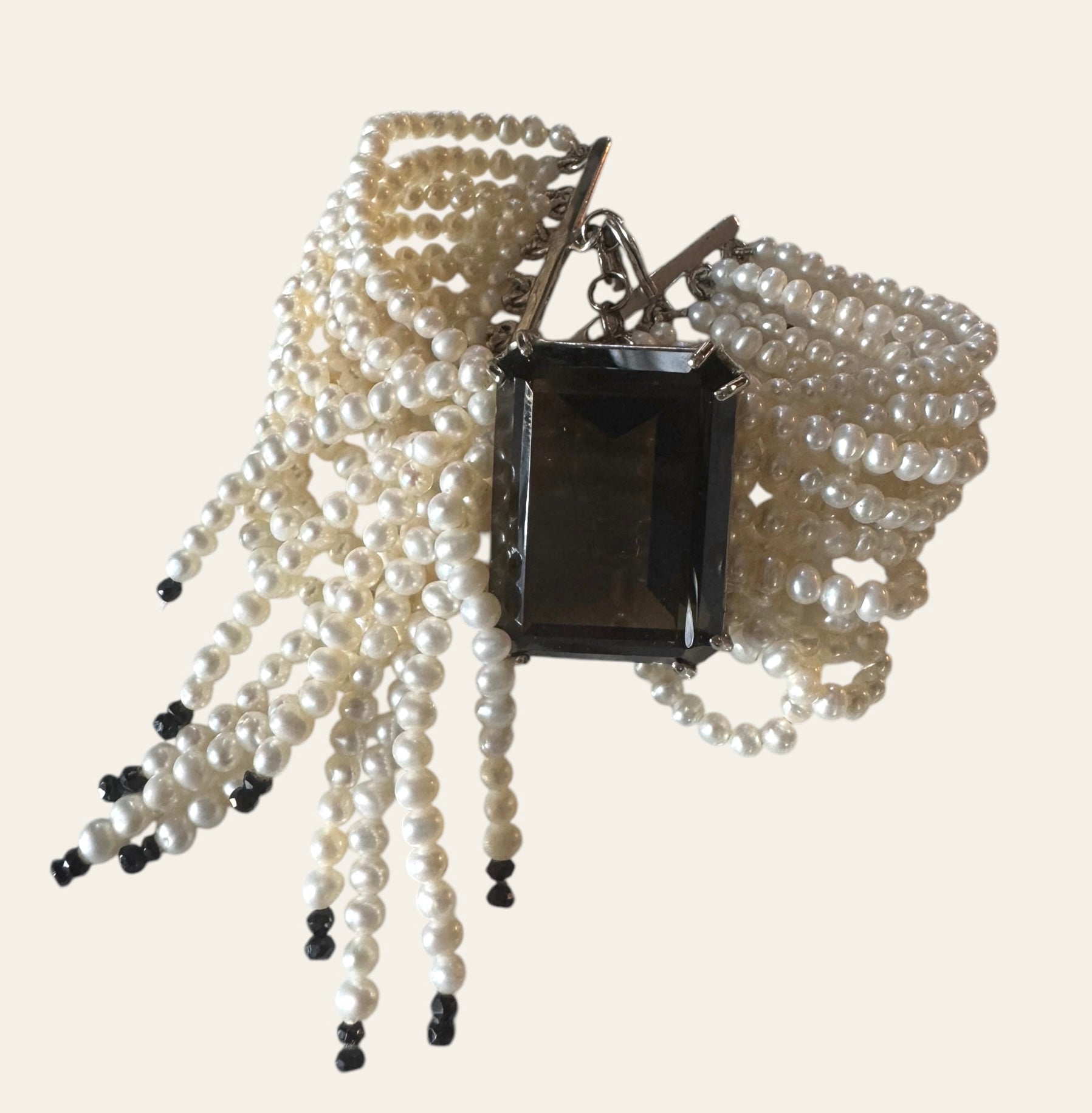 Please note that this is not a vintage item. It is designed by Romy. It features delicate strands of small, lustrous white pearls. The strands cascade outward, creating a luxurious, layered effect, with ends adorned by small black beads for added contrast and detail. The centrepiece is a striking, rectangular, faceted black precious smoky quartz-like stone set in a bold, silver tone prong setting, adding so much drama and sophistication. This is such a glamorous and classic all handworked piece.