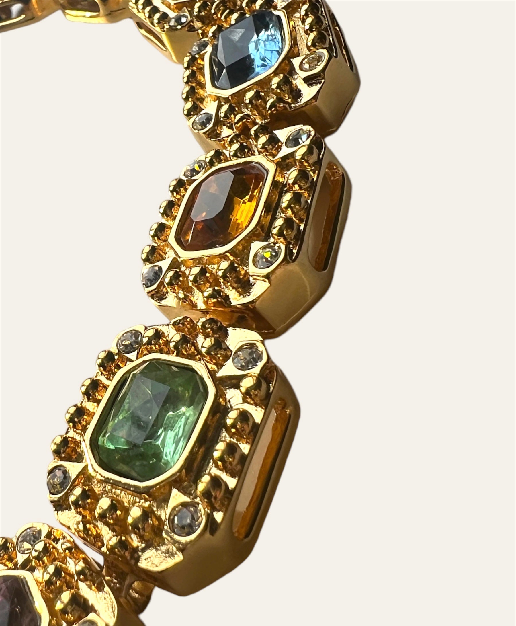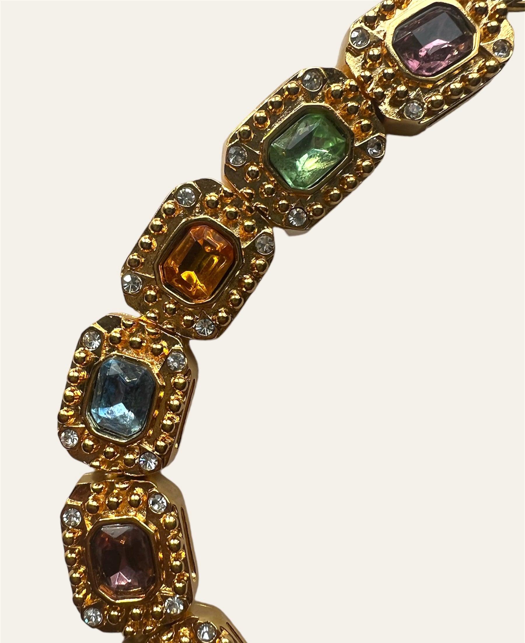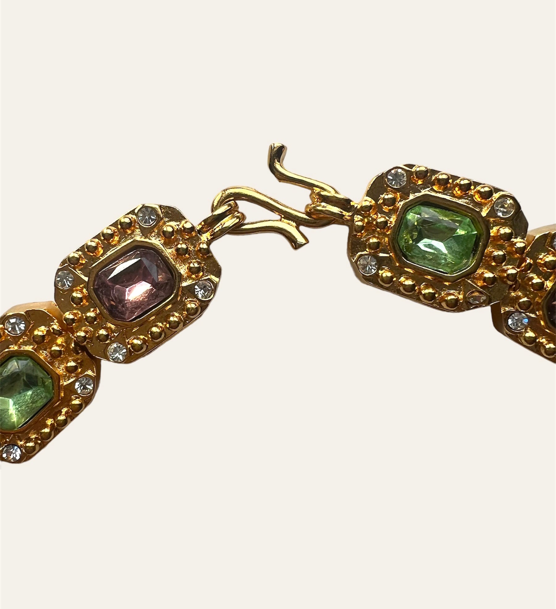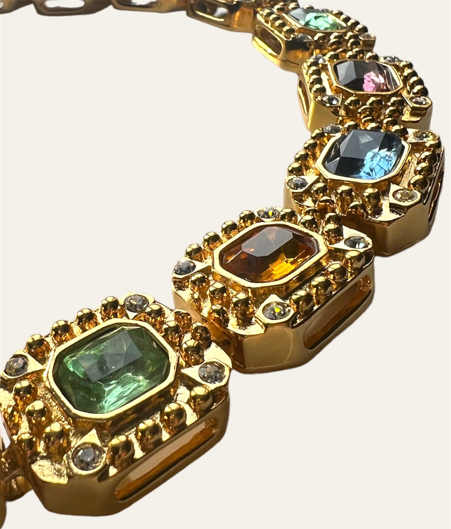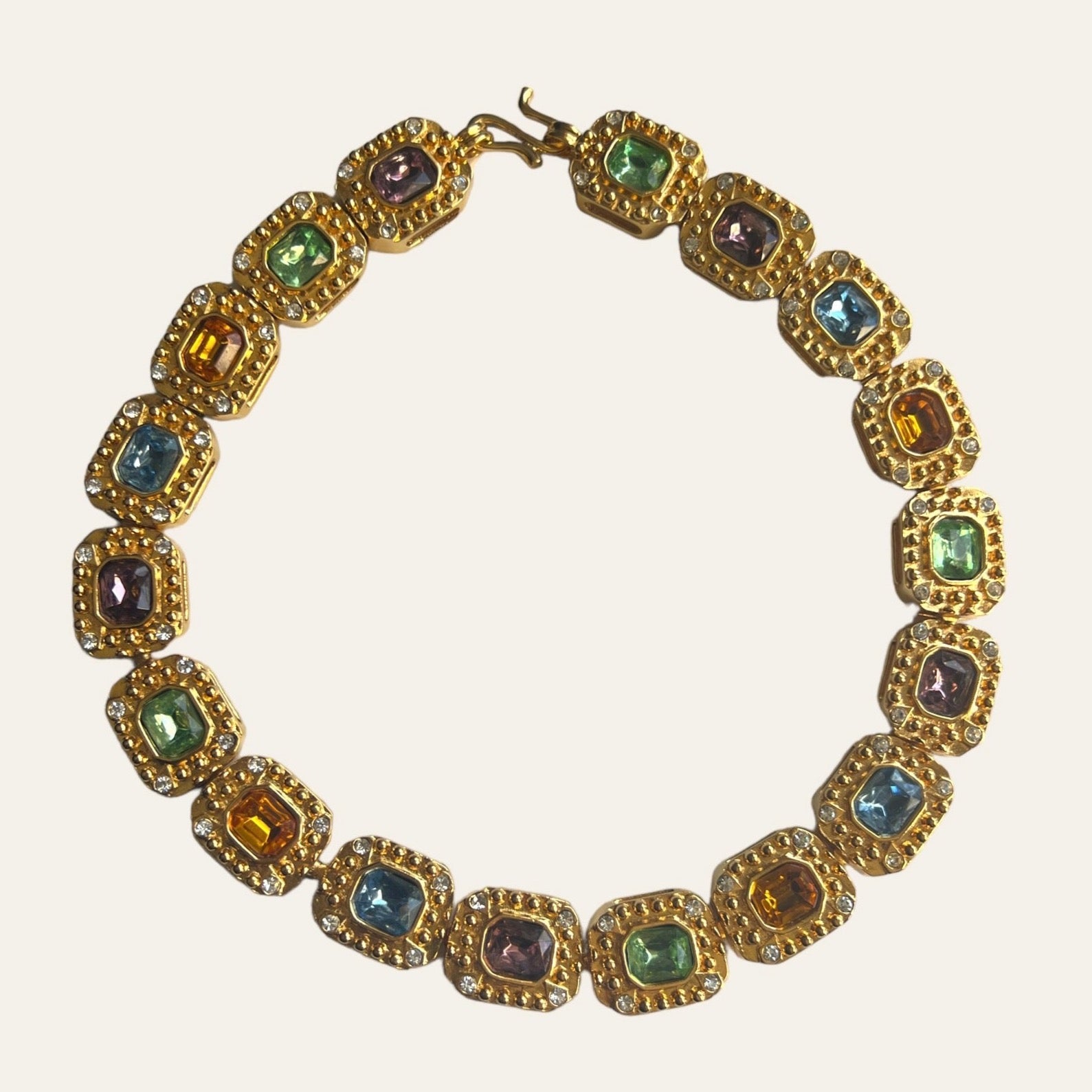 Unsigned statement necklace featuring stunning emerald cut crystals (1cmx1.3cm) bezel set into a satin gold tone metal. Their colours are blue topaz, amethyst, peridot, intense pink, and golden topaz. Around the crystals, there is a set of pretty caviar beading and a round faceted clear rhinestone in each corner of each panel. It is a beautiful necklace that got a lot of attention and will make you feel like royalty.