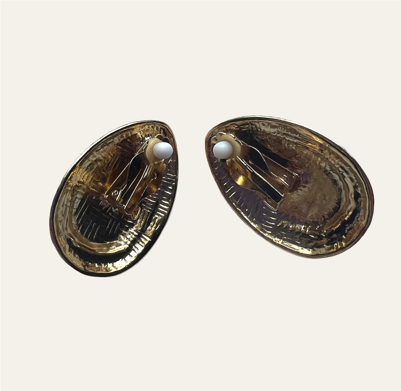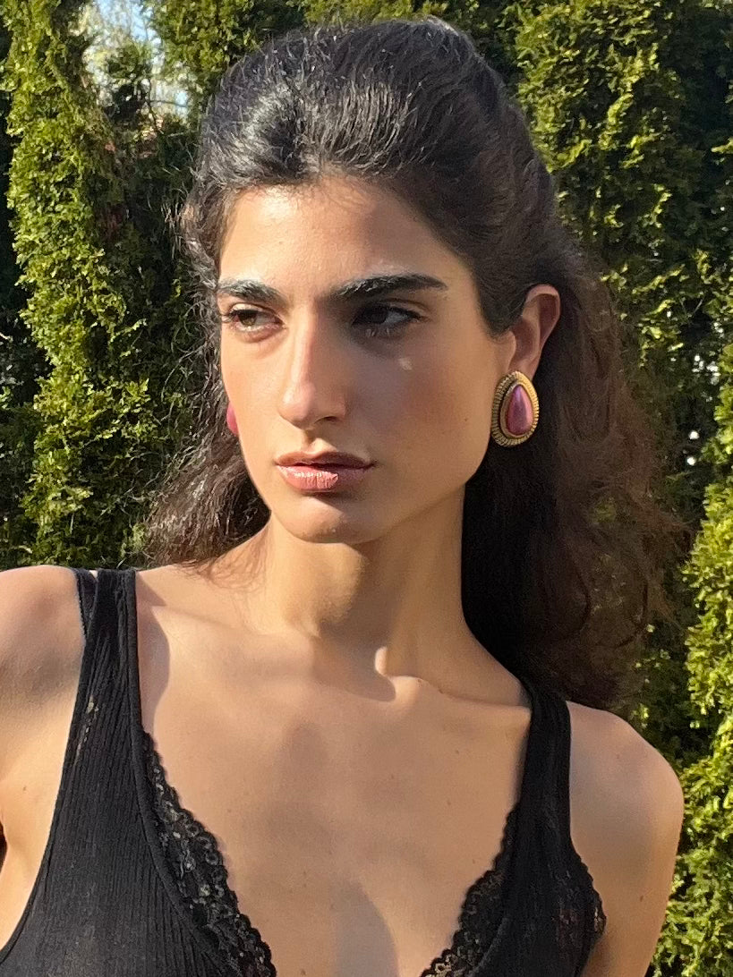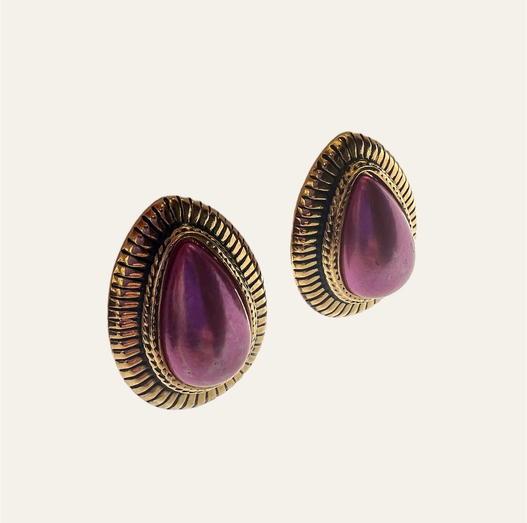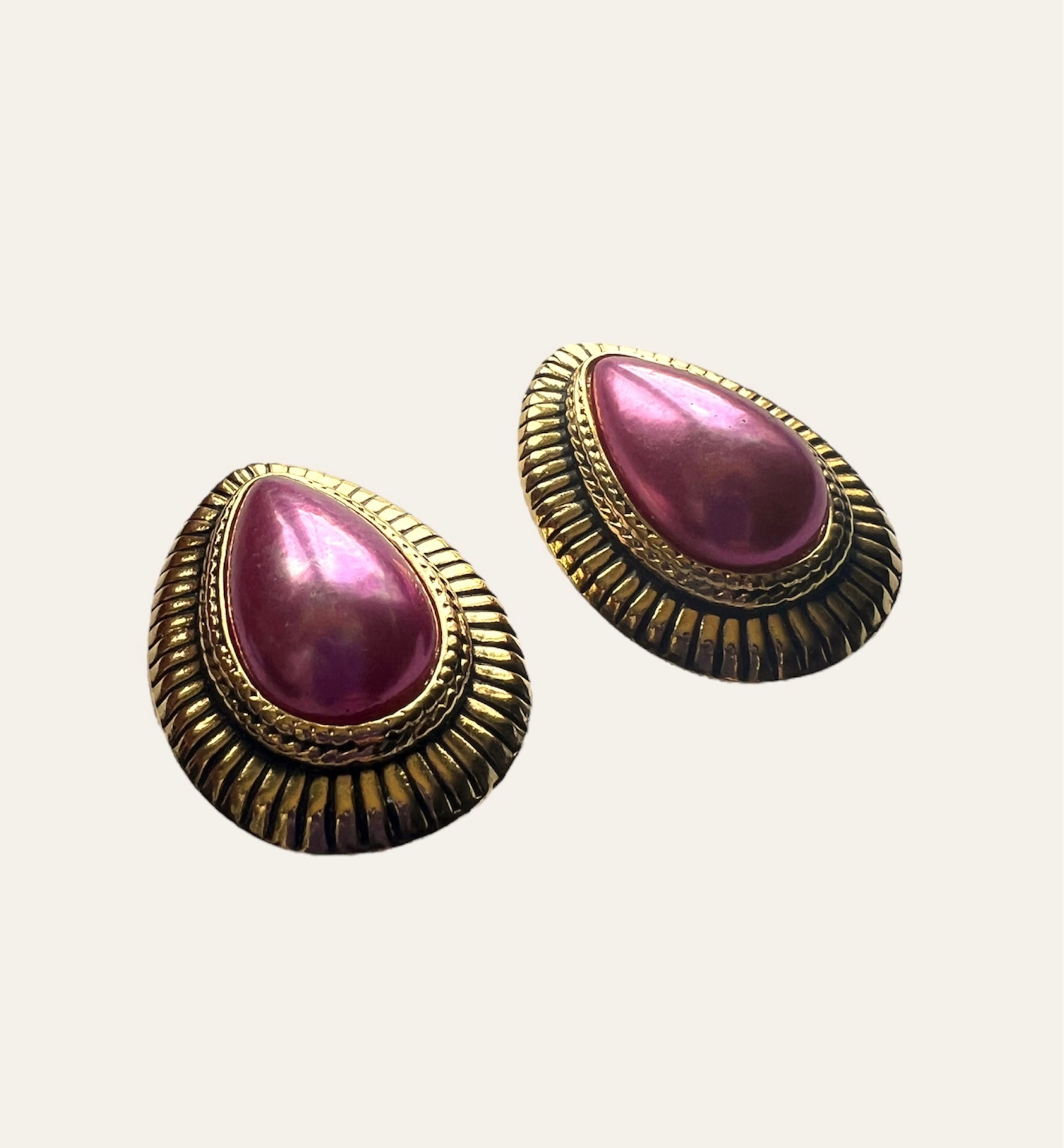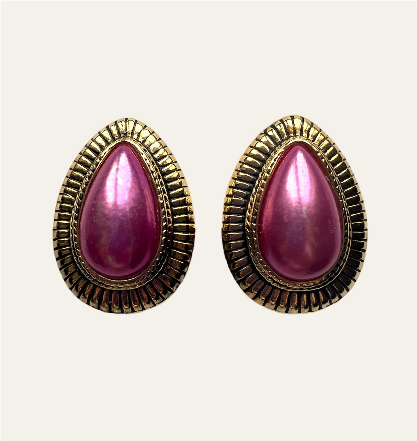 1980's chic teardrop faux pearl earrings with a textured gold tone metal. The shade of pink is just stunning!