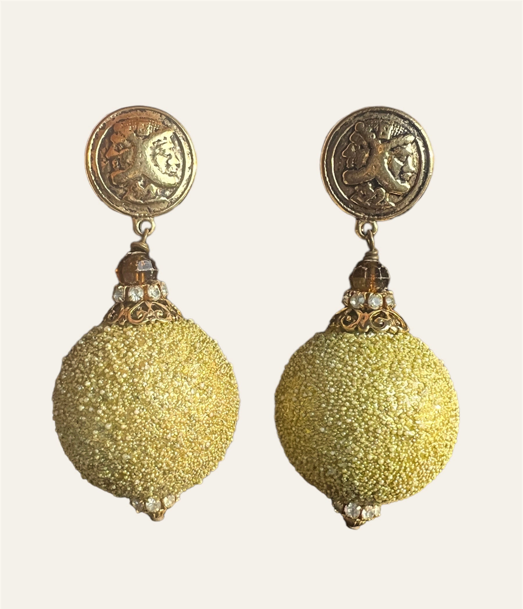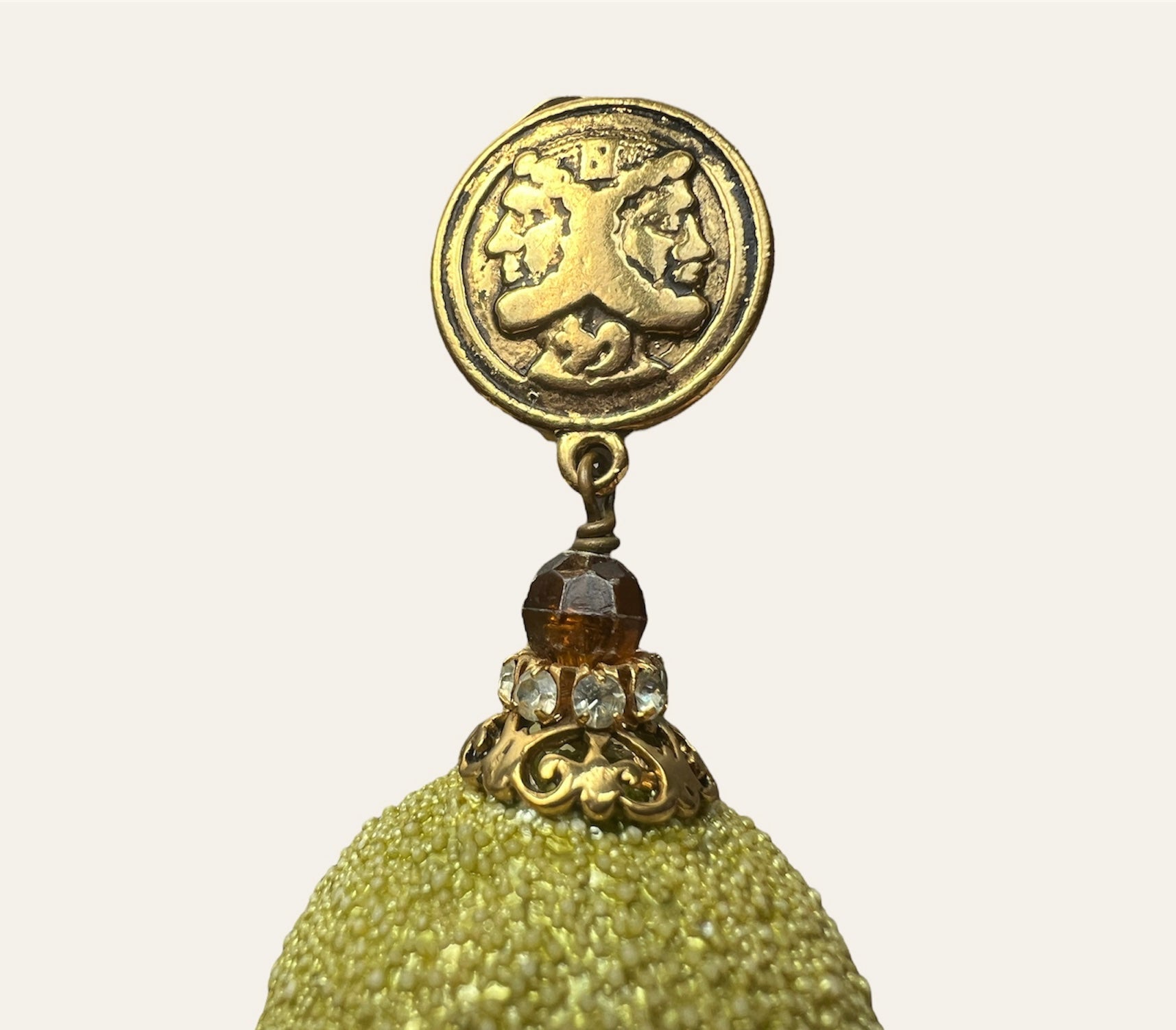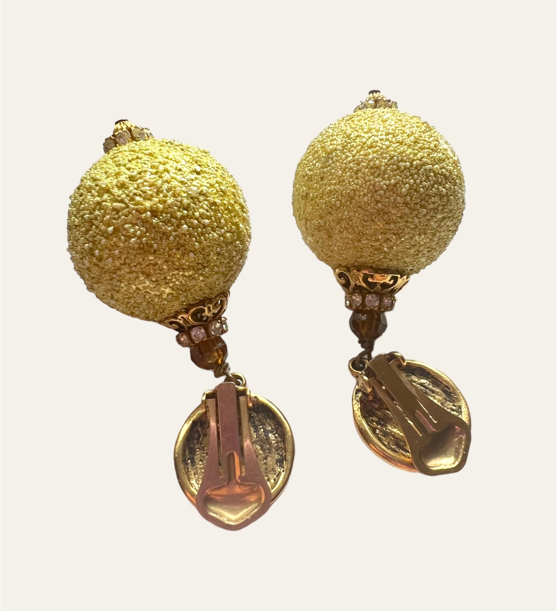 Dazzling bauble earrings with texture shiny rich gold tone clips, clear rhinestones, and brown beads. The details are amazing. They have this beautiful light pistachio green colour and they are large - a fabulous summer piece!