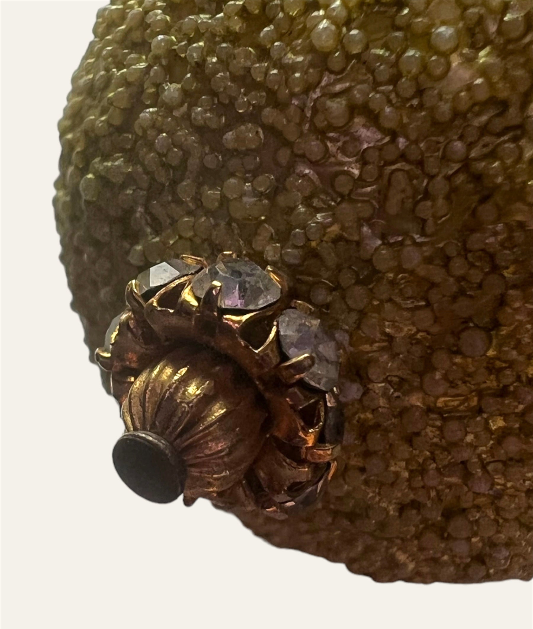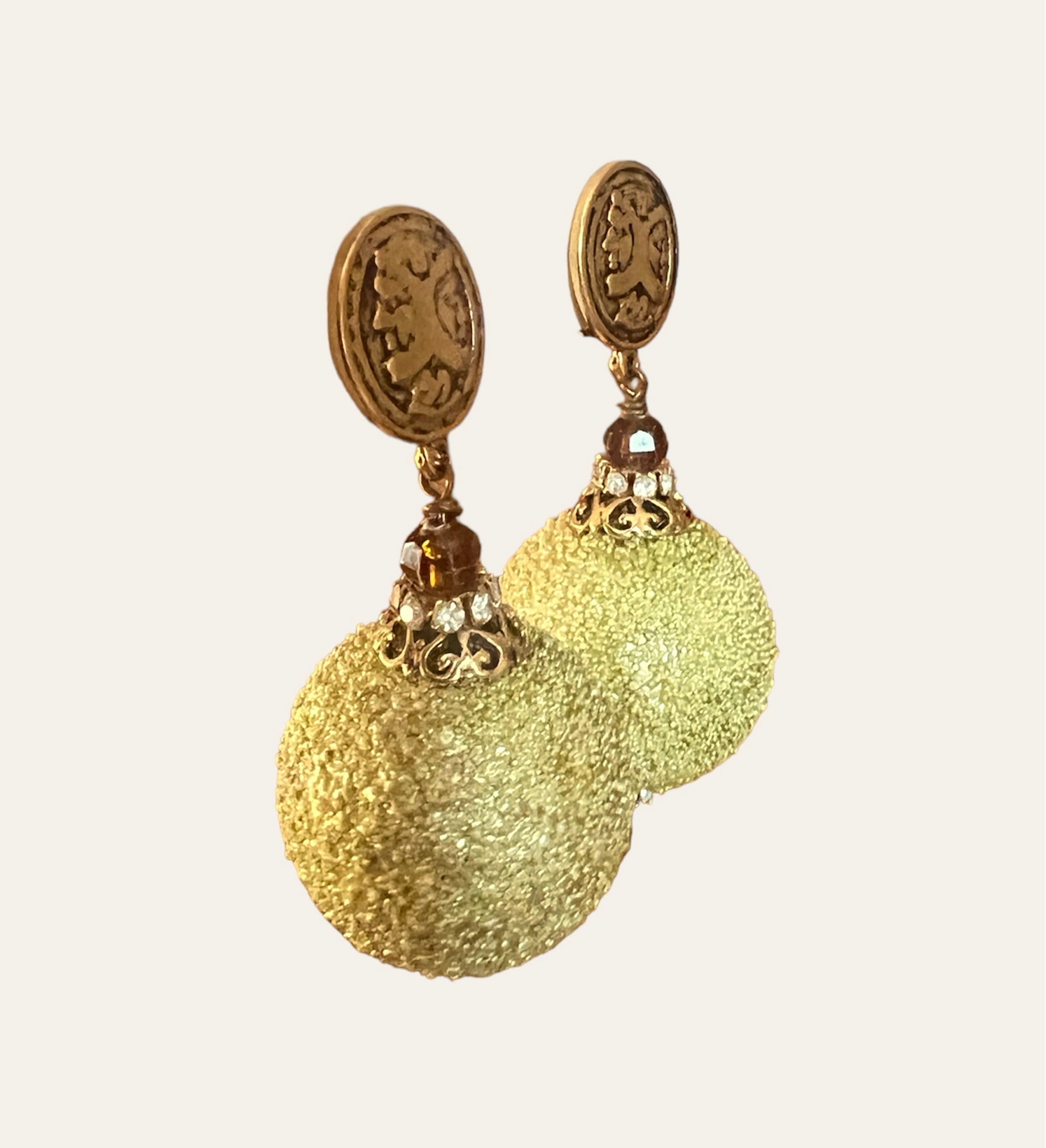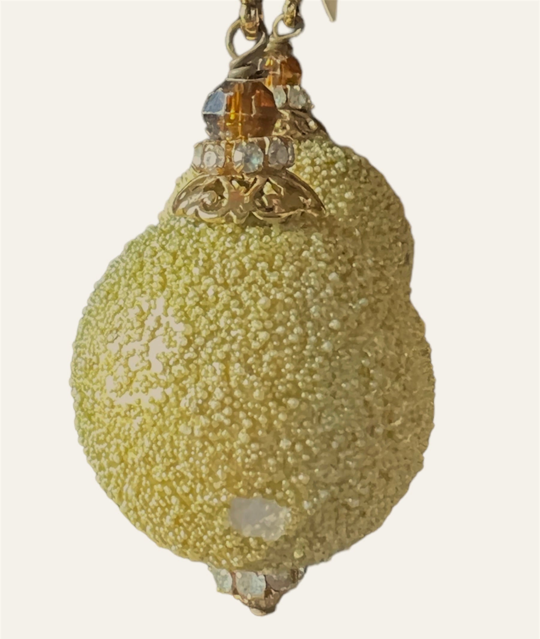 Dazzling bauble earrings with texture shiny rich gold tone clips, clear rhinestones, and brown beads. The details are amazing. They have this beautiful light pistachio green colour and they are large - a fabulous summer piece!