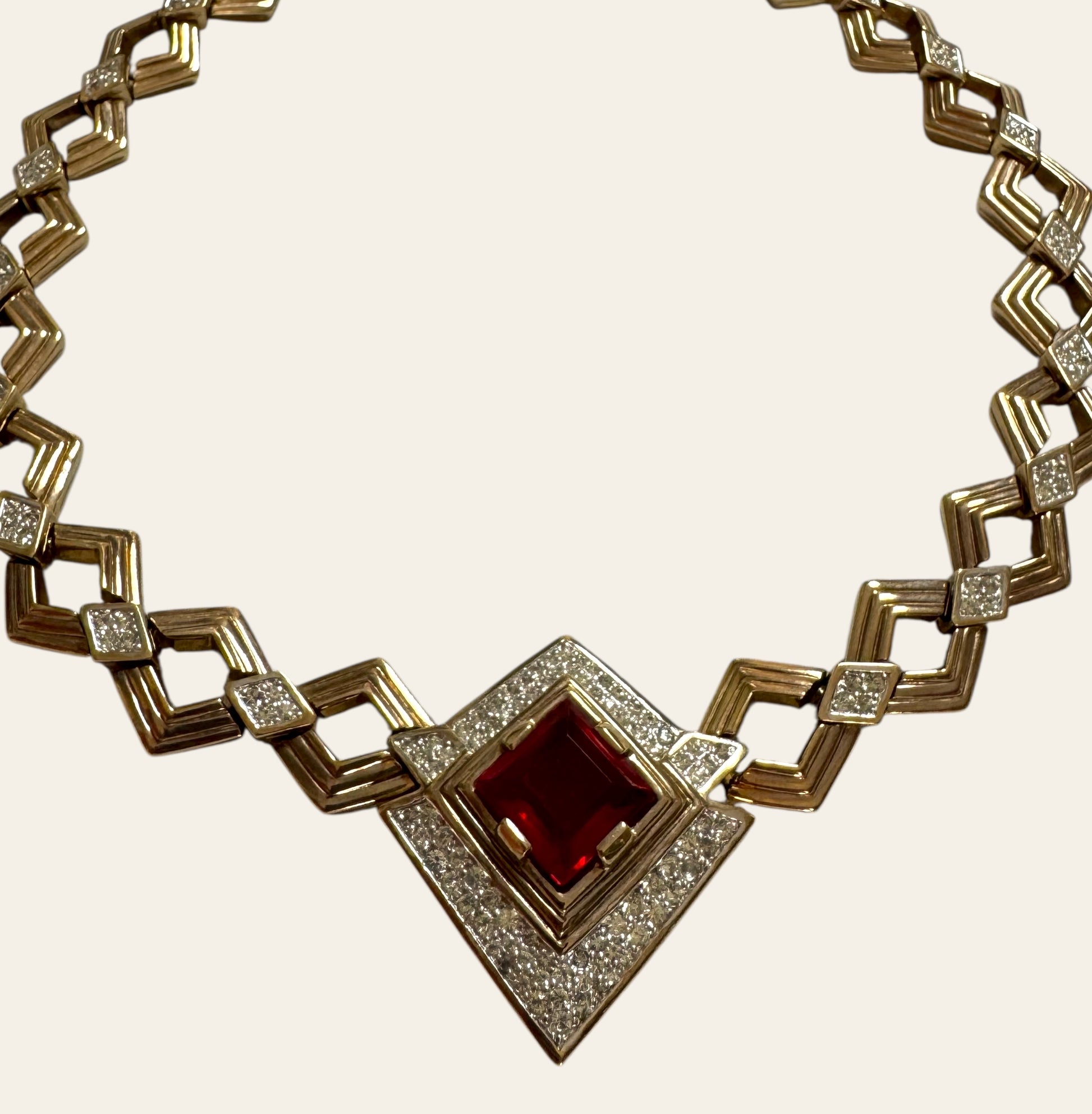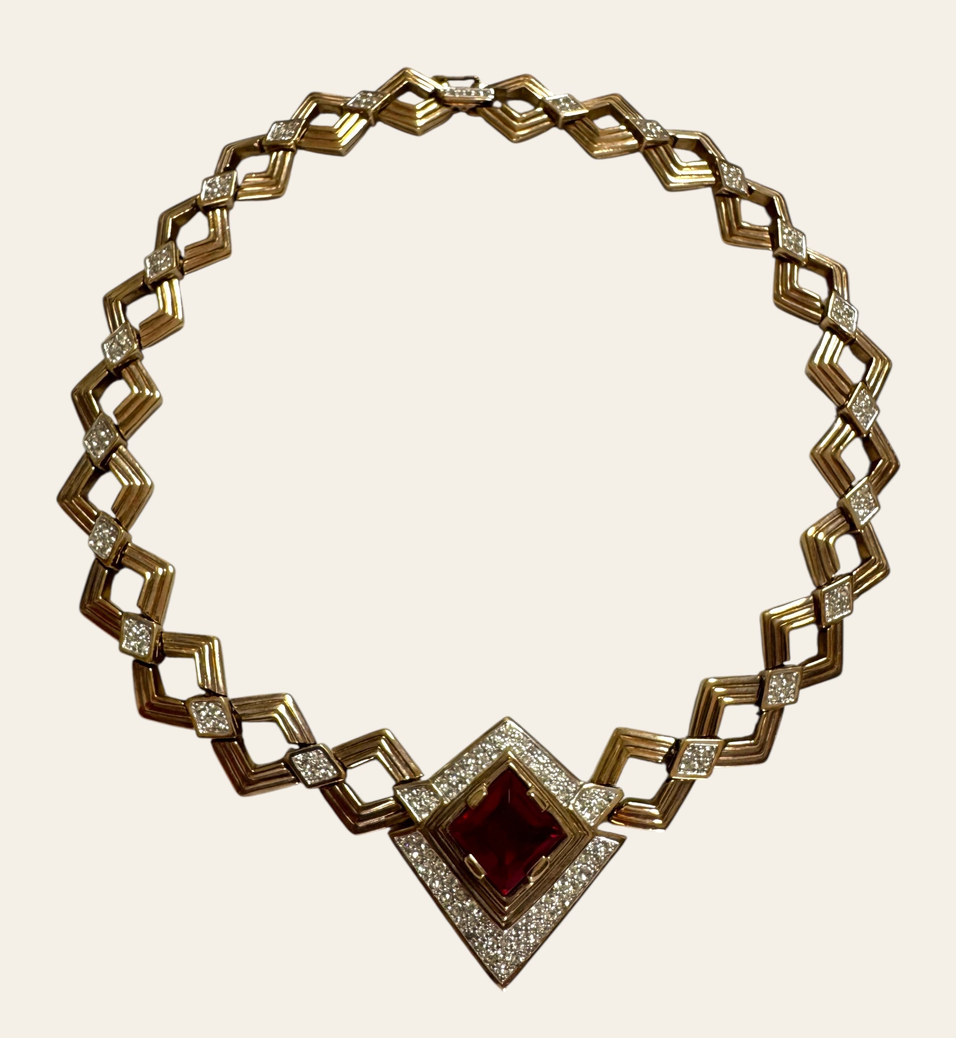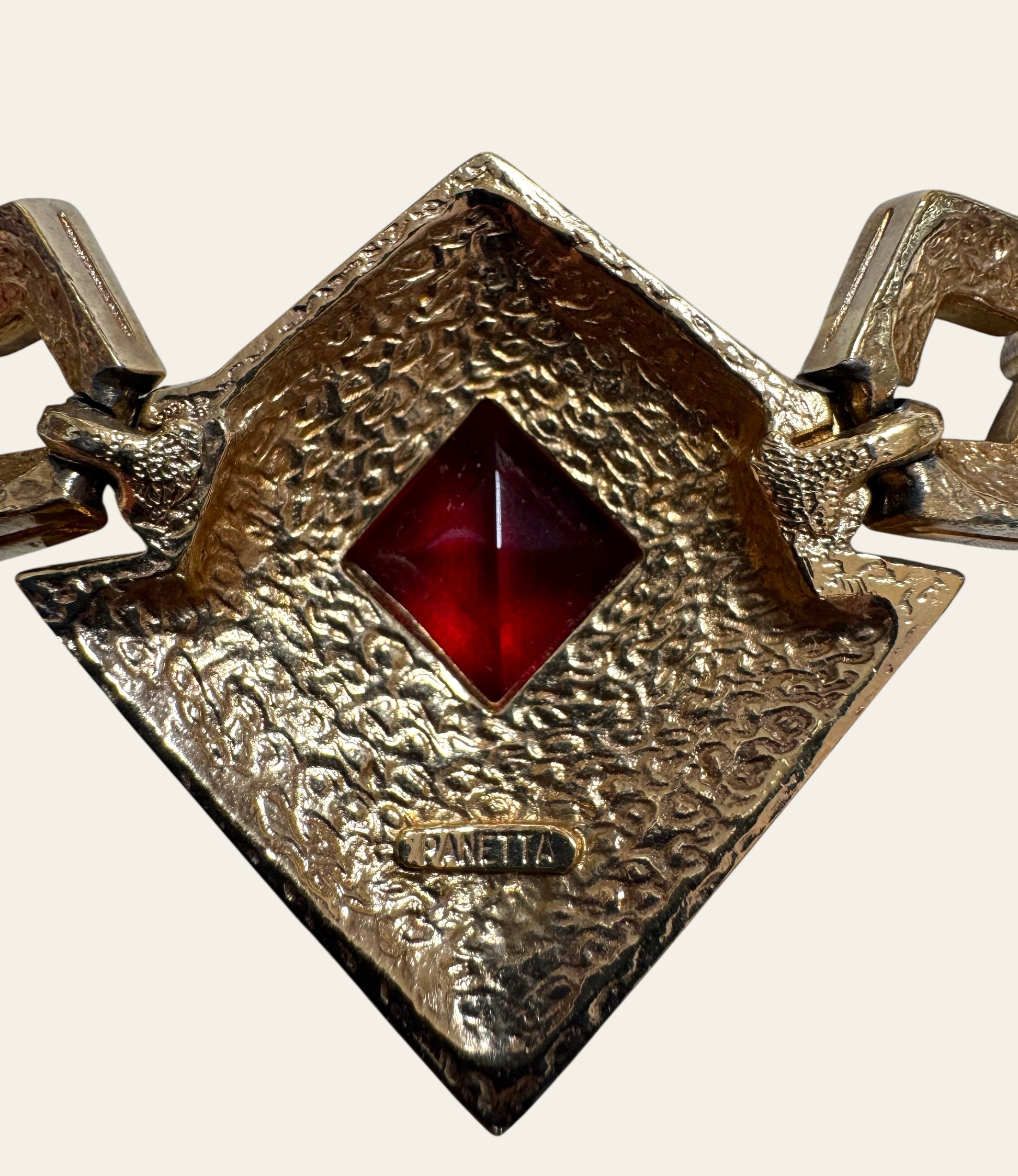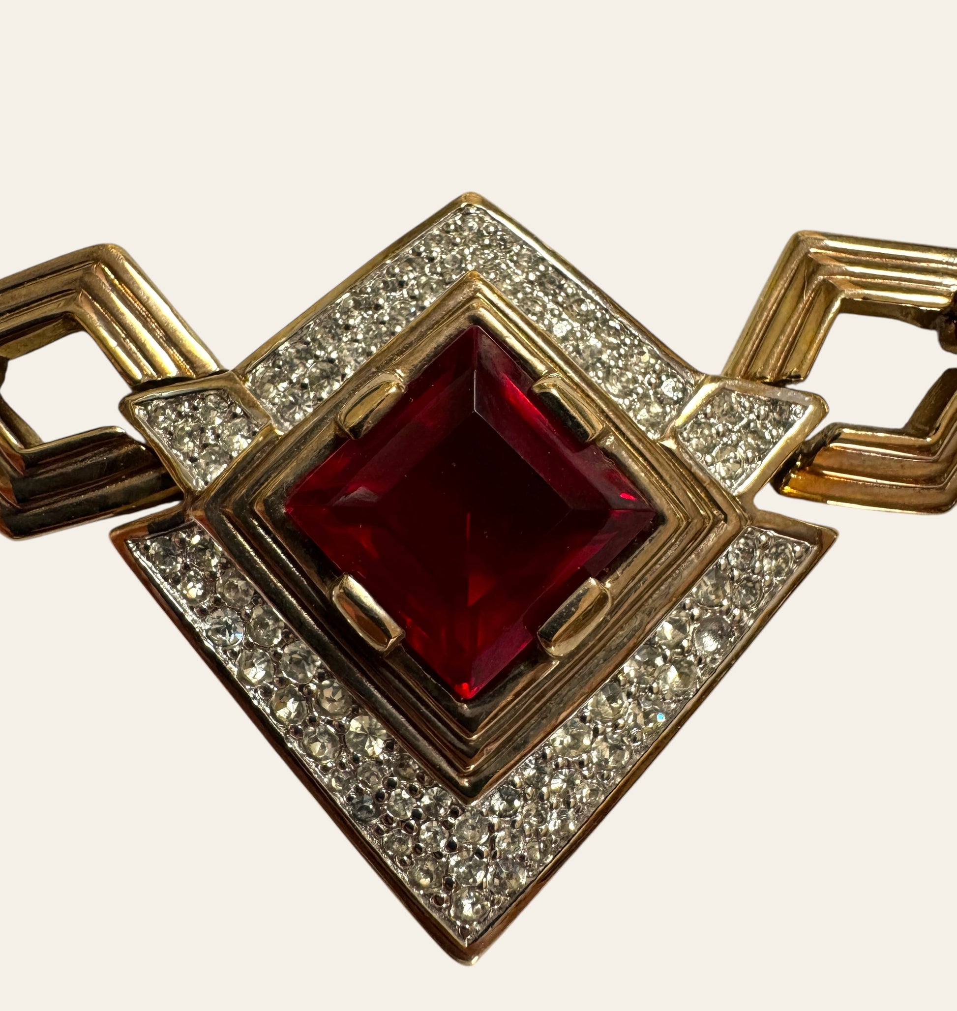 A rare and exquisite signed piece by Panetta, this necklace embodies the brand’s reputation for high-end craftsmanship and timeless glamour. Its geometric link design, plated in rich gold tones, is punctuated by pavé-set crystals for a brilliant sparkle. The centerpiece features a striking square-cut ruby red stone, framed by double layers of pavé crystal accents arranged in bold Art Deco-inspired lines. A true collector’s treasure, this necklace channels vintage Hollywood opulence and modern architectural elegance in equal measure. A Romy's fav!