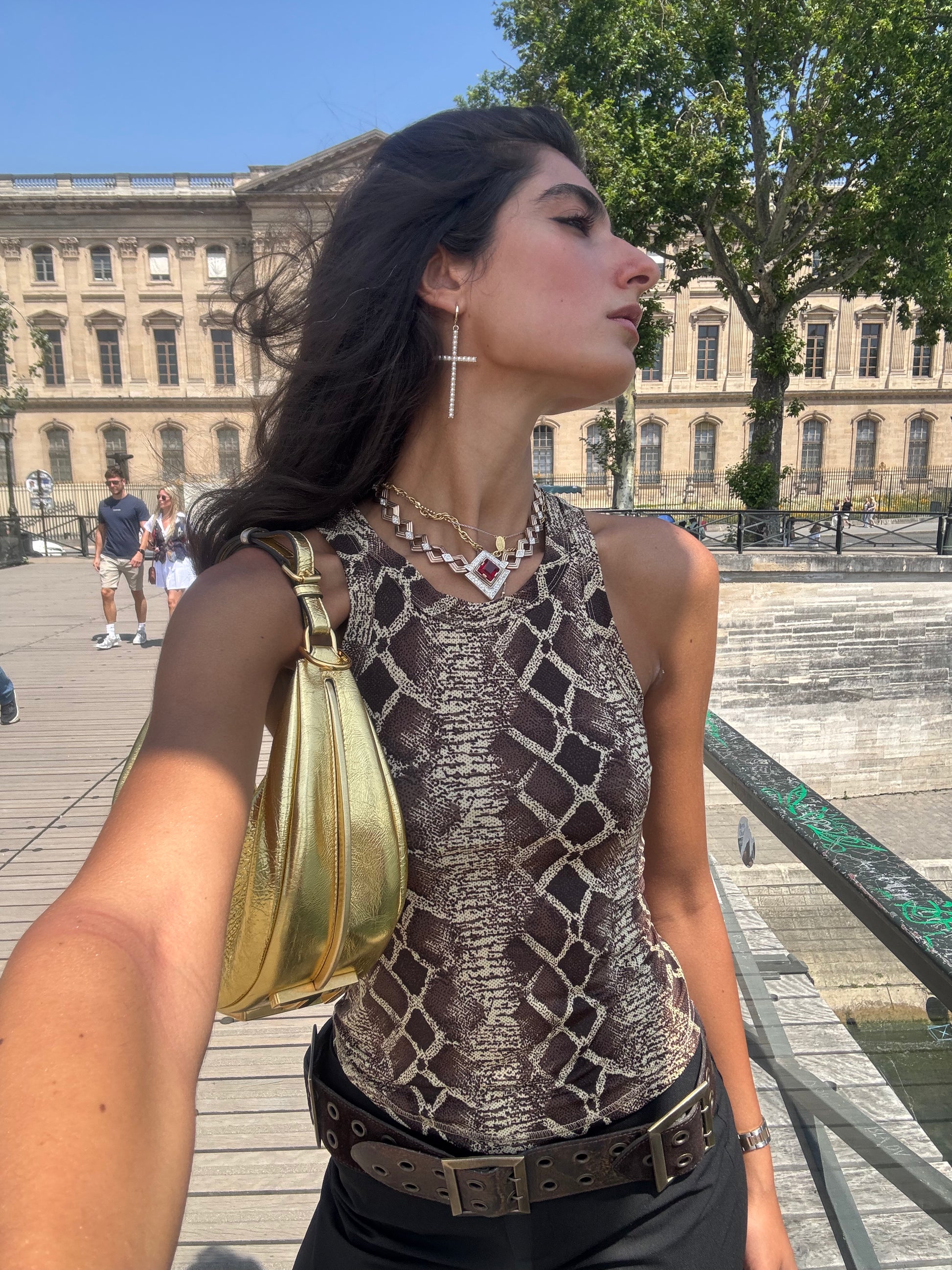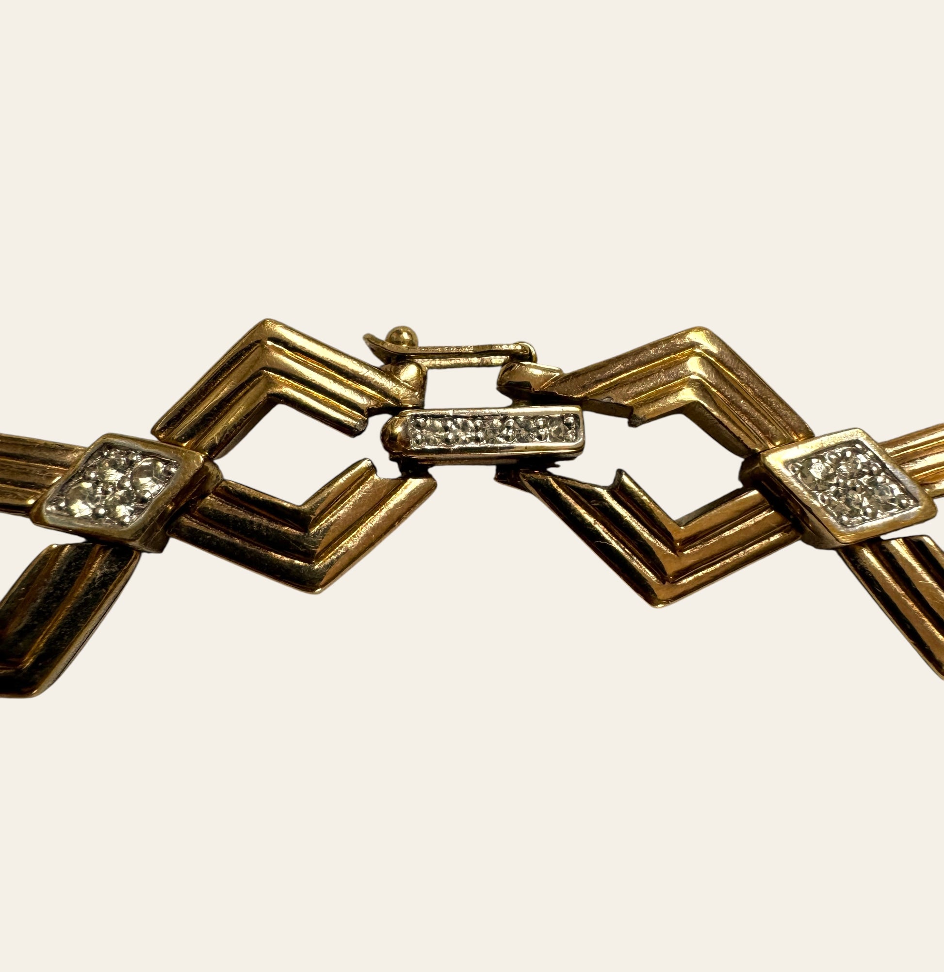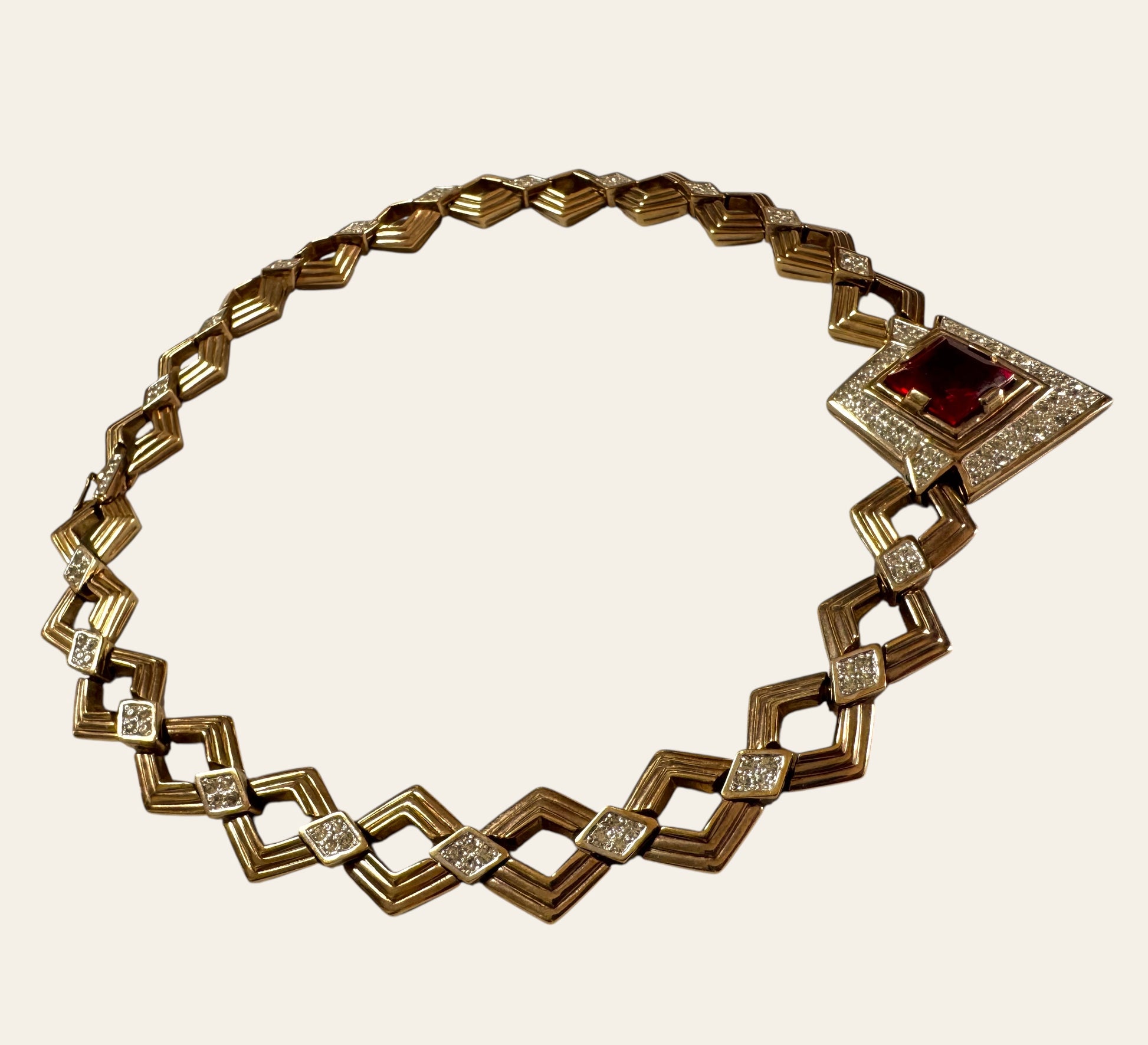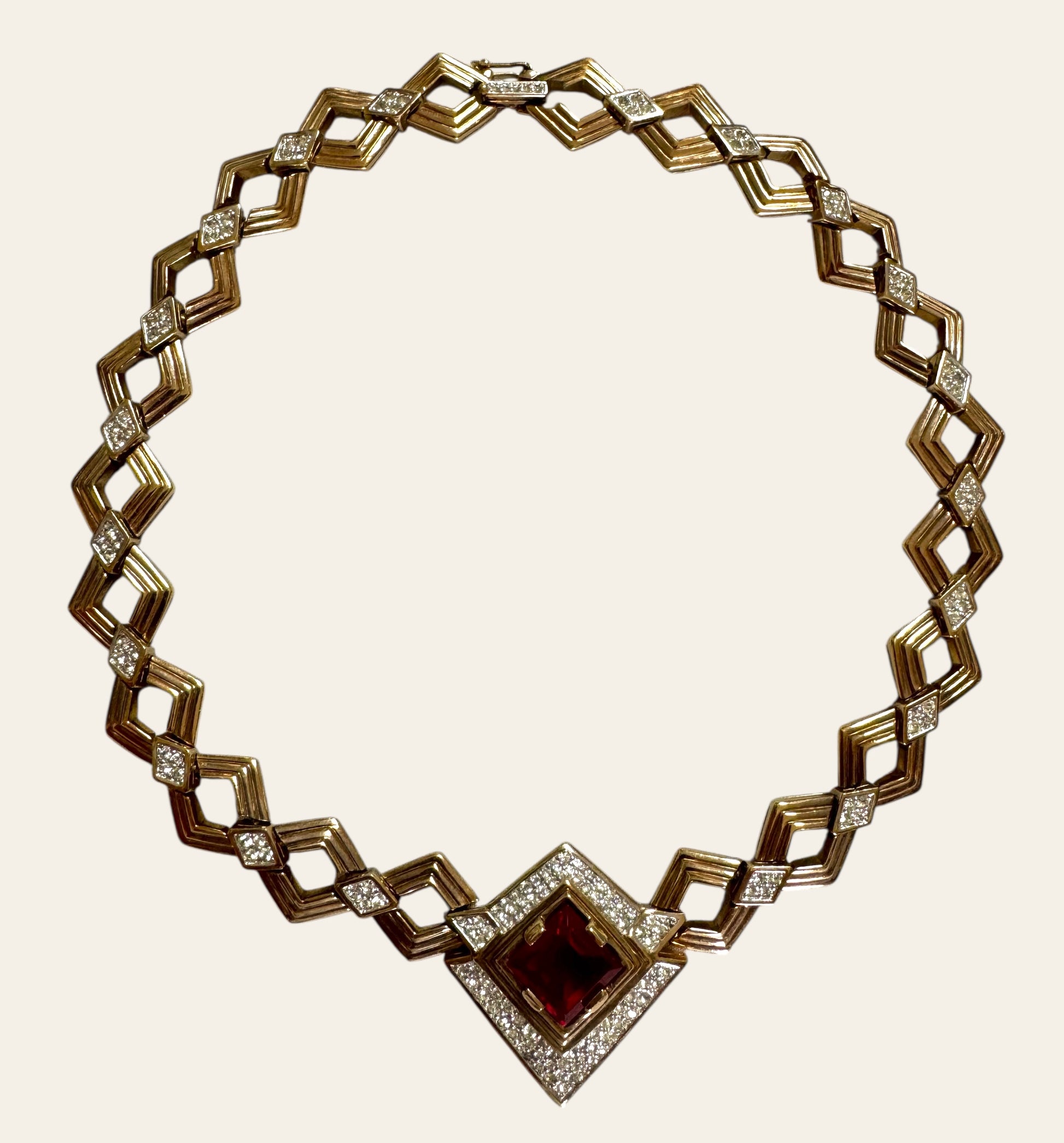 A rare and exquisite signed piece by Panetta, this necklace embodies the brand’s reputation for high-end craftsmanship and timeless glamour. Its geometric link design, plated in rich gold tones, is punctuated by pavé-set crystals for a brilliant sparkle. The centerpiece features a striking square-cut ruby red stone, framed by double layers of pavé crystal accents arranged in bold Art Deco-inspired lines. A true collector’s treasure, this necklace channels vintage Hollywood opulence and modern architectural elegance in equal measure. A Romy's fav!