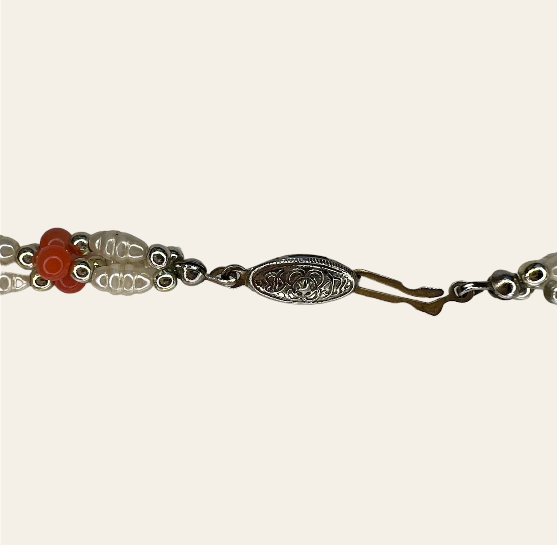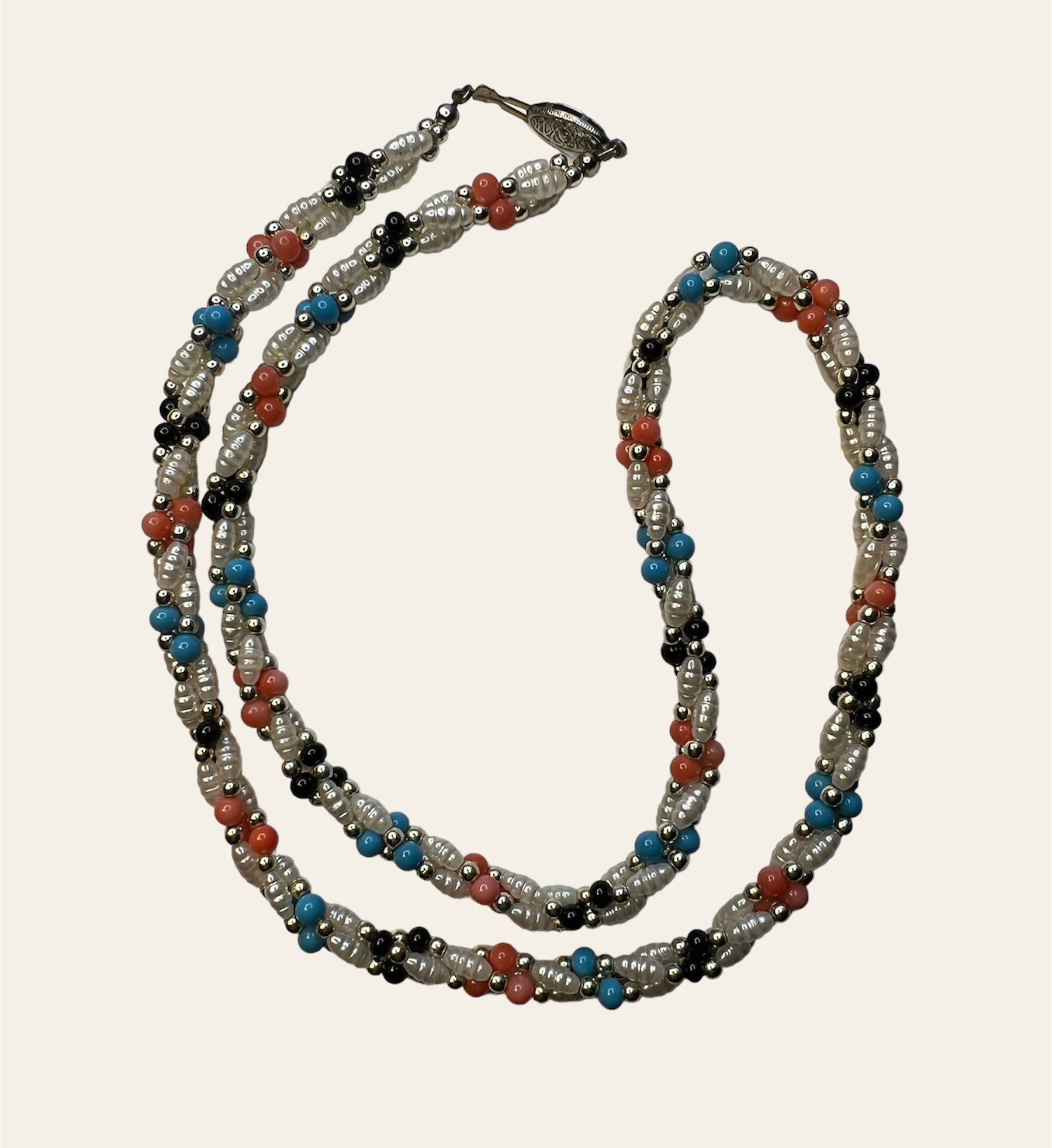 Vintage long necklace with white, blue, pink, and silver beads. It is so elegant. It has a pretty silver toned clasp.