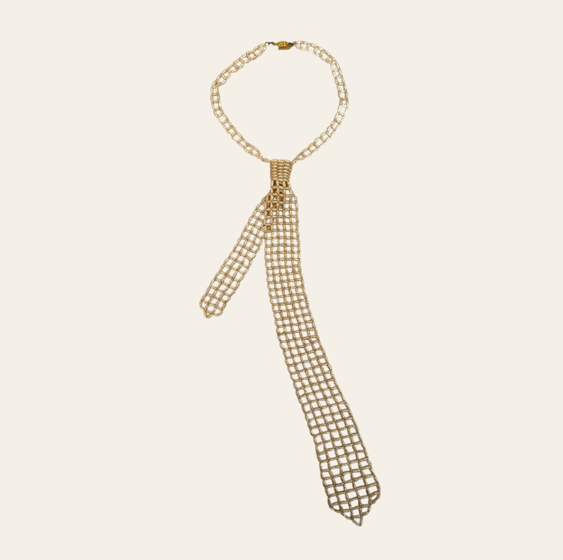 This piece blurs the line between jewelry and fashion — meticulously woven by hand. The craftsmanship reveals an artisan’s touch, every bead linked with precision to create that soft, fluid drape reminiscent of 1980s avant-garde Italian design.