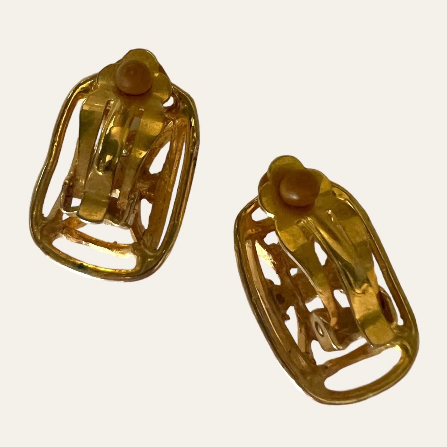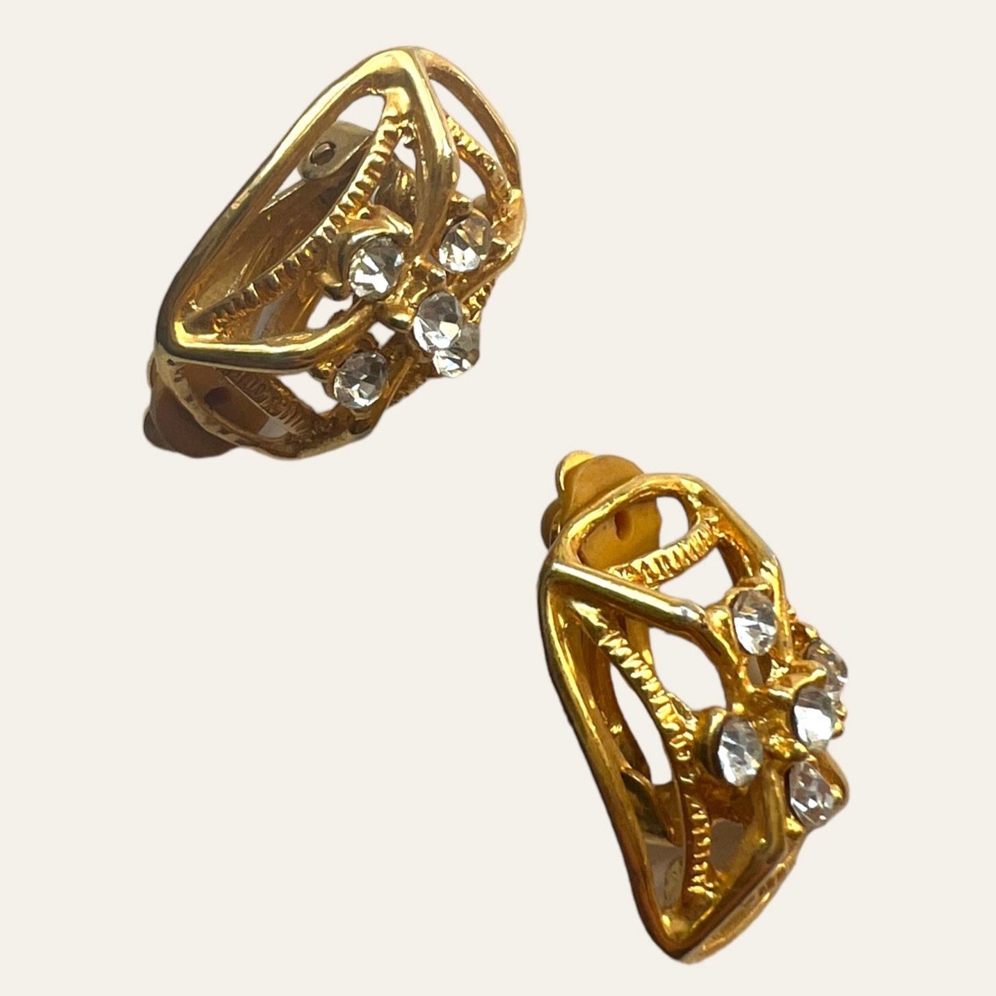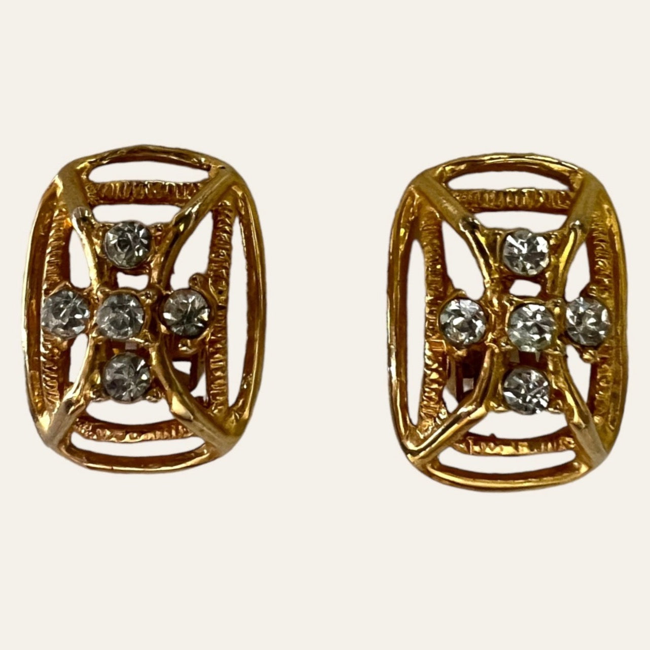 Petites high quality rectangular domed earrings in a rich gold tone featuring a Cross made of clear rhinestones.
