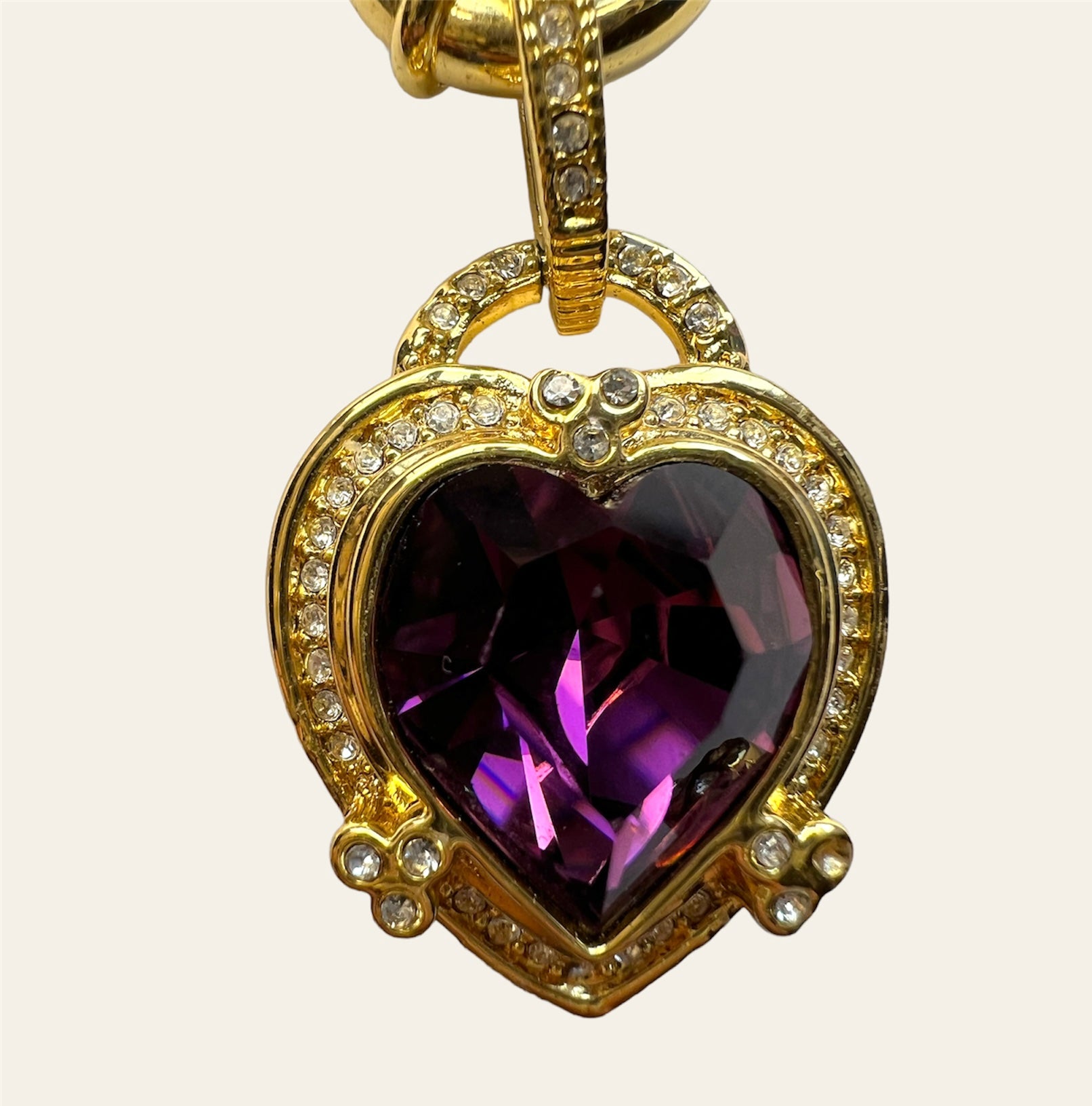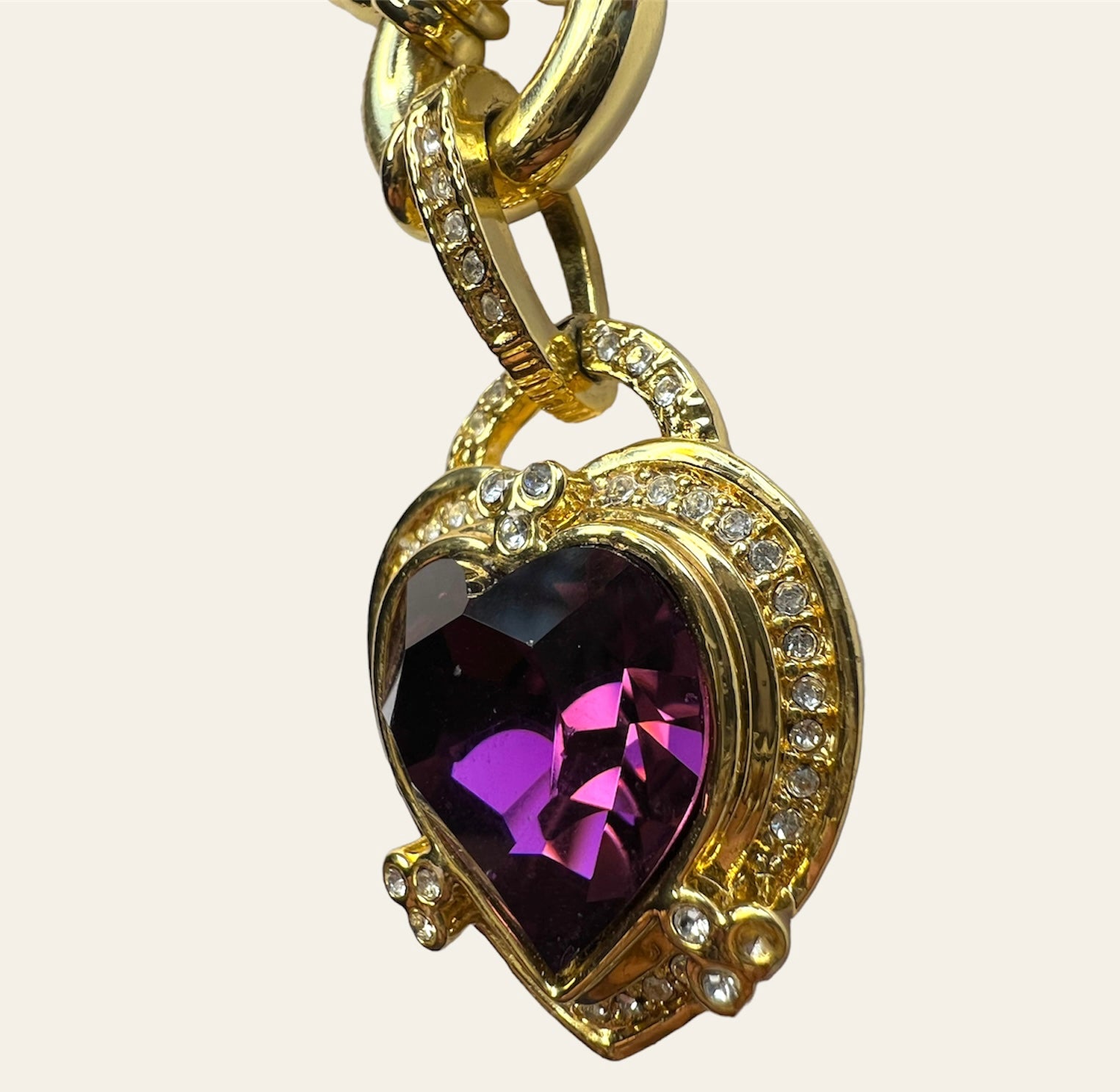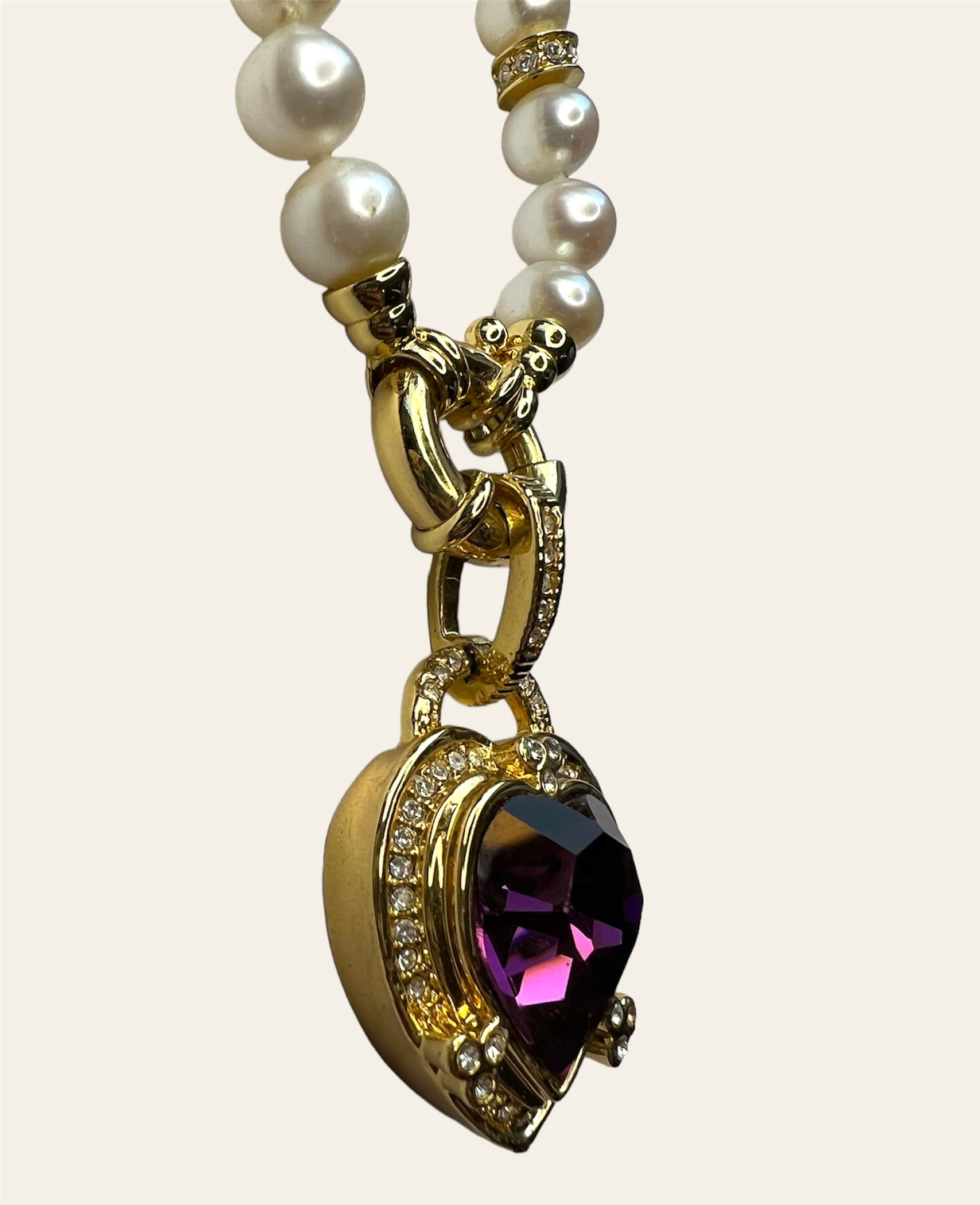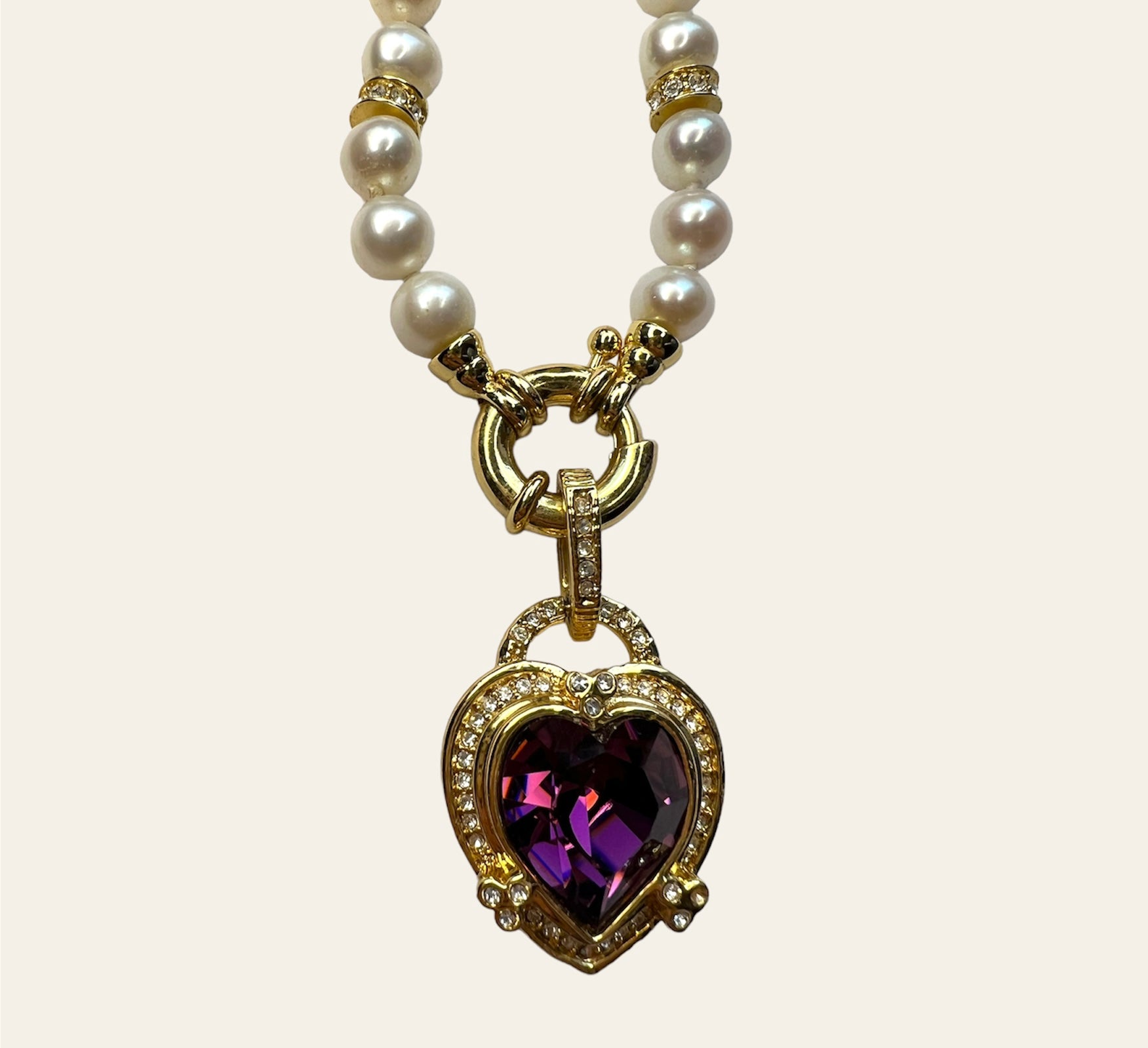 Authentic cultured baroque pearl collar necklace with a purple Glass heart pendant on gold plated sailor clasp. There are four spacer beads on front of necklace with clear crystals.