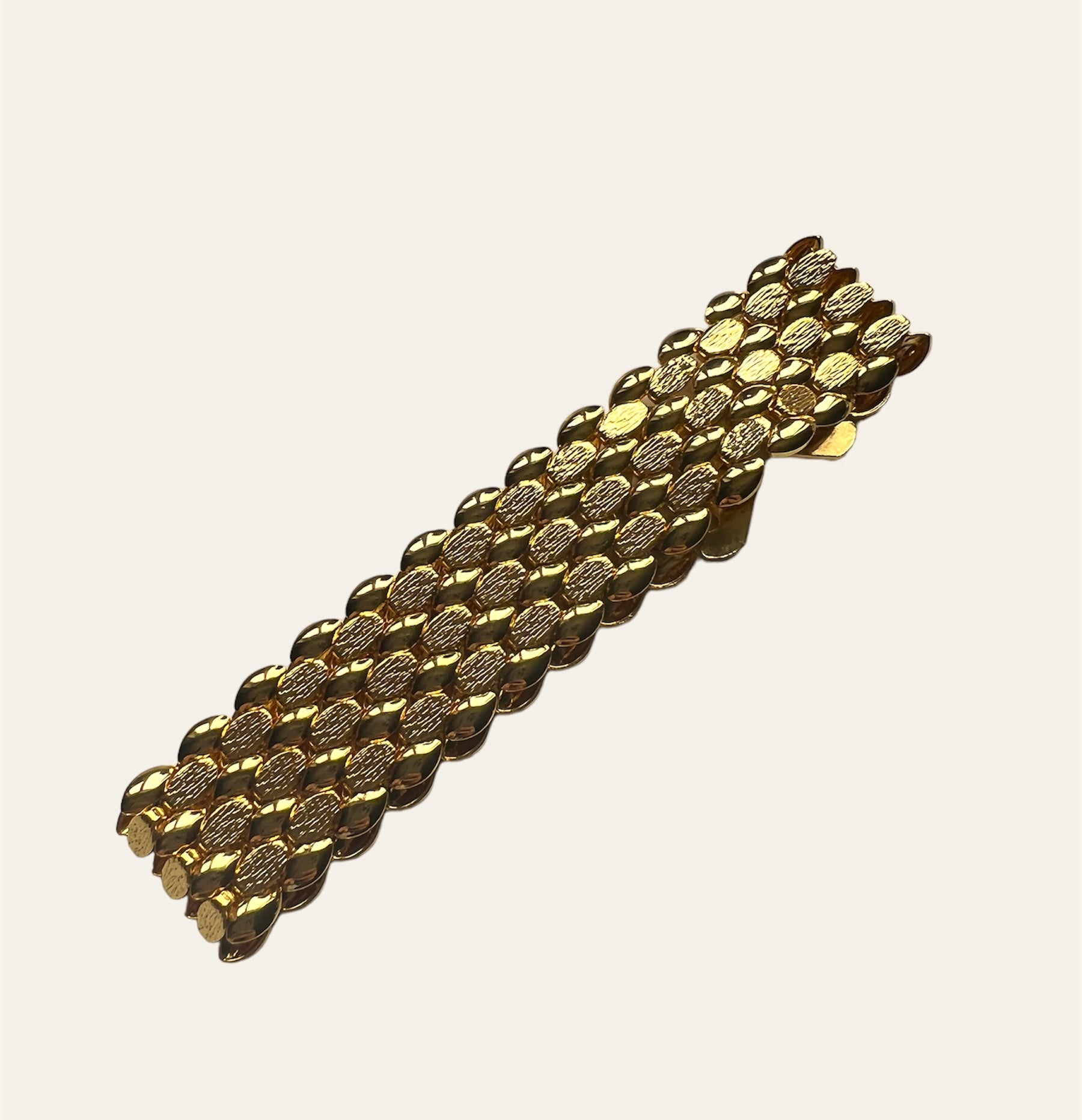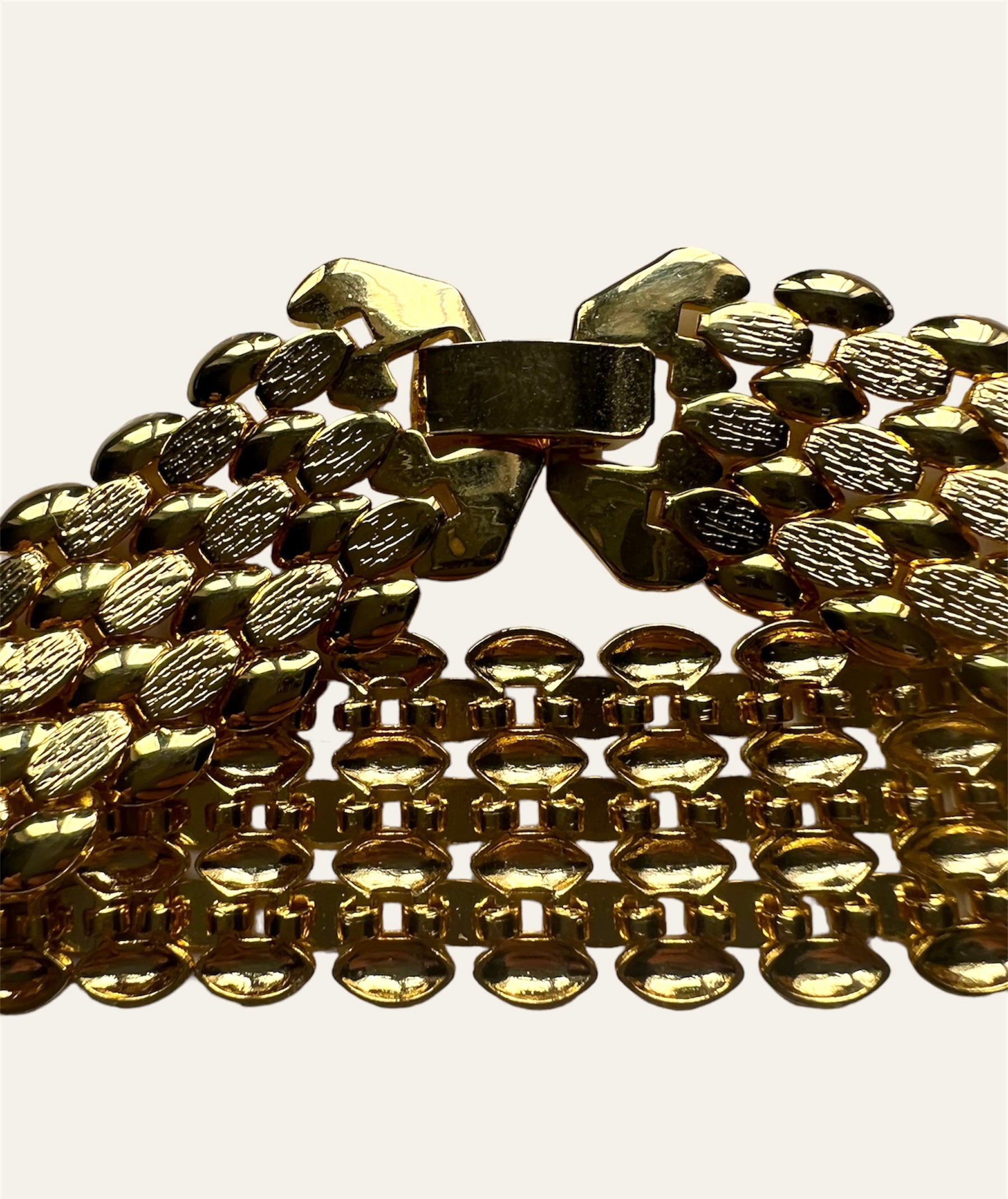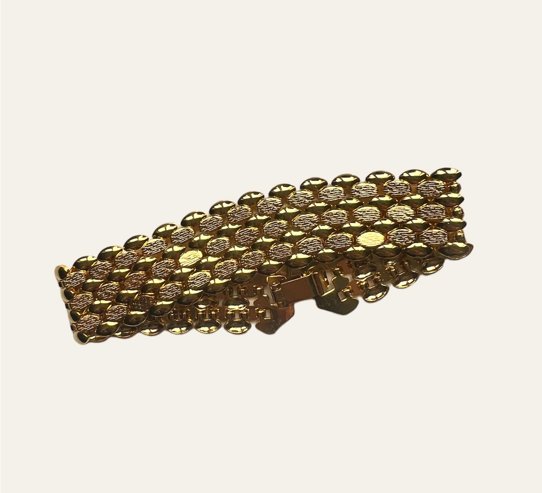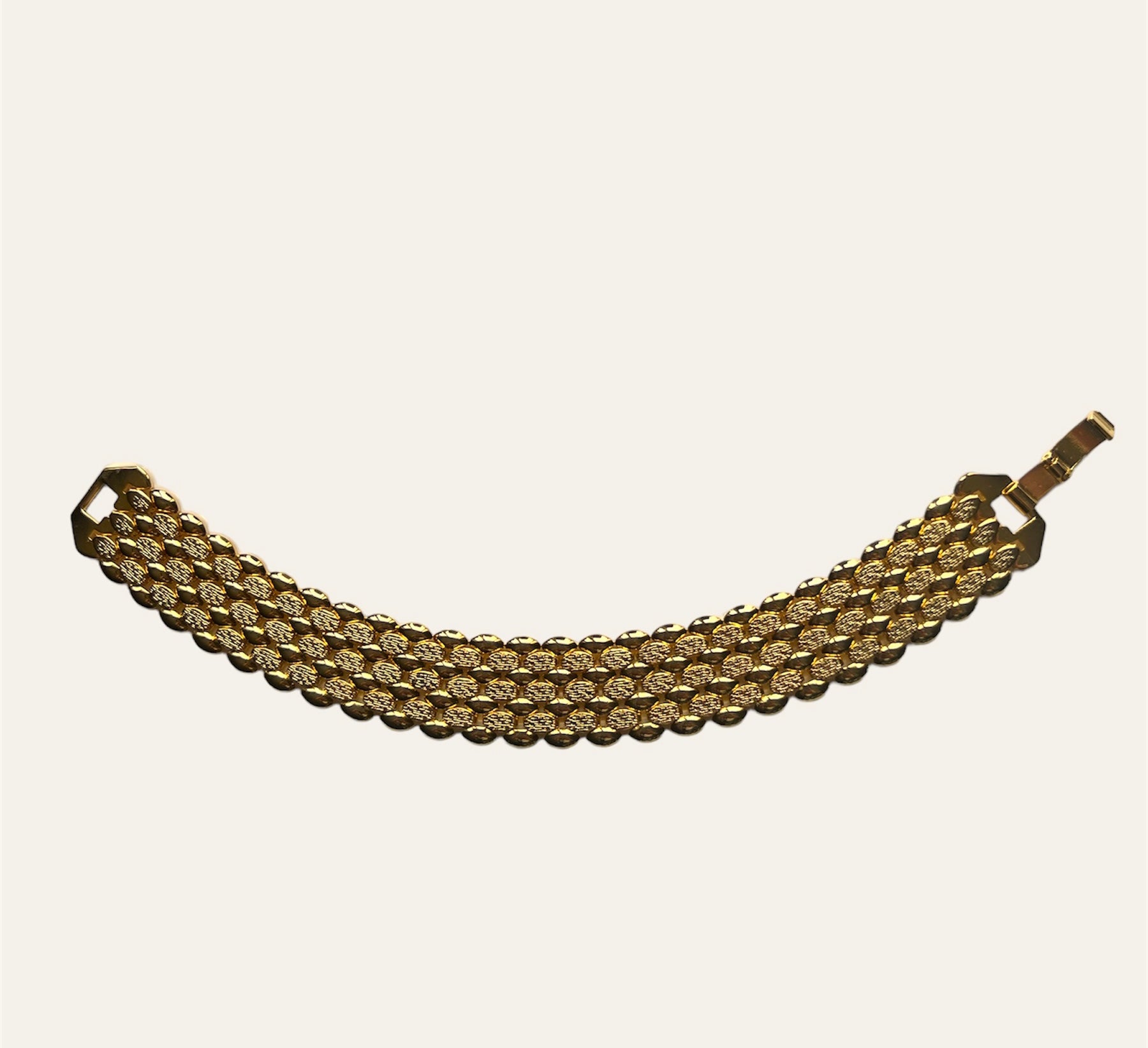 Unsigned bracelet. It has rich shiny gold tone and it looks like real gold. I love it cause it's not big on my wrist. If you have a classic style, this bracelet is perfect for you.