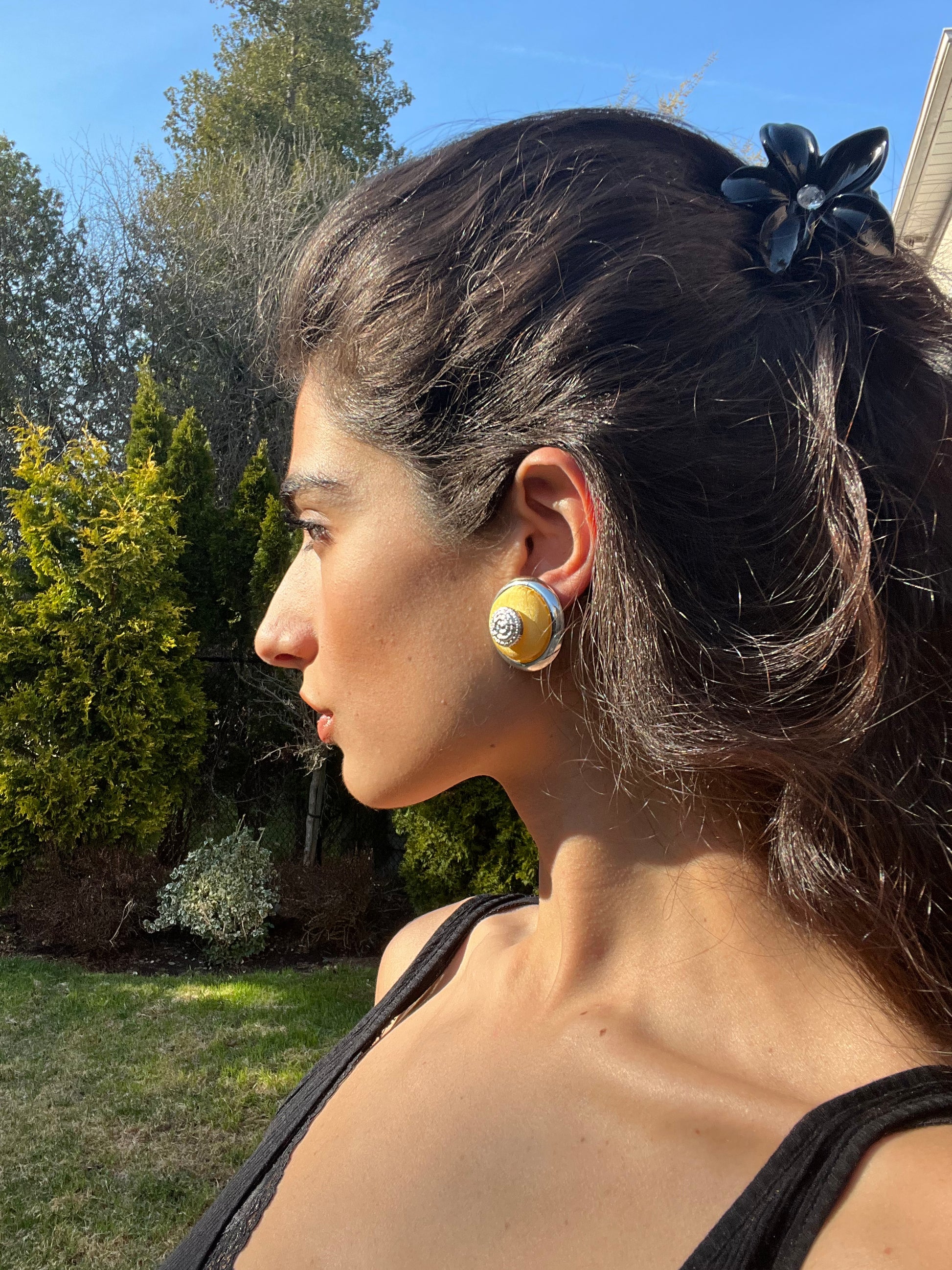 Super cute and fresh earrings. They are made of satin fabric and they have a nice voluminous domed circular shape. For Yellow lovers as I am!