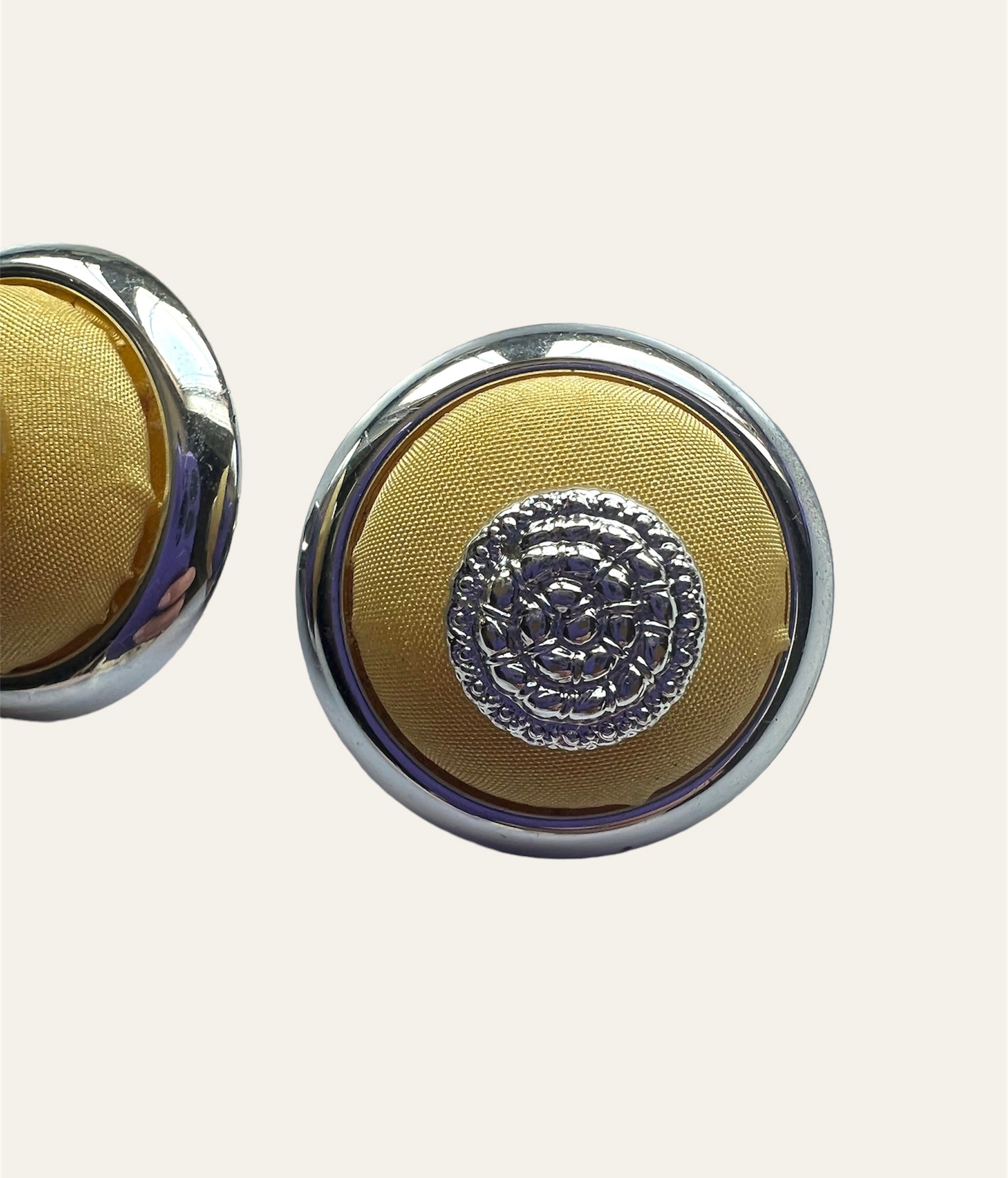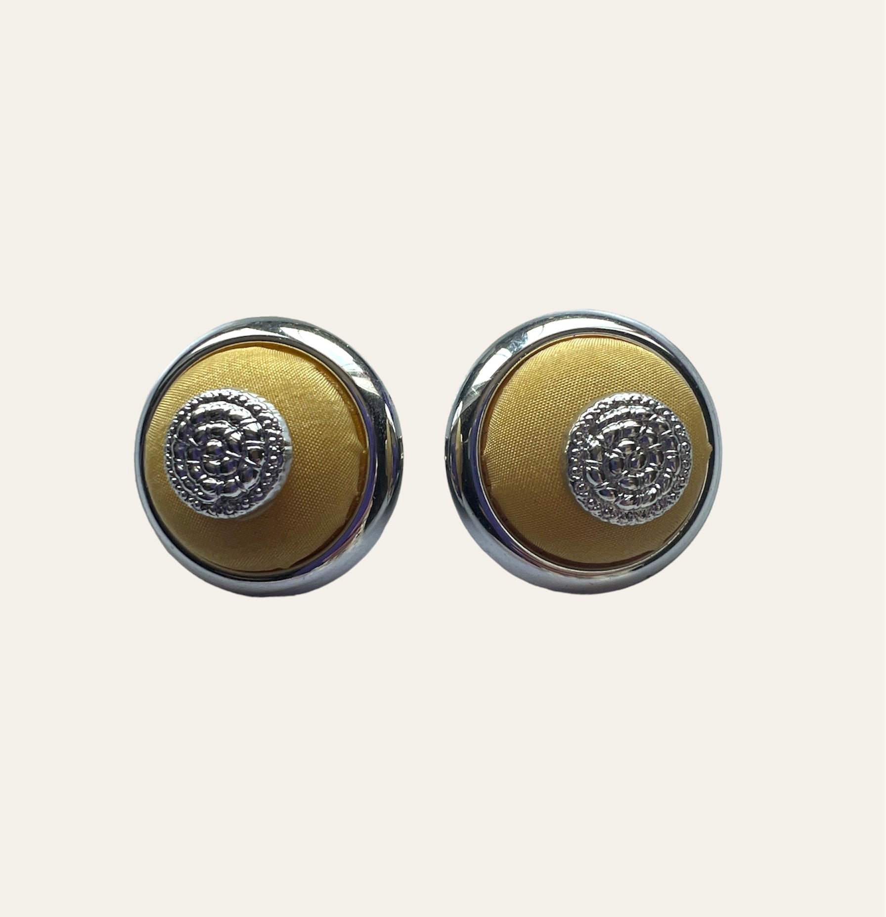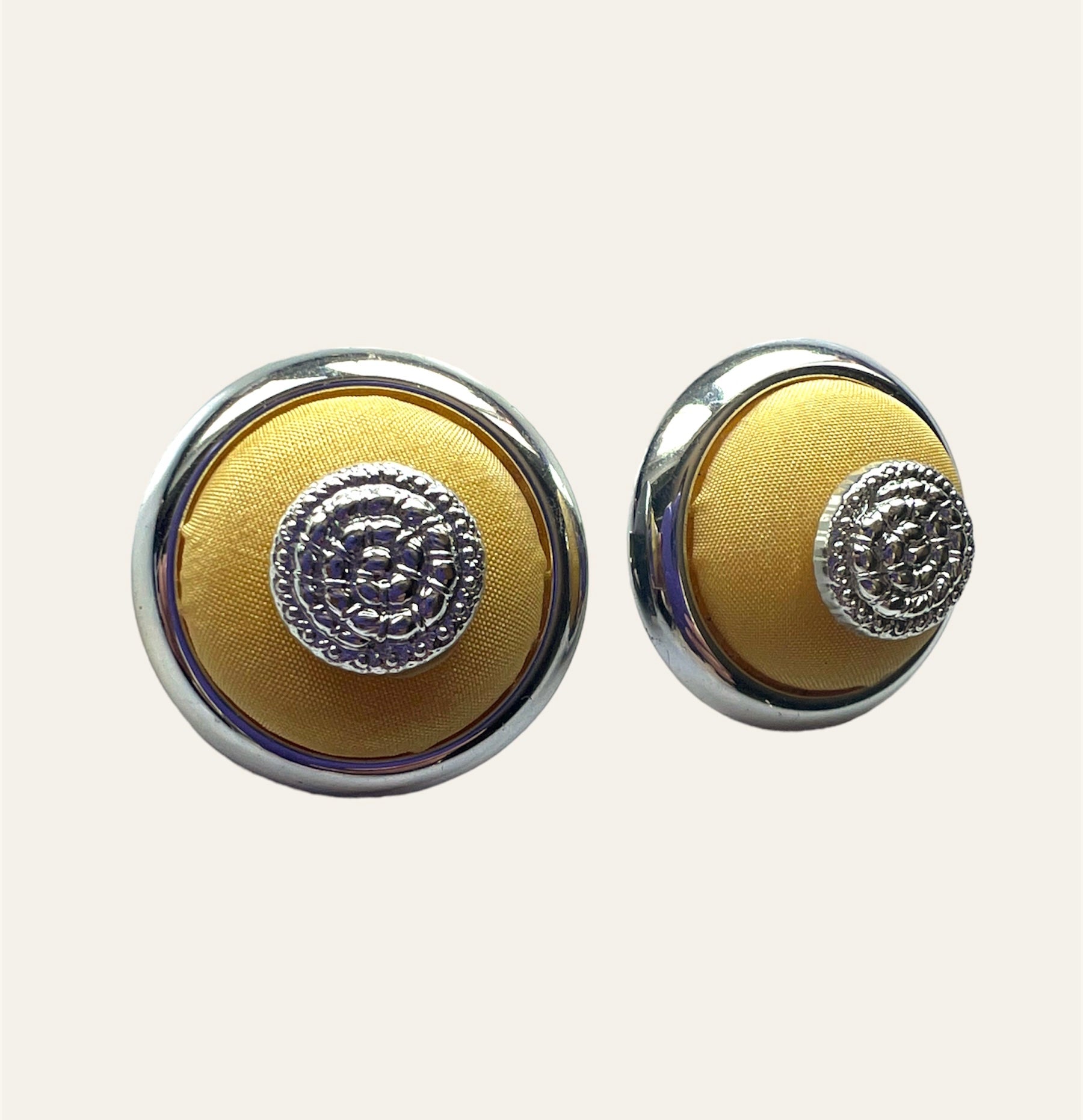 Satin Yellow And Silver Tone Button Earrings