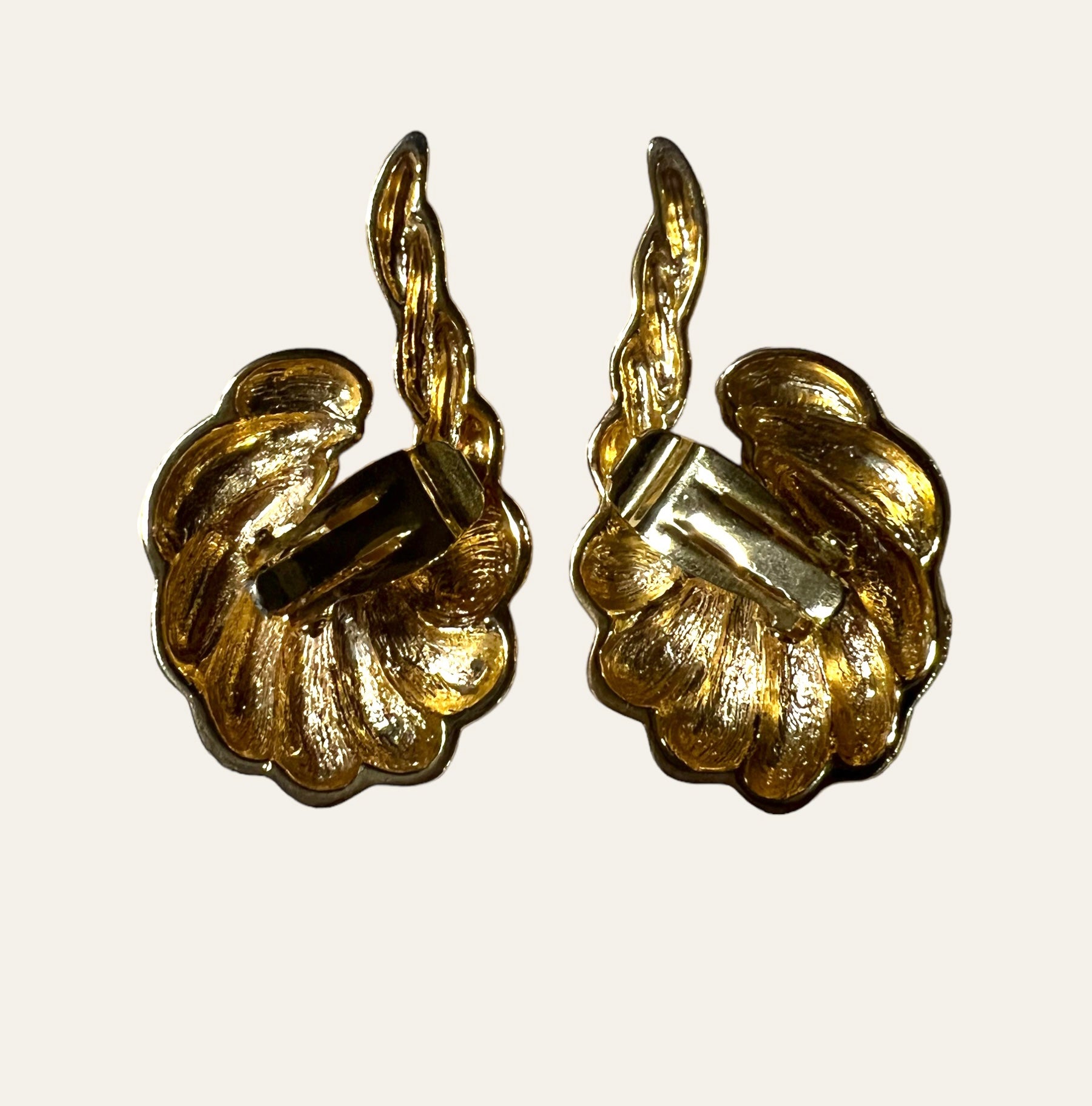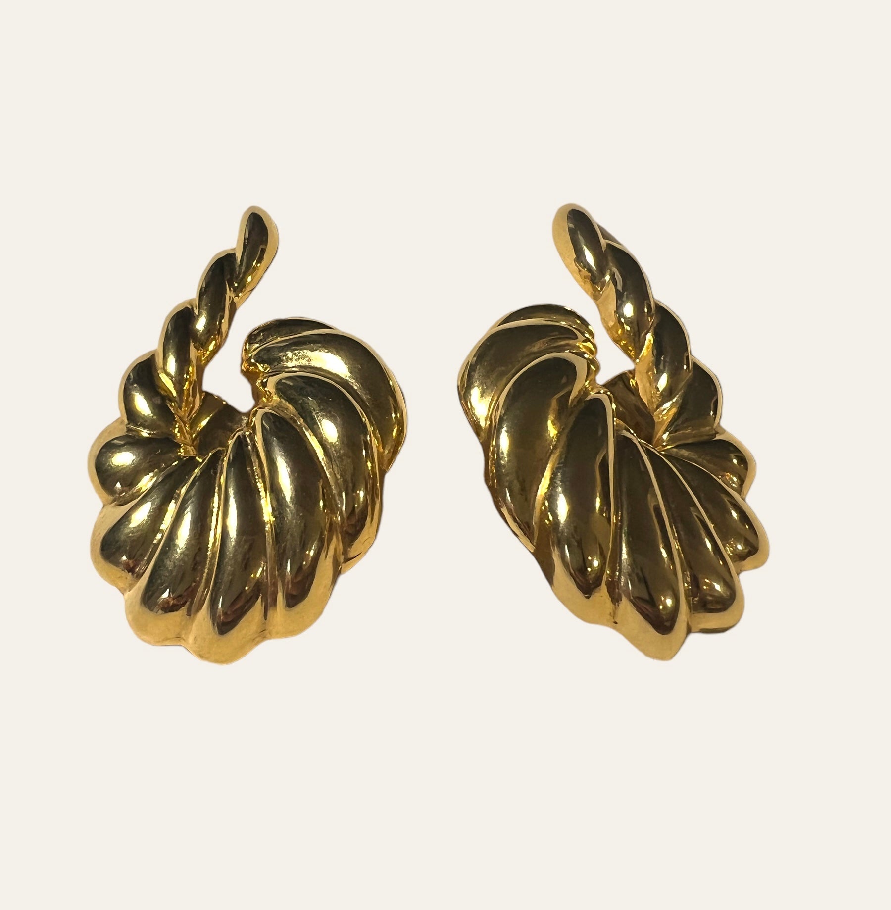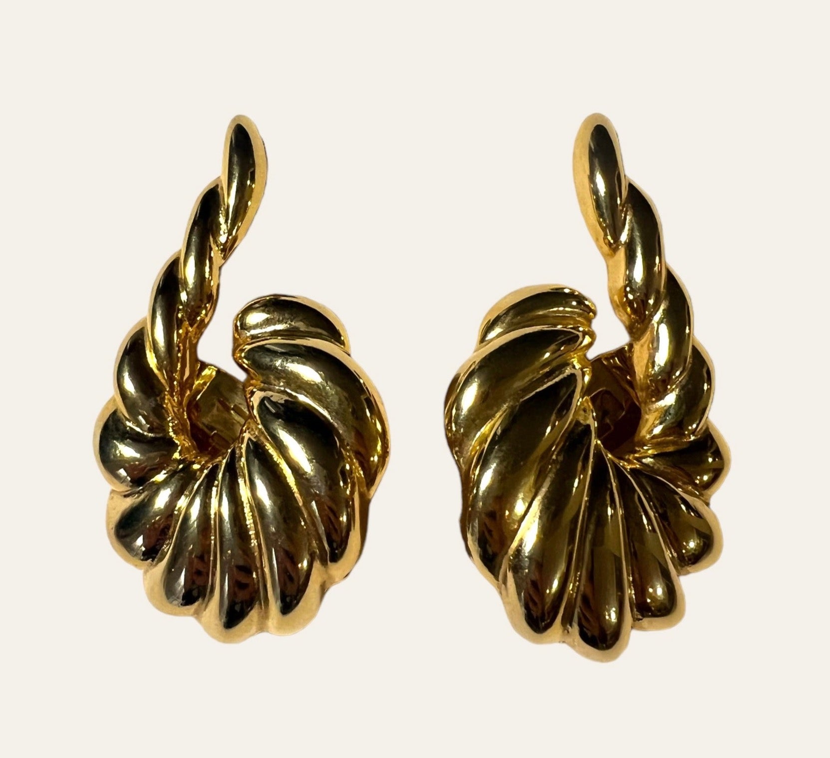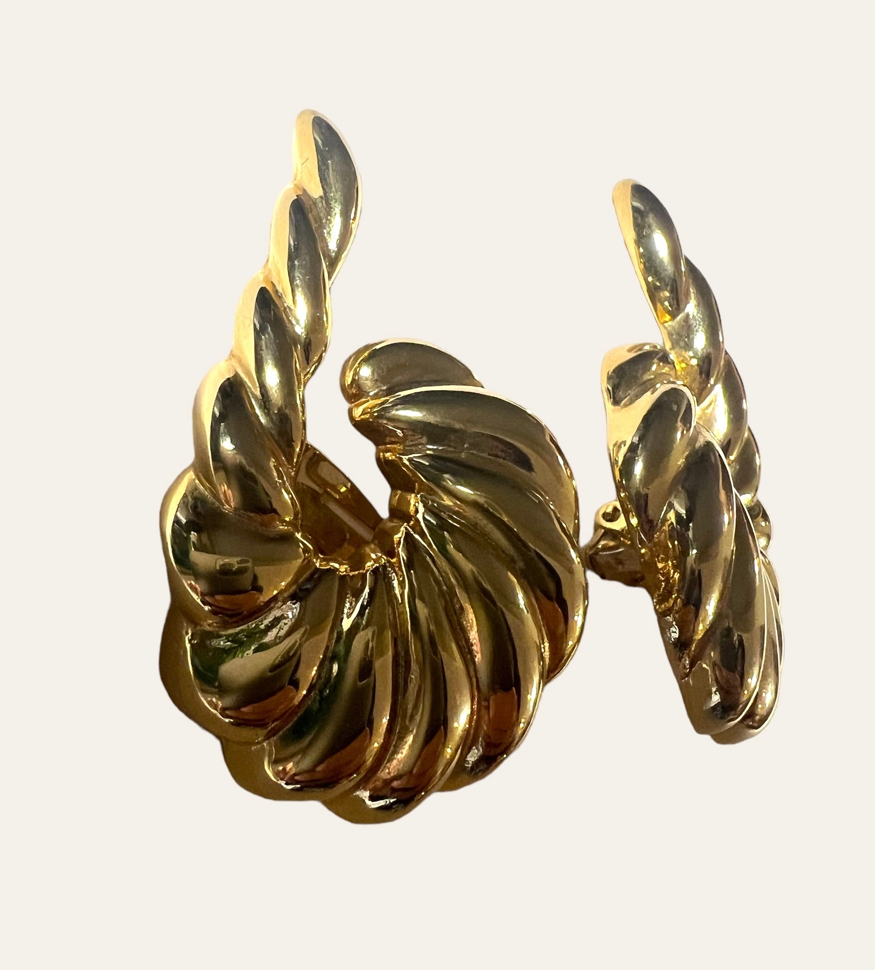 WOW! Fabulous Avant Garde high quality gold plated clip on earrings featuring a shrimp design with the tail of the earrings climbing up the ear. They are gorgeous and have the perfectly dramatic runway look. A Romy's fav!