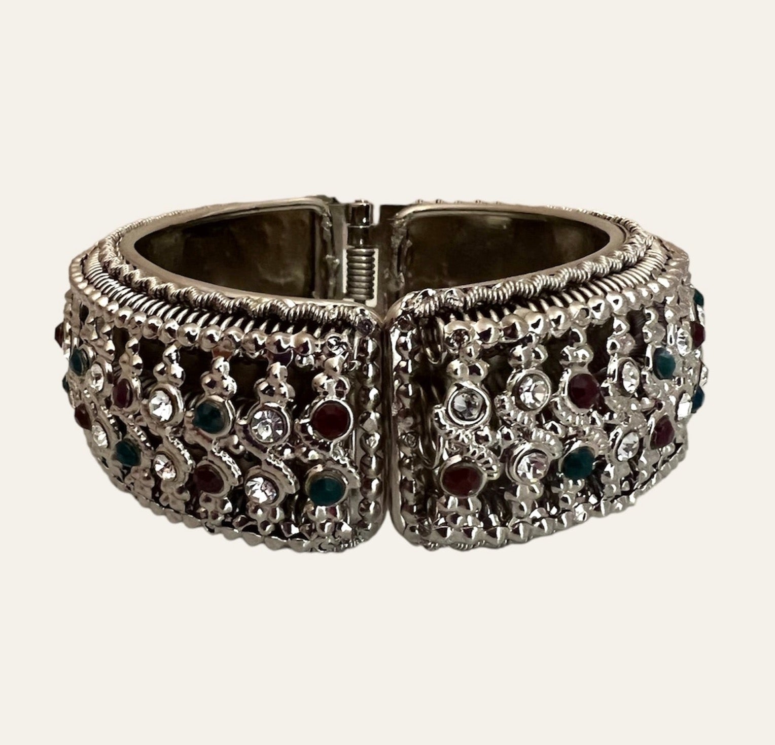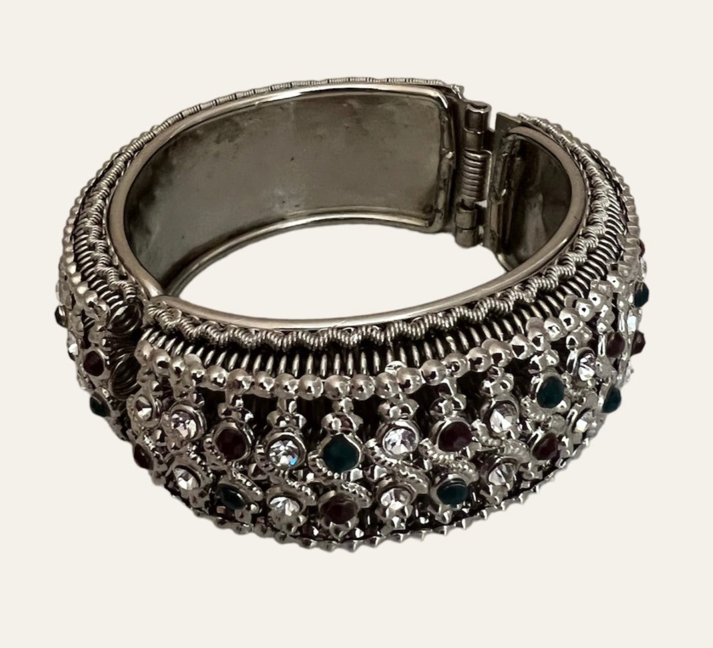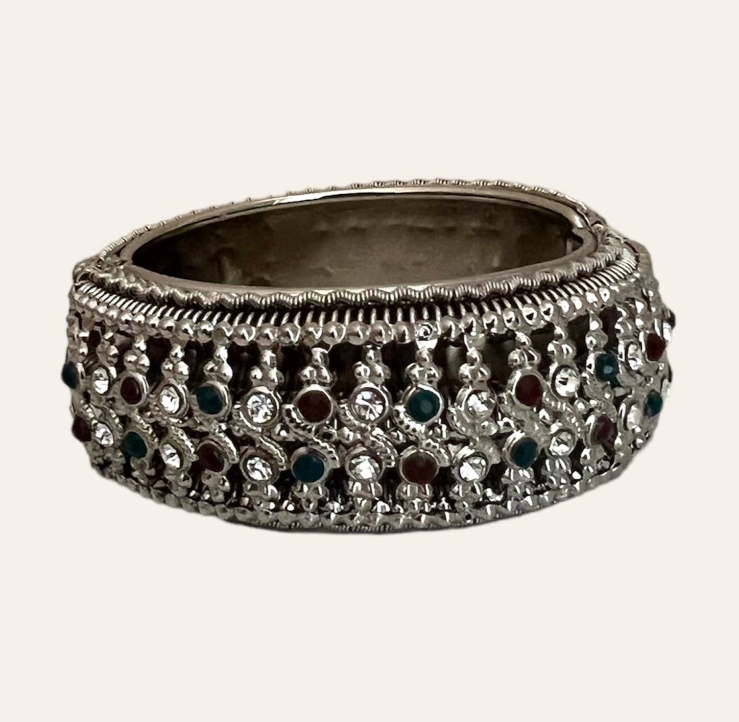 Unsigned bangle with green, clear and burgundy rhinestones. The work on it is beautiful!