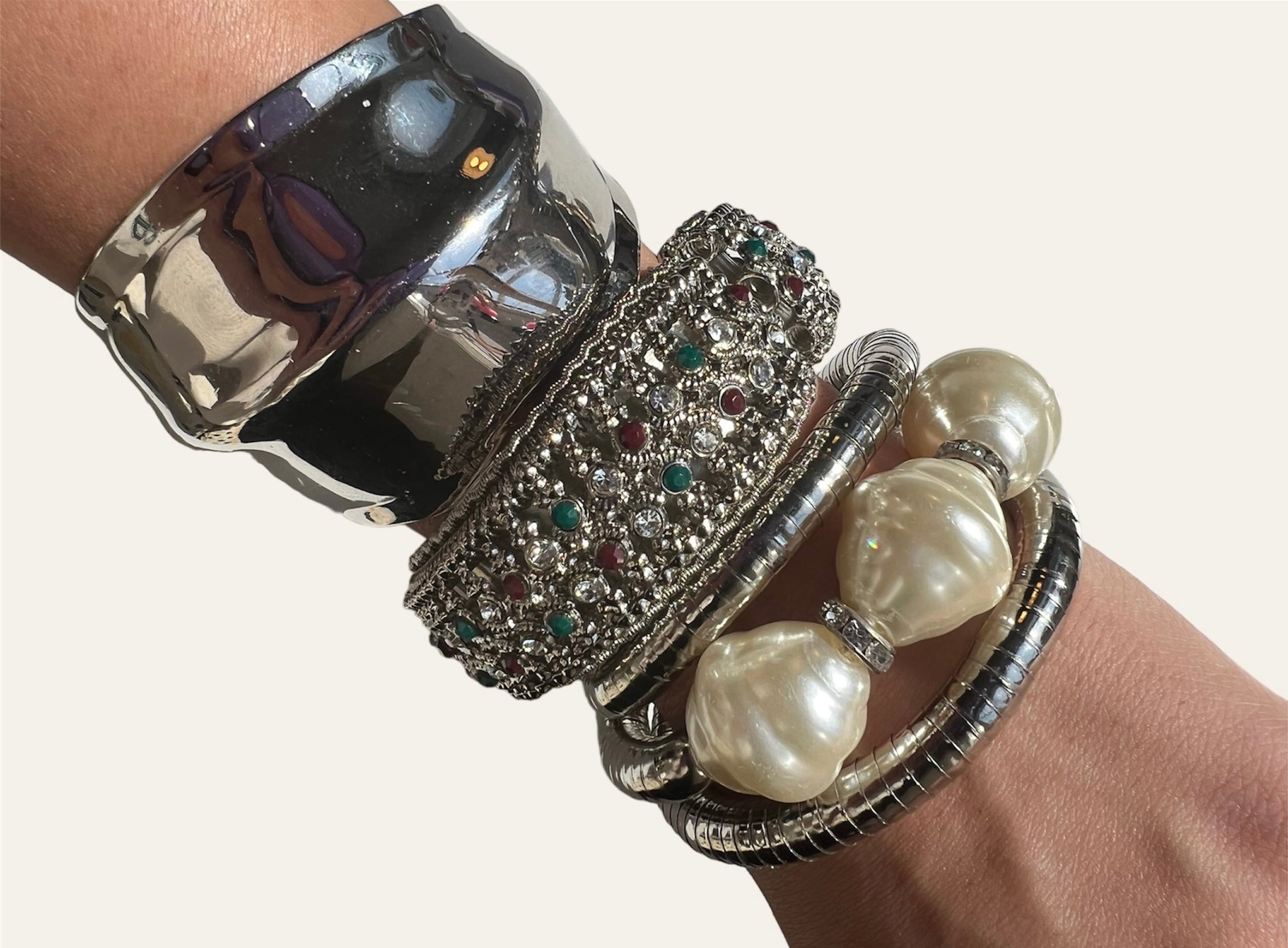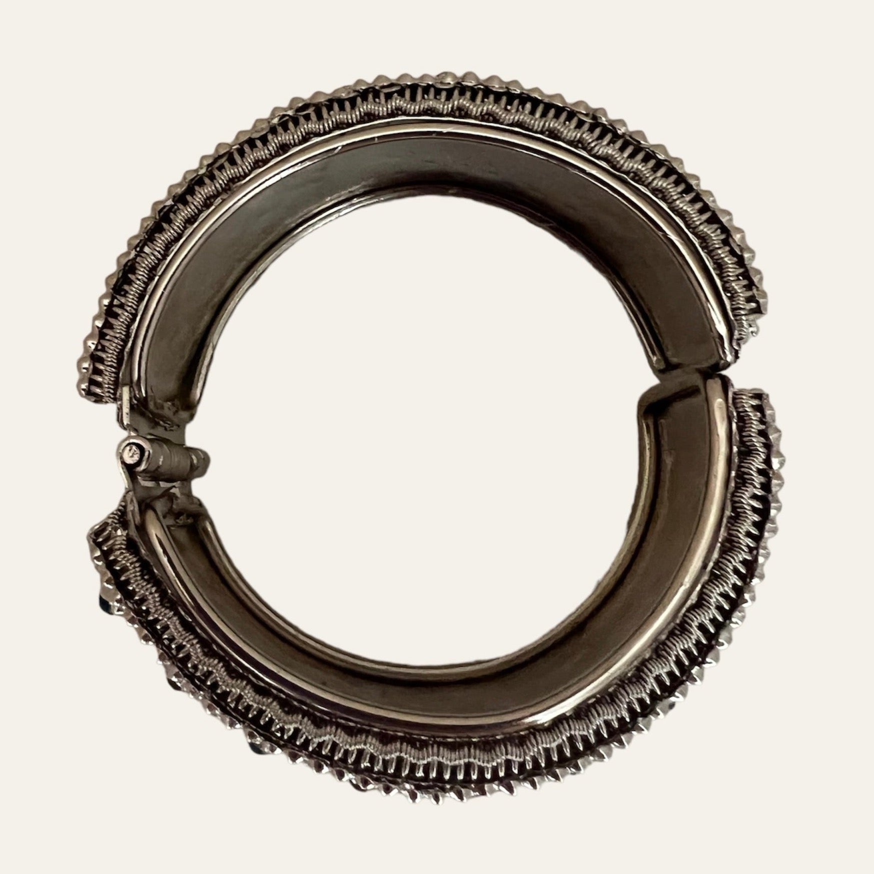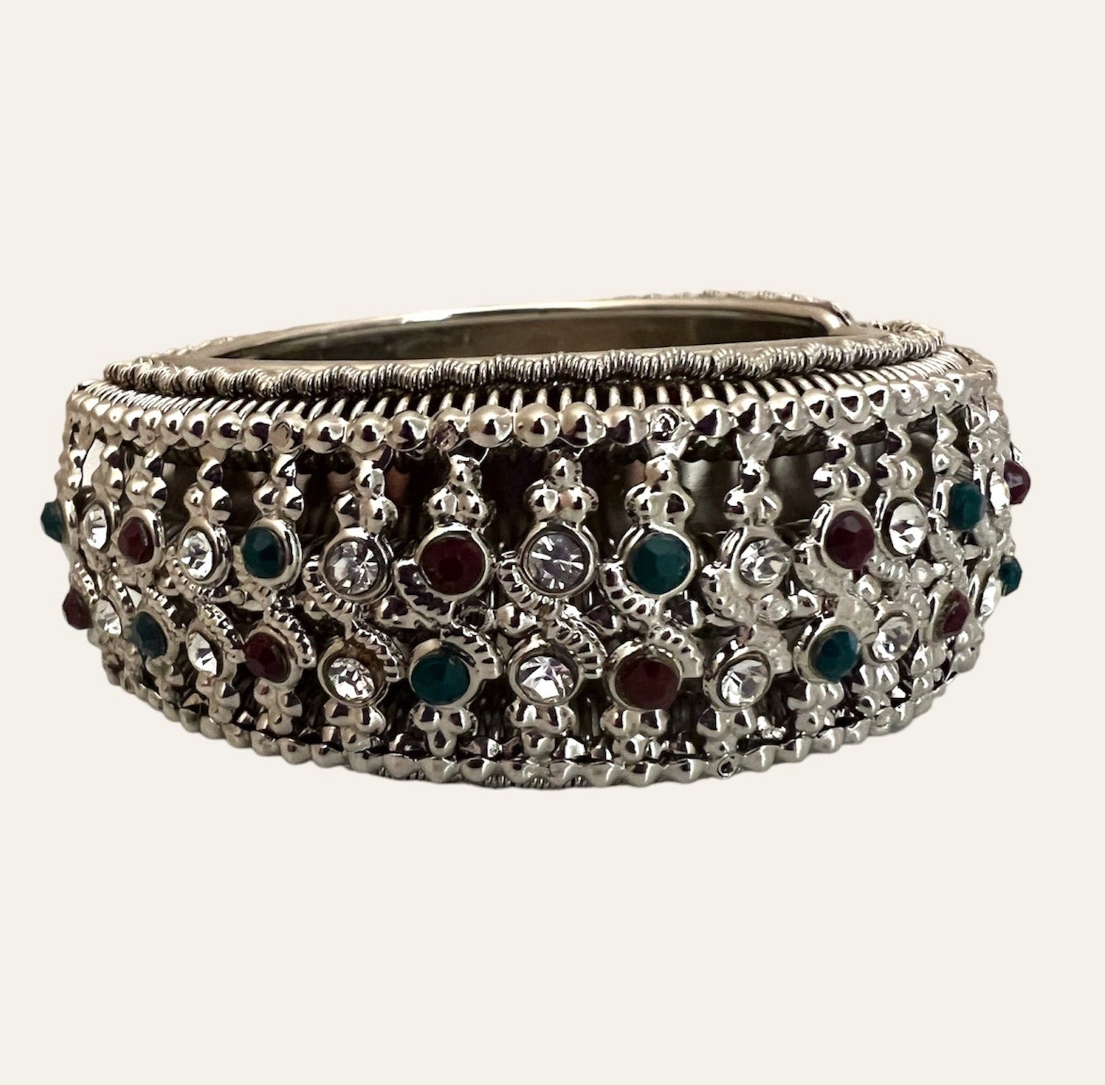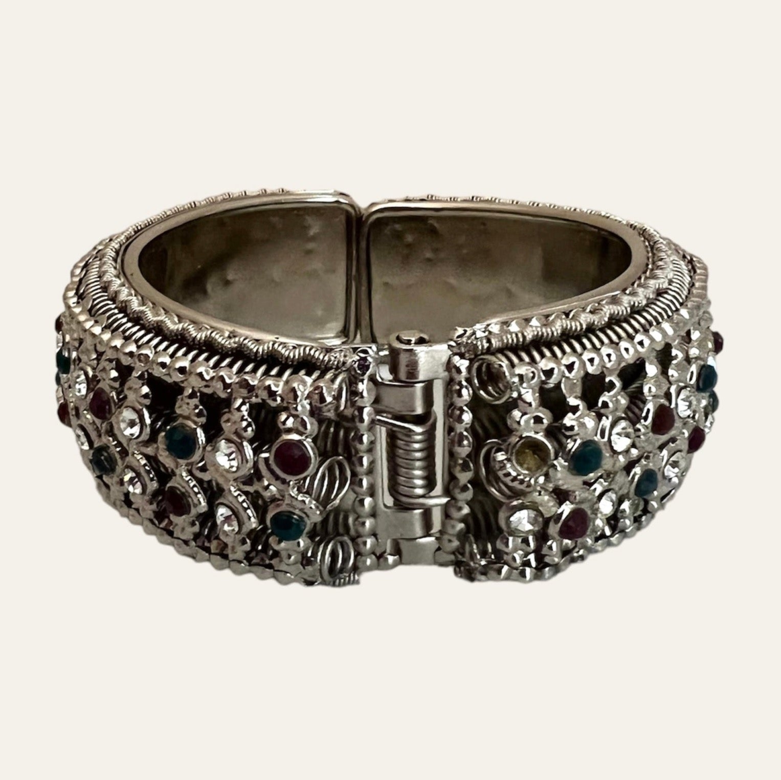 Unsigned bangle with green, clear and burgundy rhinestones. The work on it is beautiful!