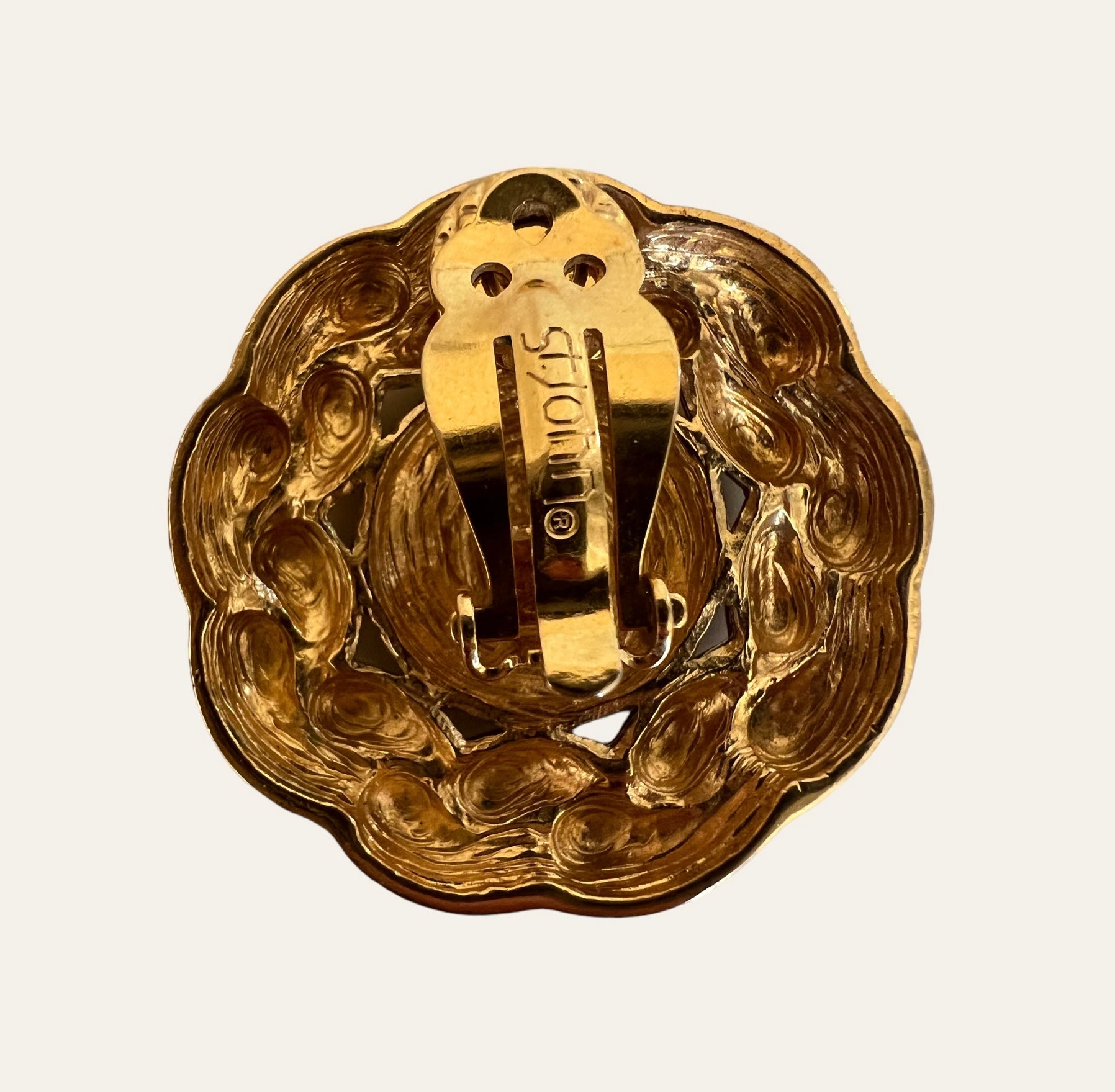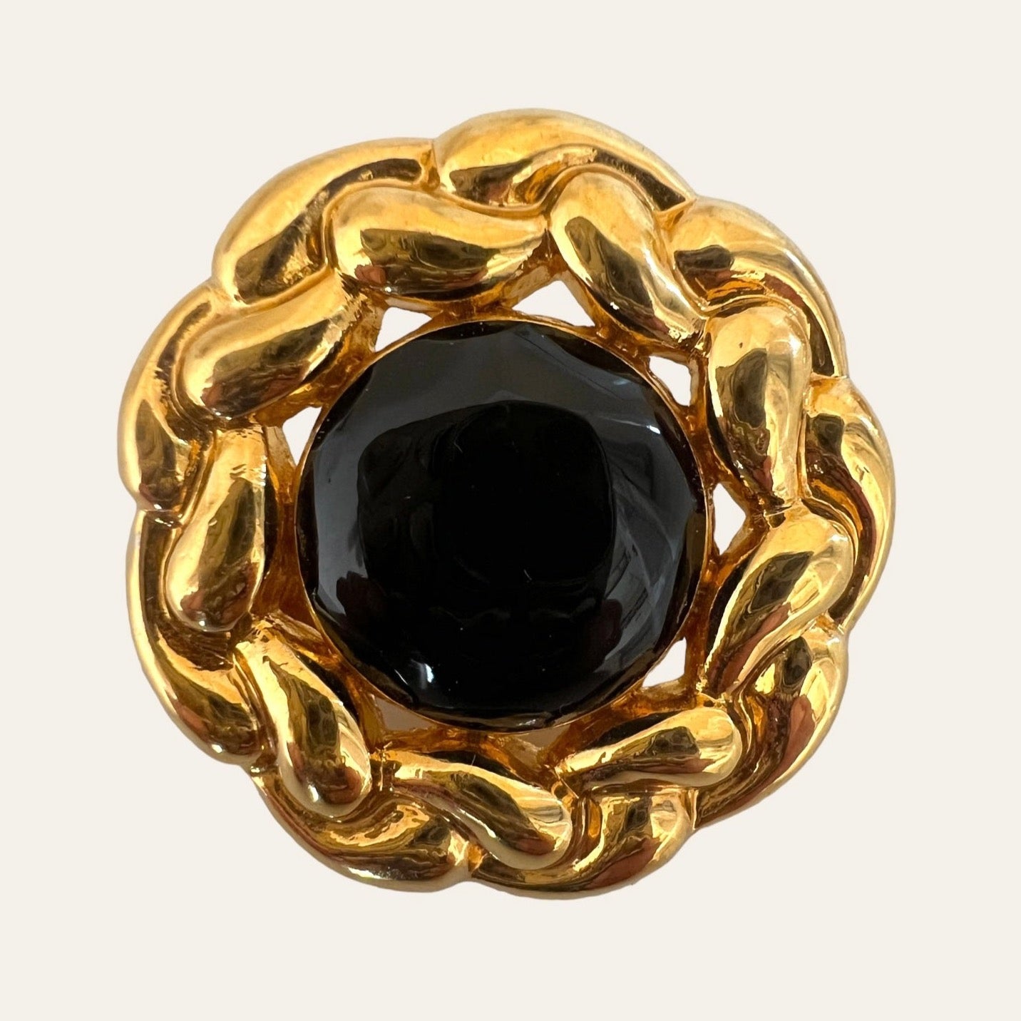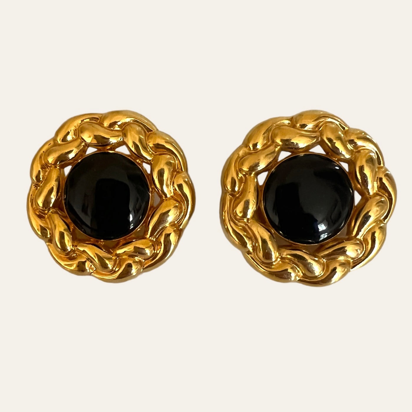 Large roped chain halo gold tone clip on earrings with black enamels in the centre. These earrings are high quality and look like Chanel earrings. CLASSICS!