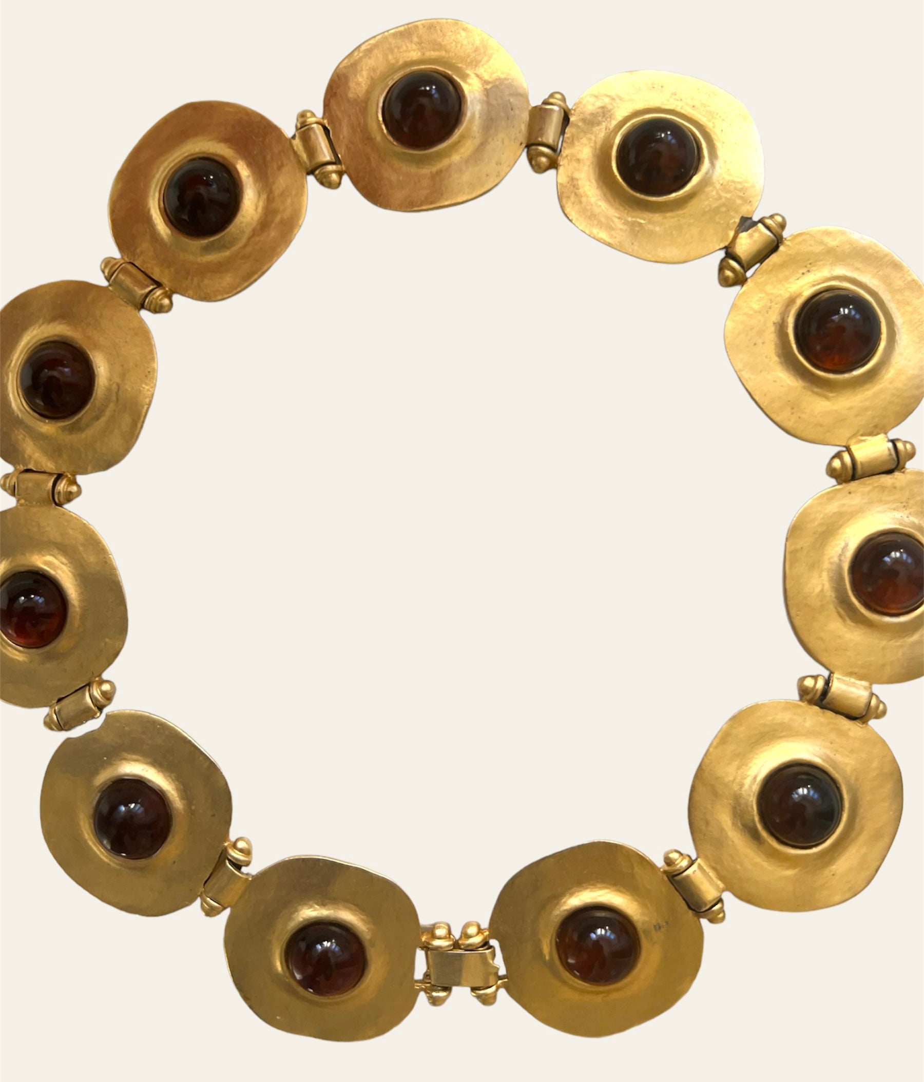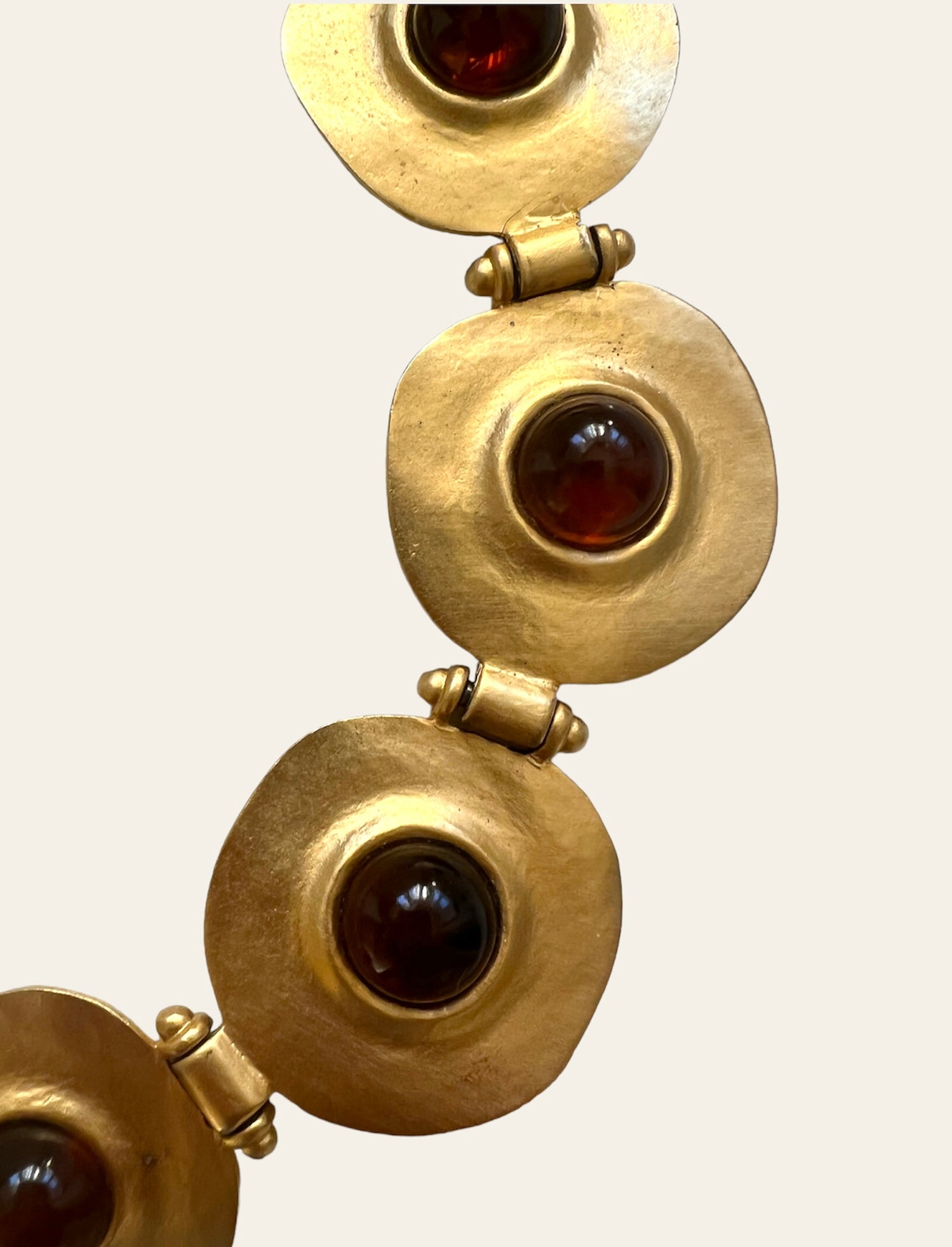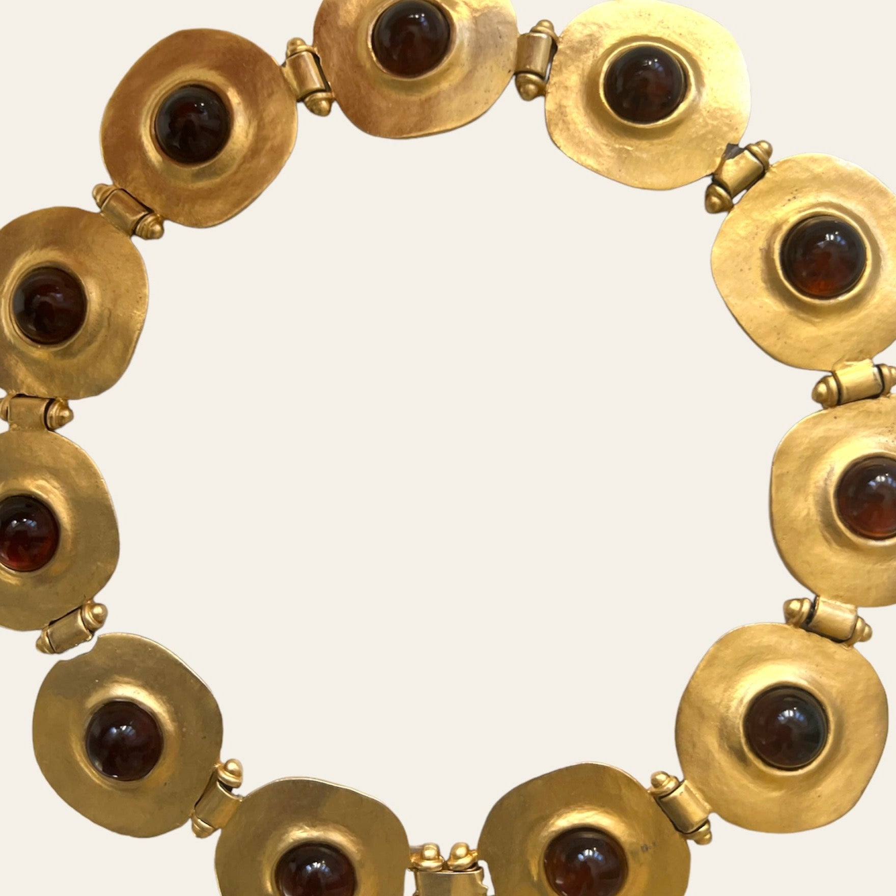 Statement Hammered Gold Tone Disk Polished Cabochon Stone Necklace