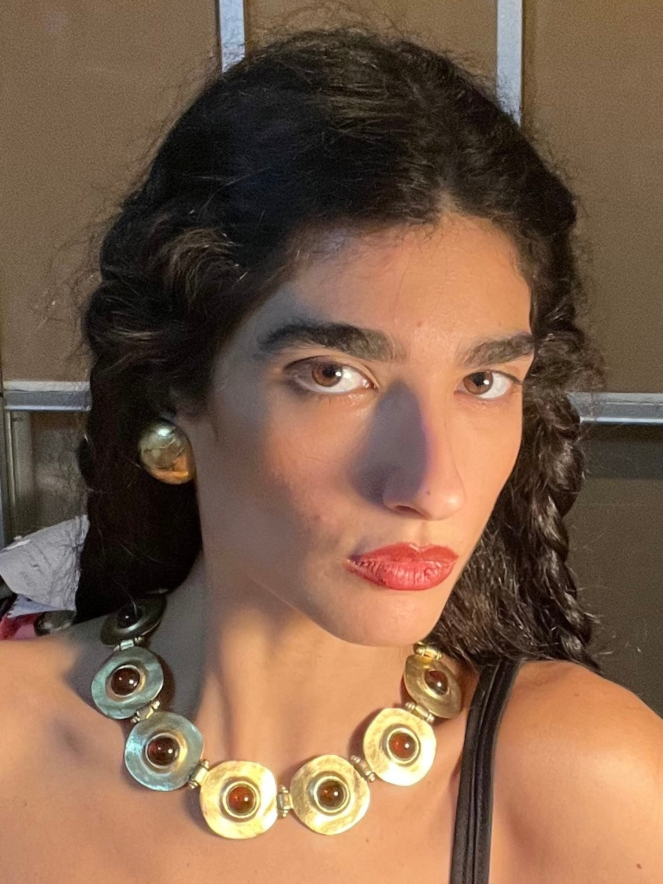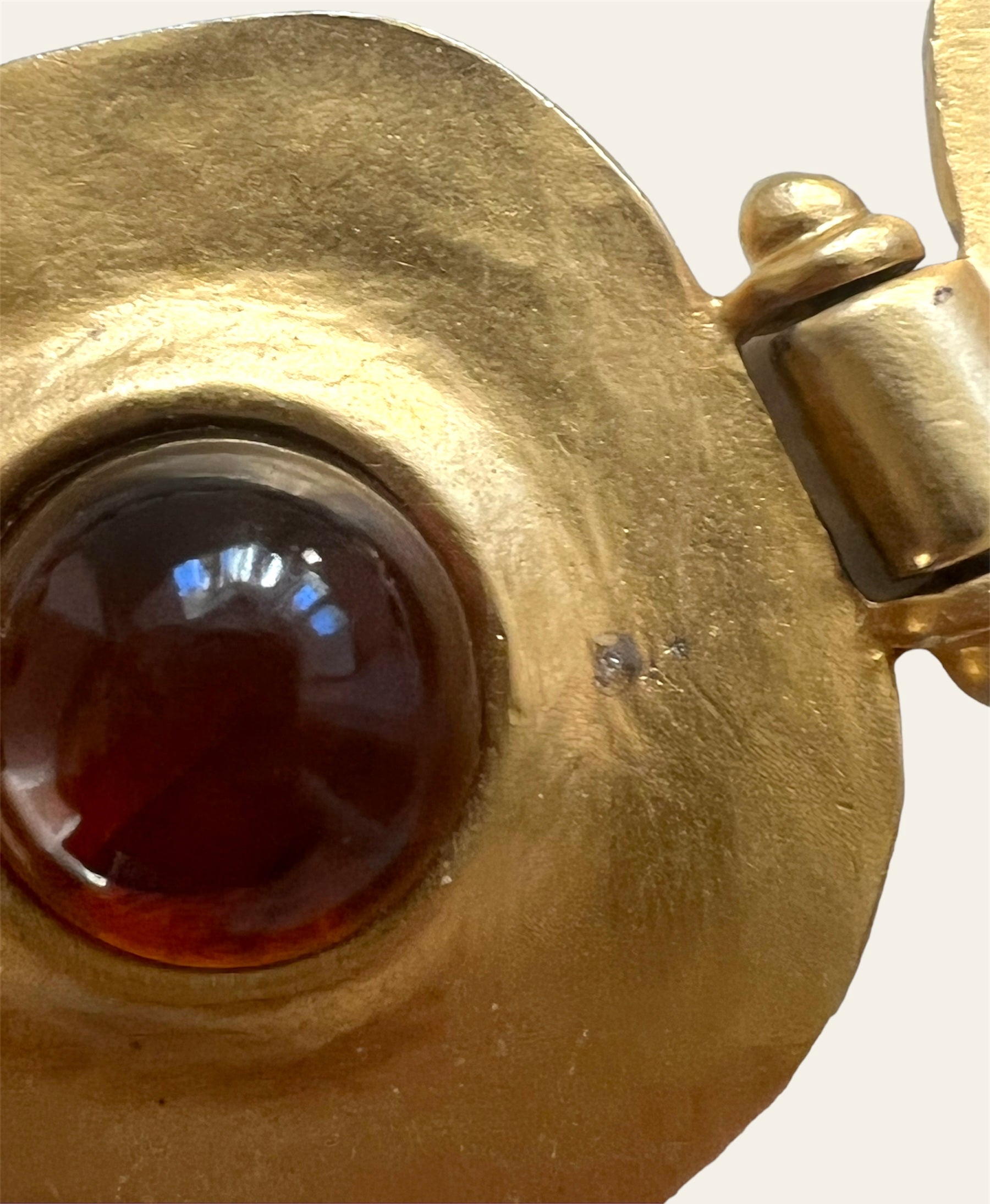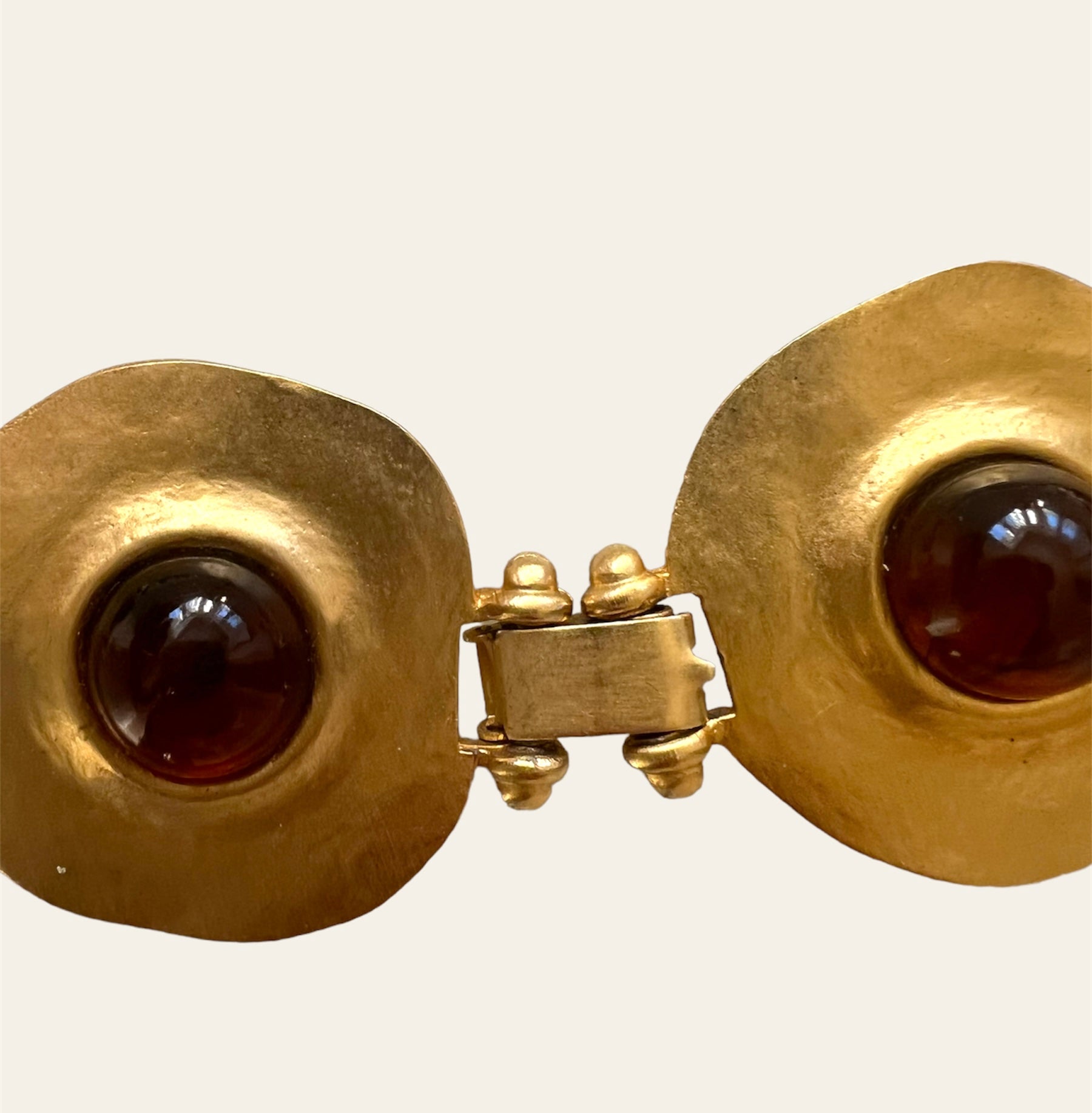 Statement Hammered Gold Tone Disk Polished Cabochon Stone Necklace