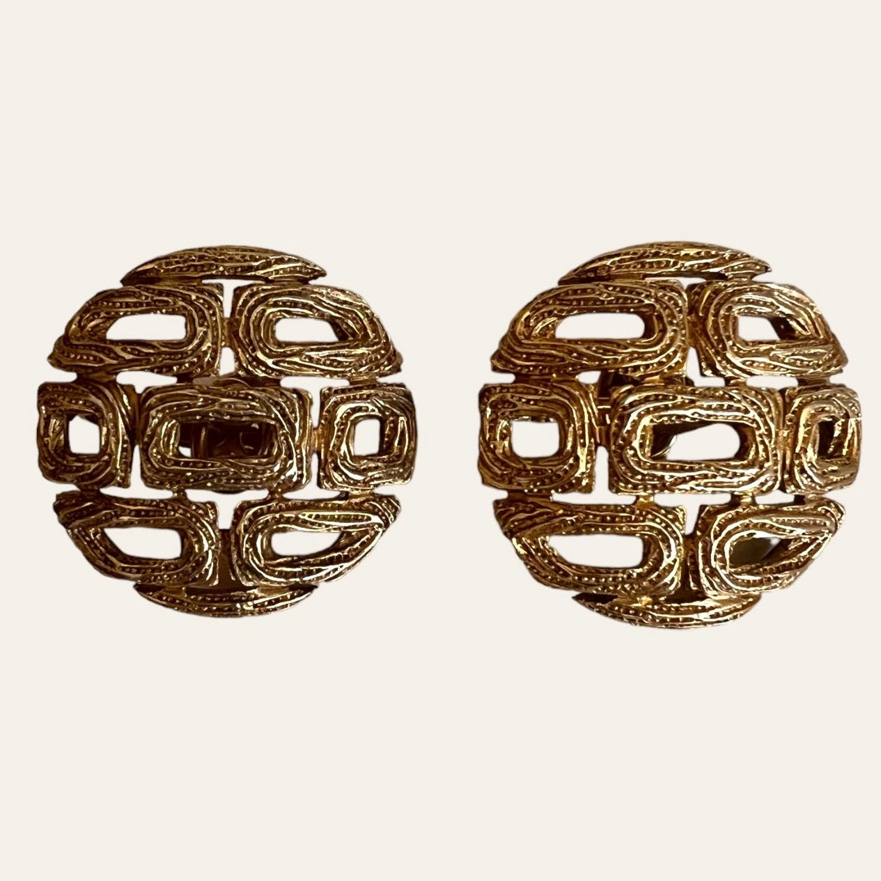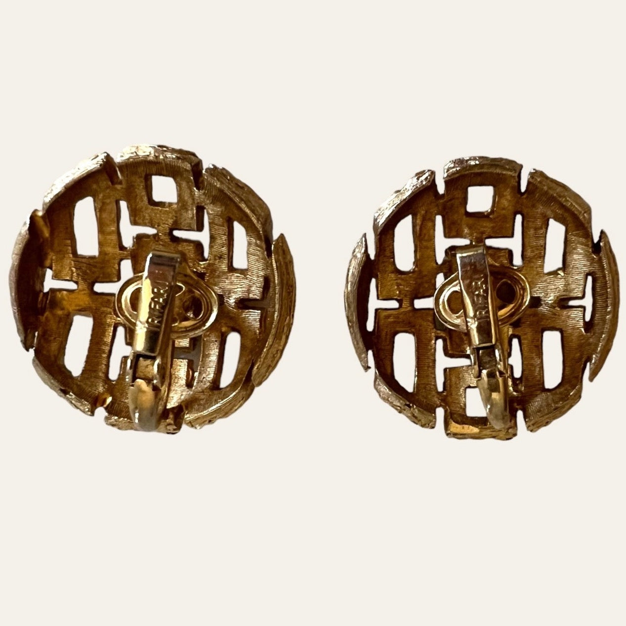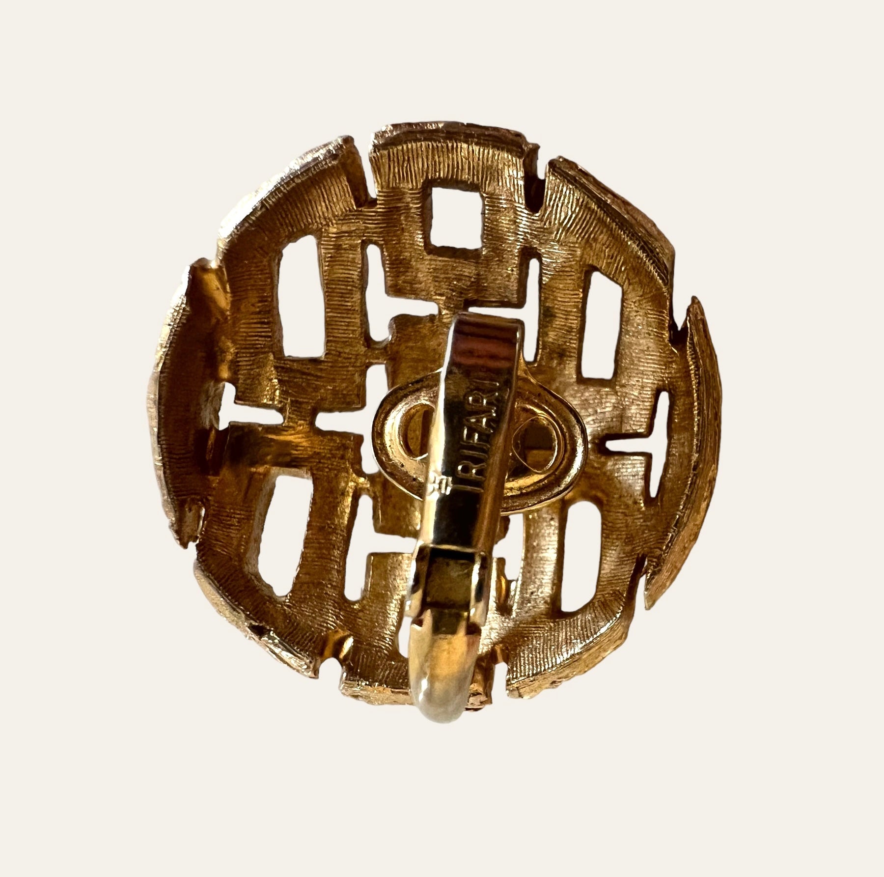 Gold tone Trifari earrings featuring a circular arrangement of open work textured squares.