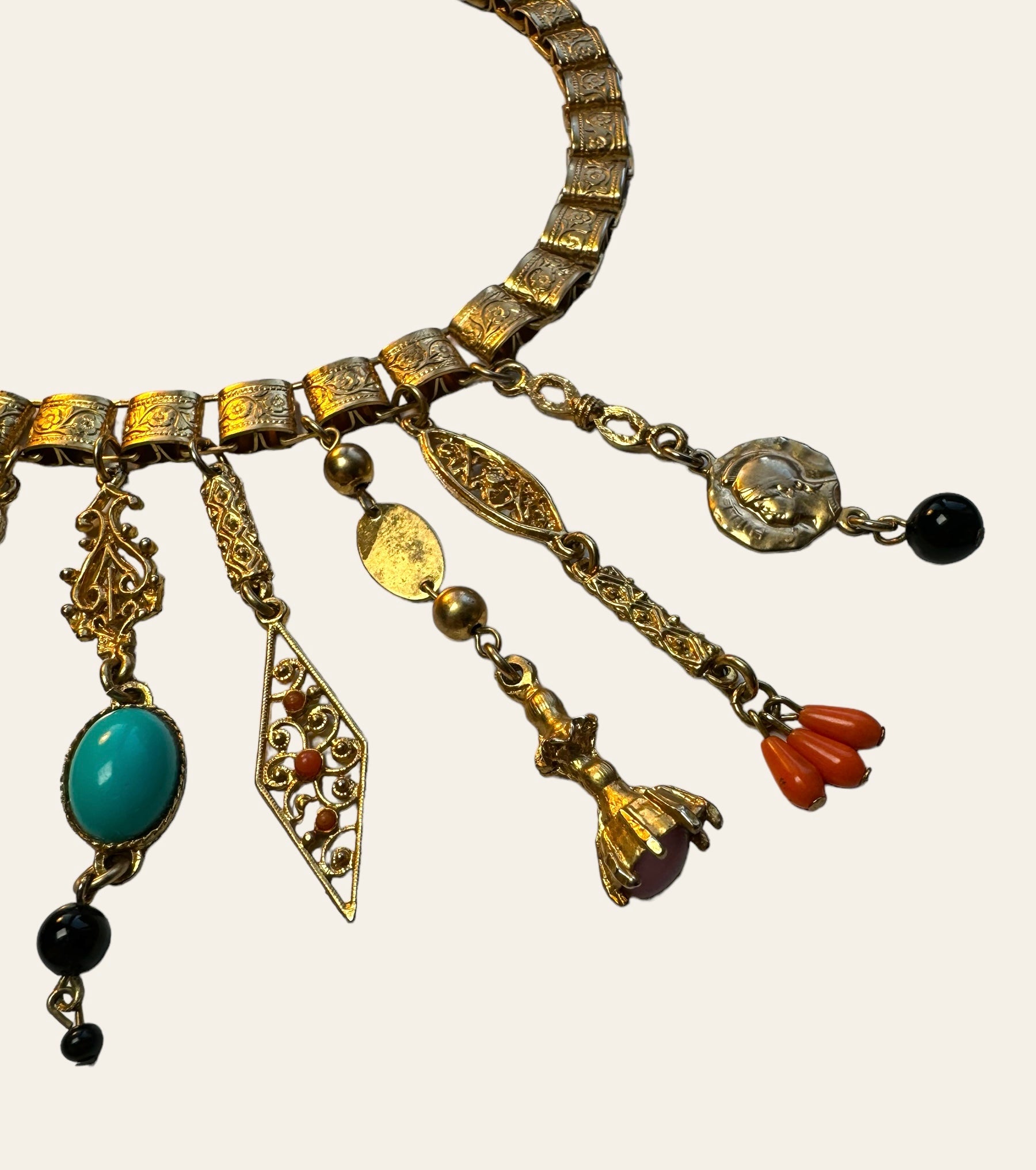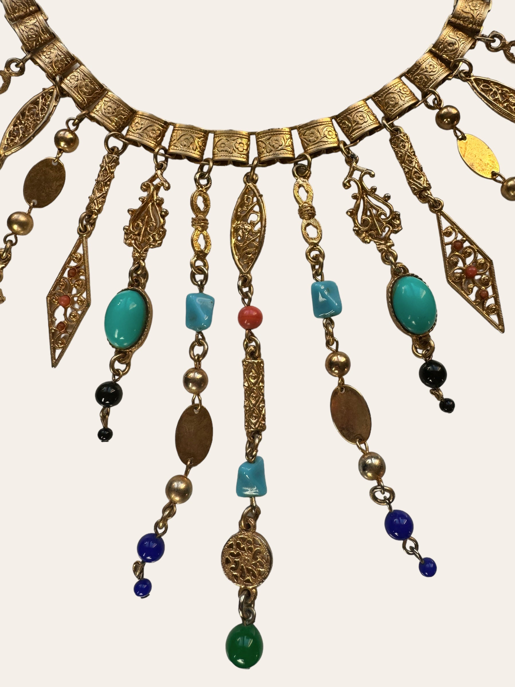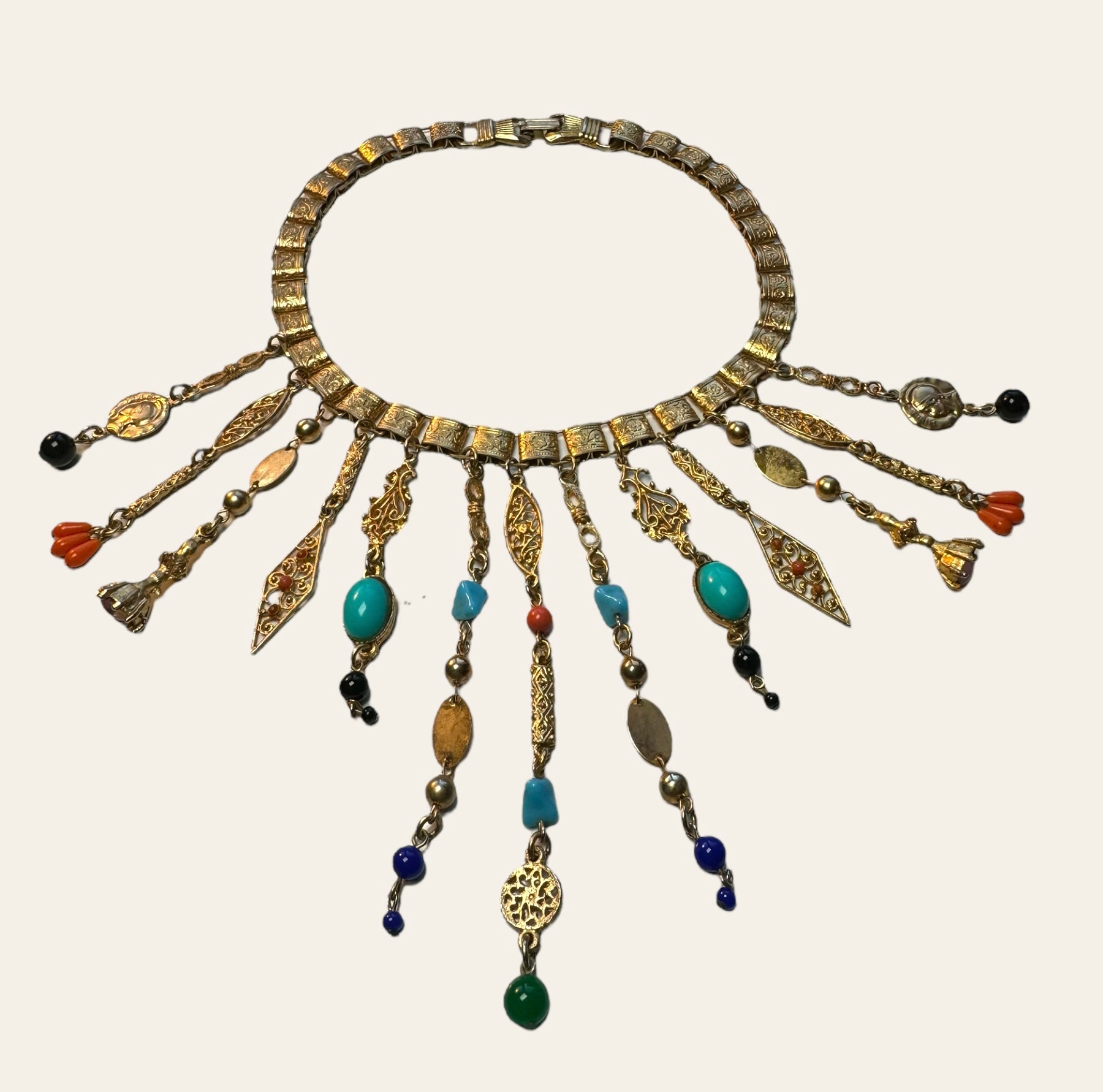Unsigned necklace from the 1950's featuring glass beads and other elements. Pictures are part of the description.It emanates antiquity and is a statement piece. A Romy's fav!