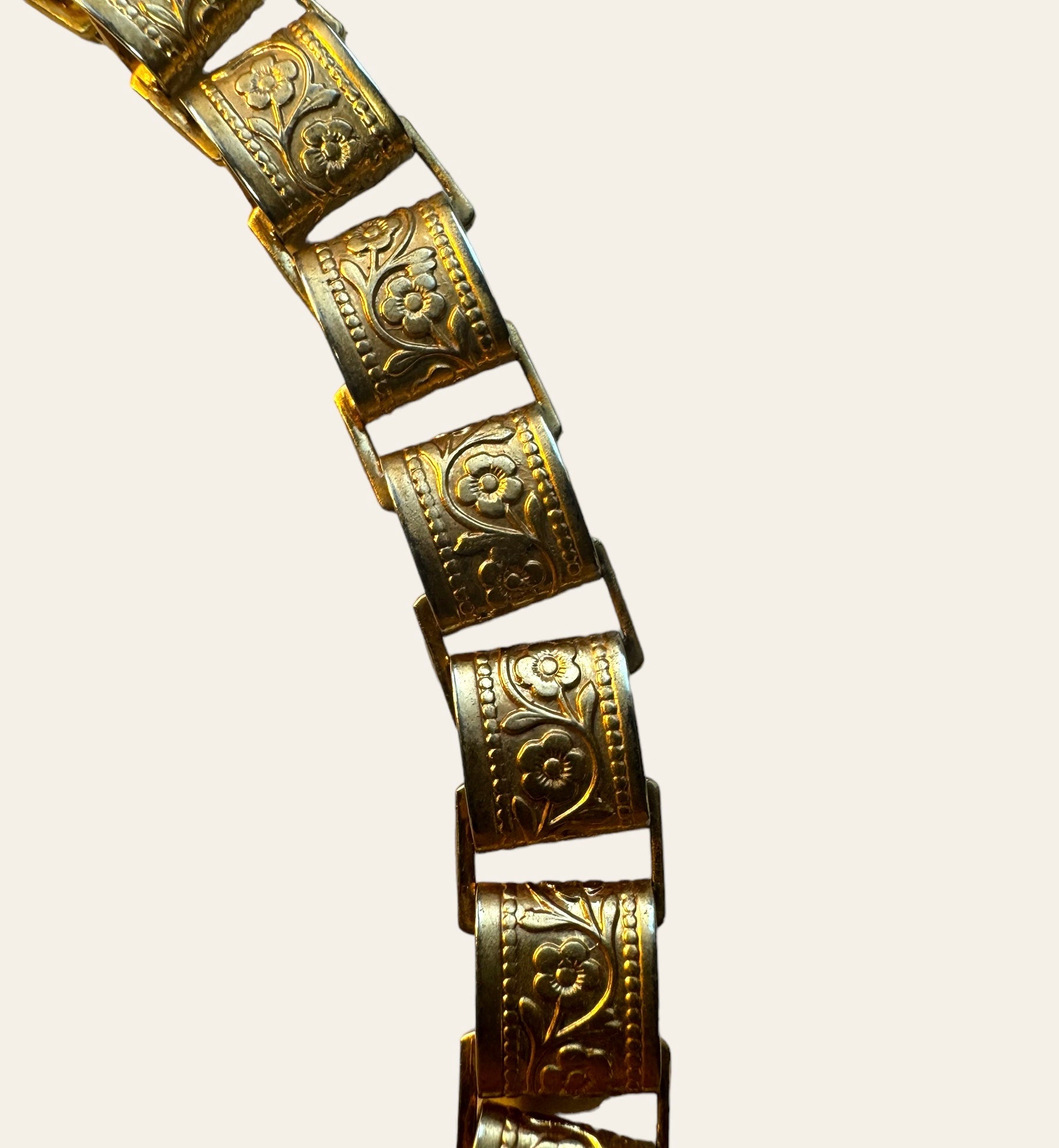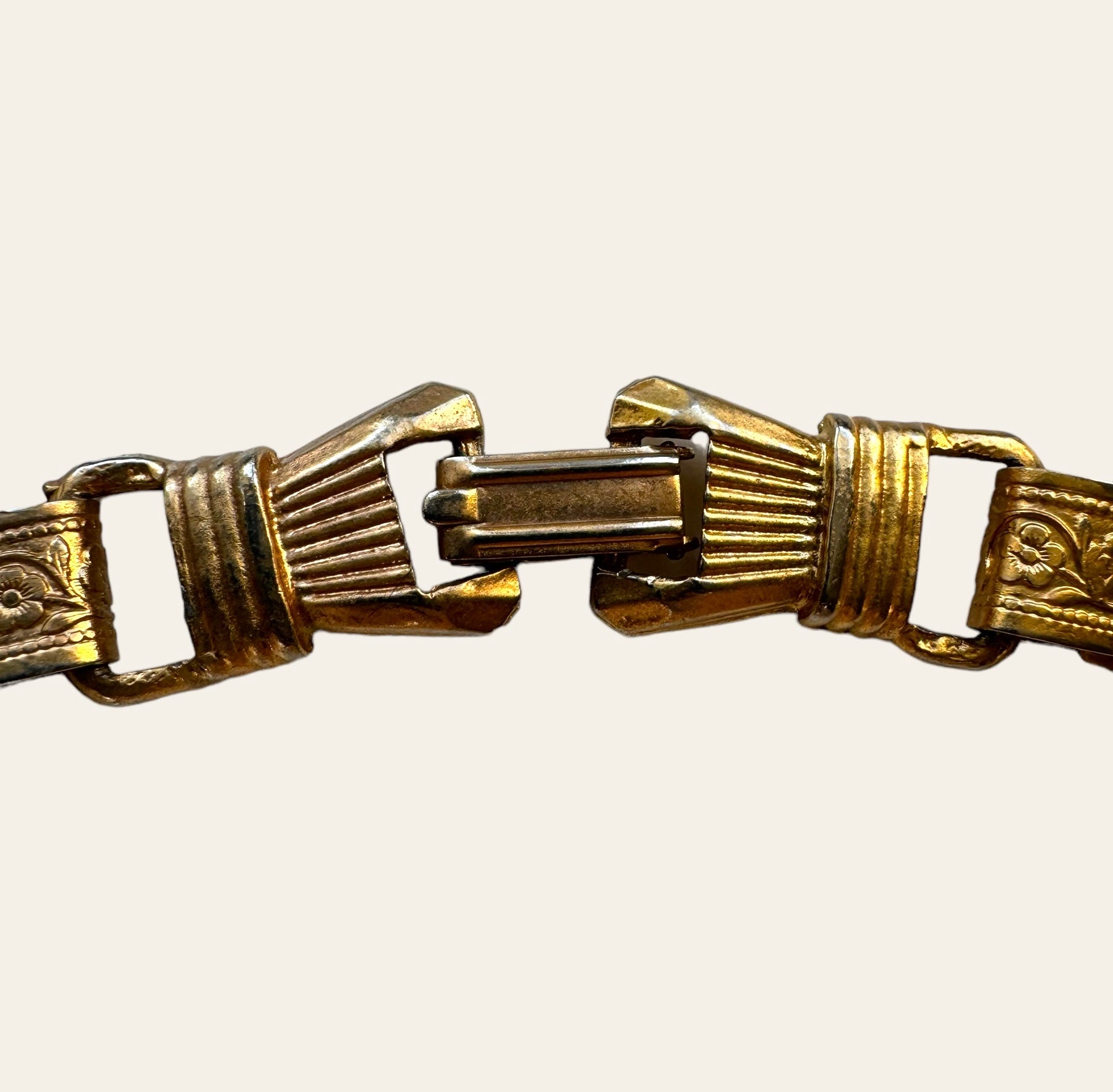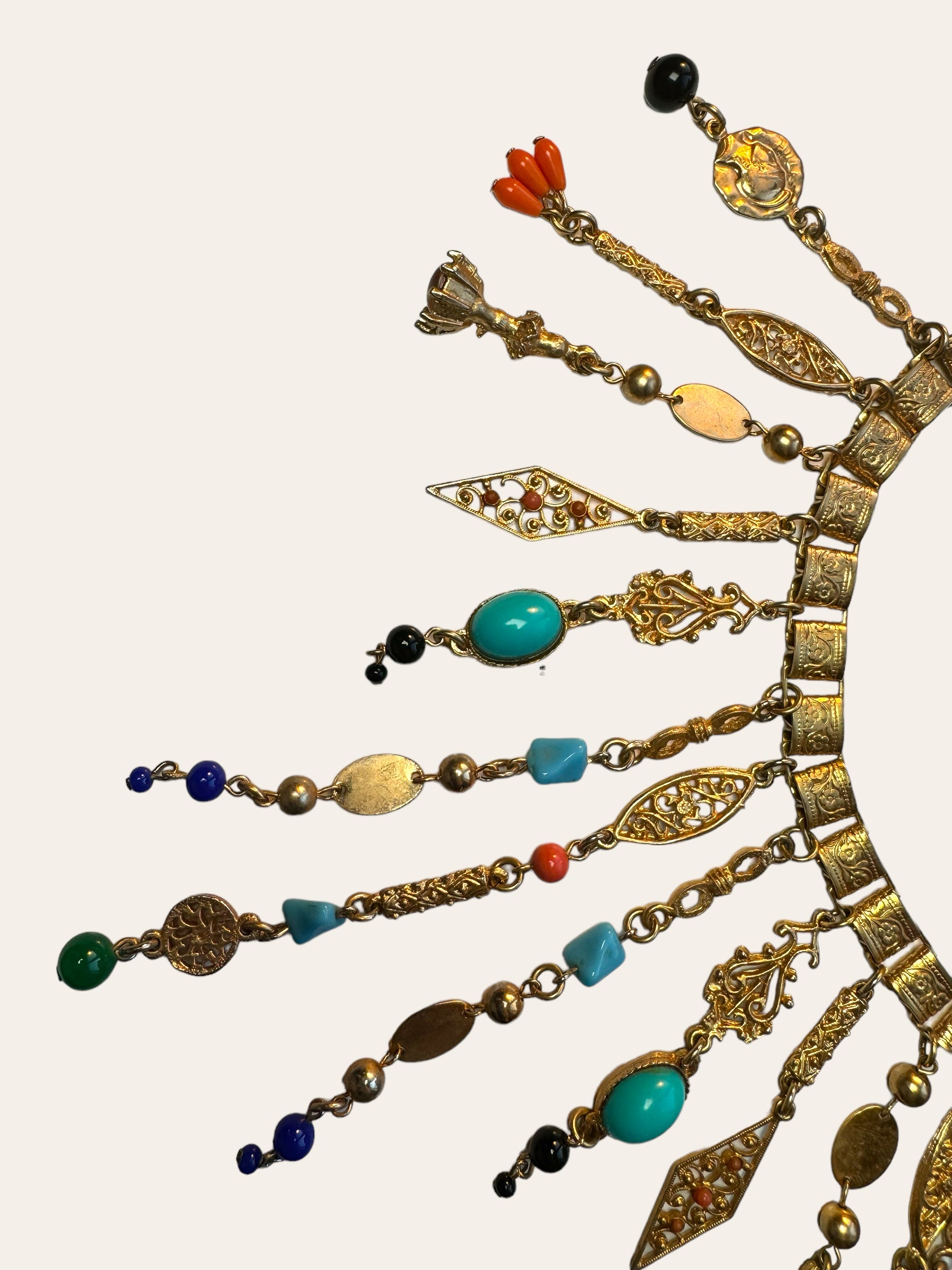 Unsigned necklace from the 1950's featuring glass beads and other elements. Pictures are part of the description.It emanates antiquity and is a statement piece. A Romy's fav!