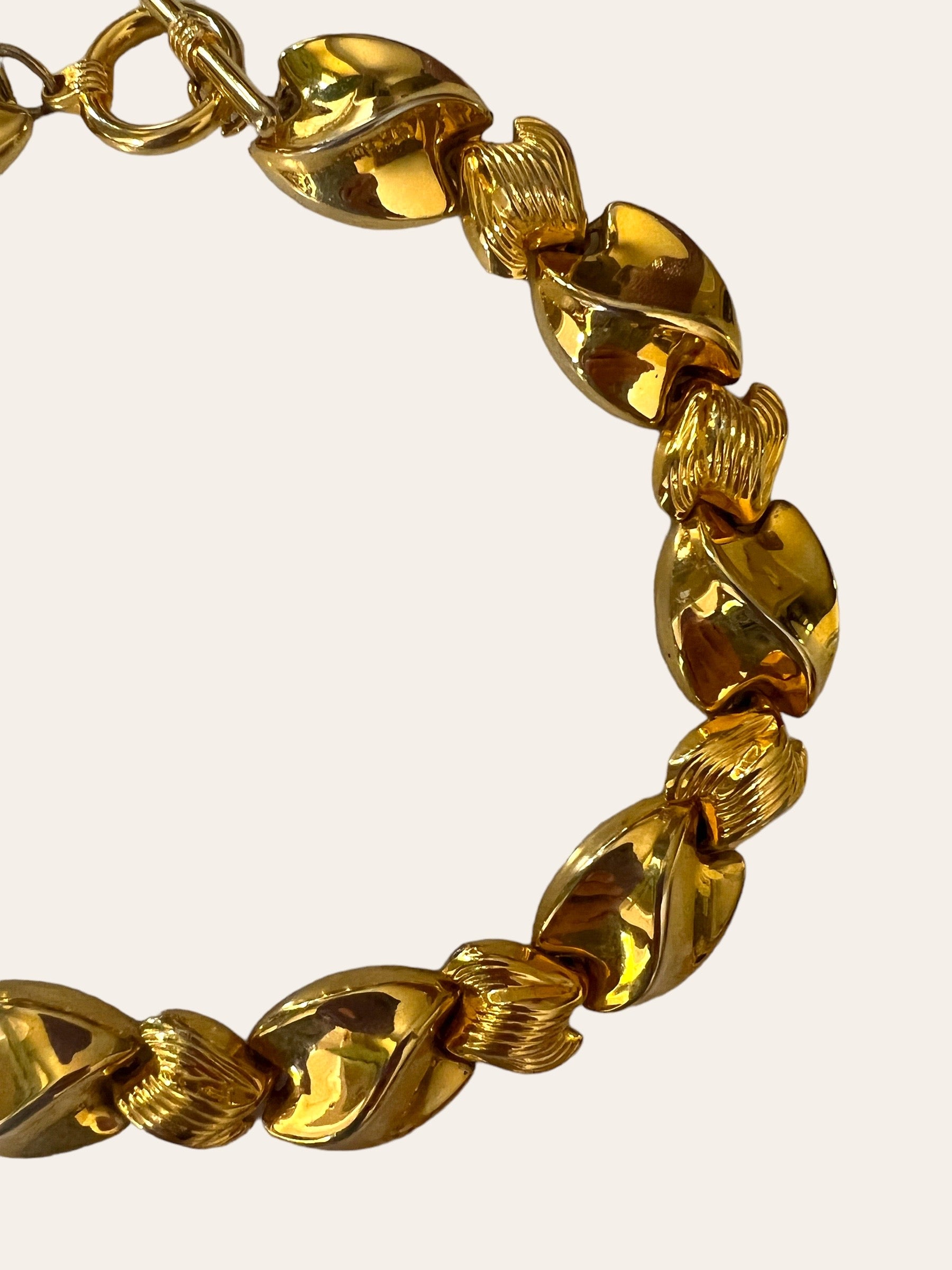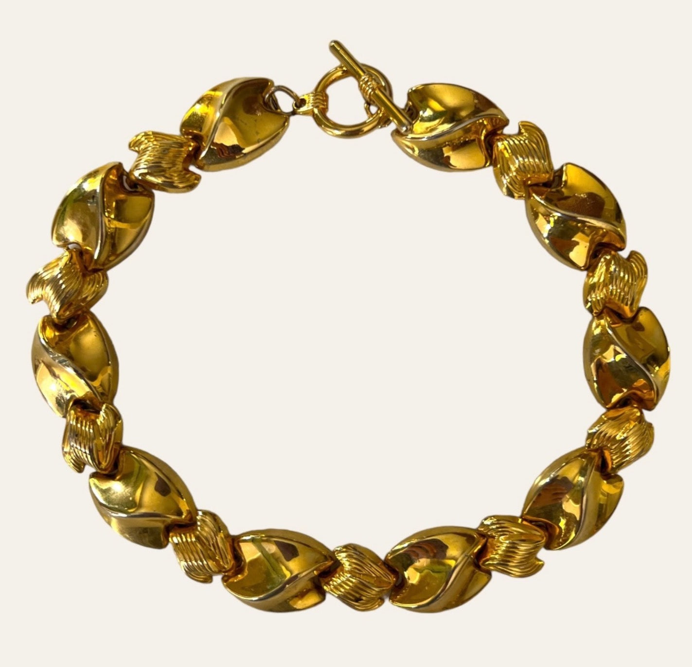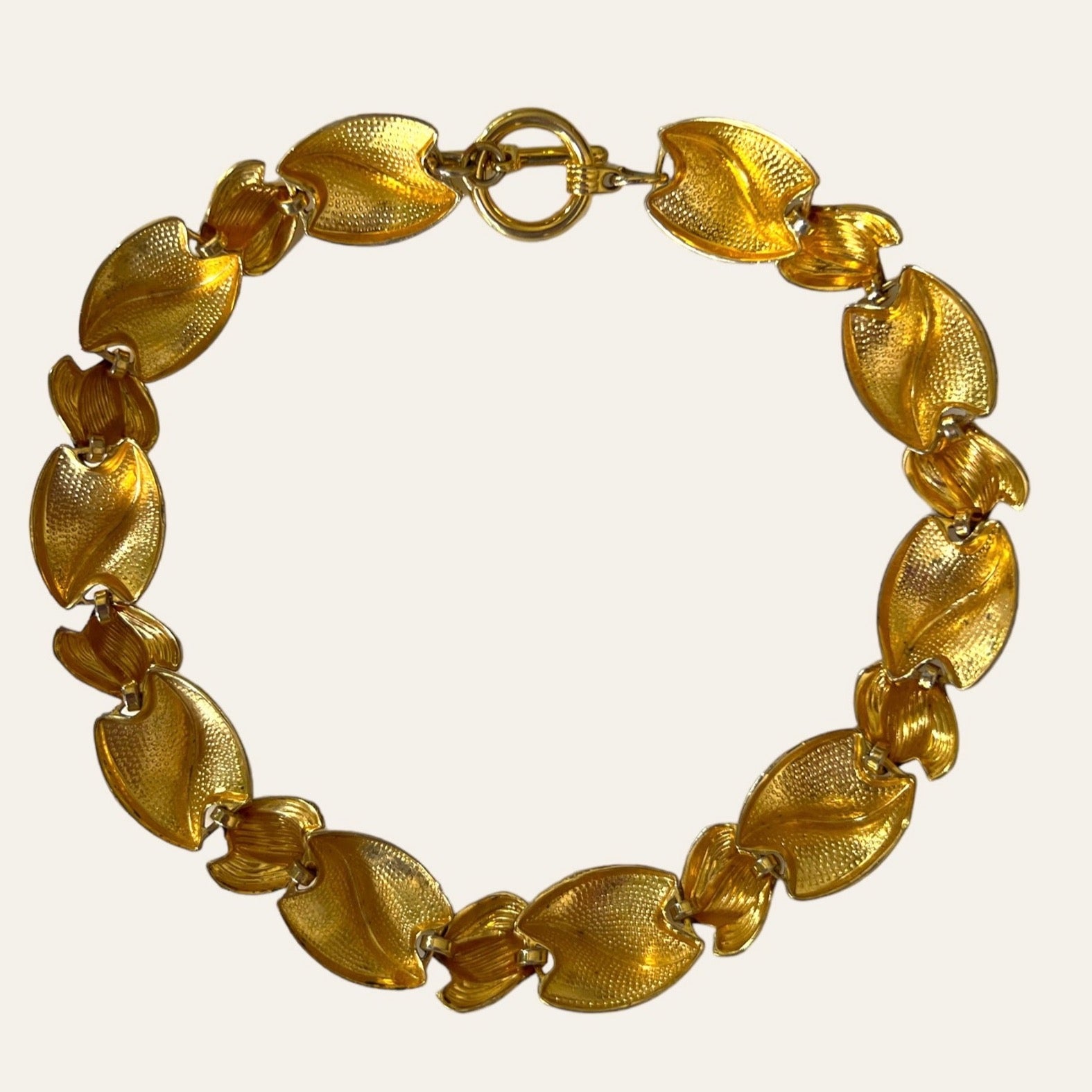 Unsigned gold tone chunky collar. It is so beautiful on the neck!