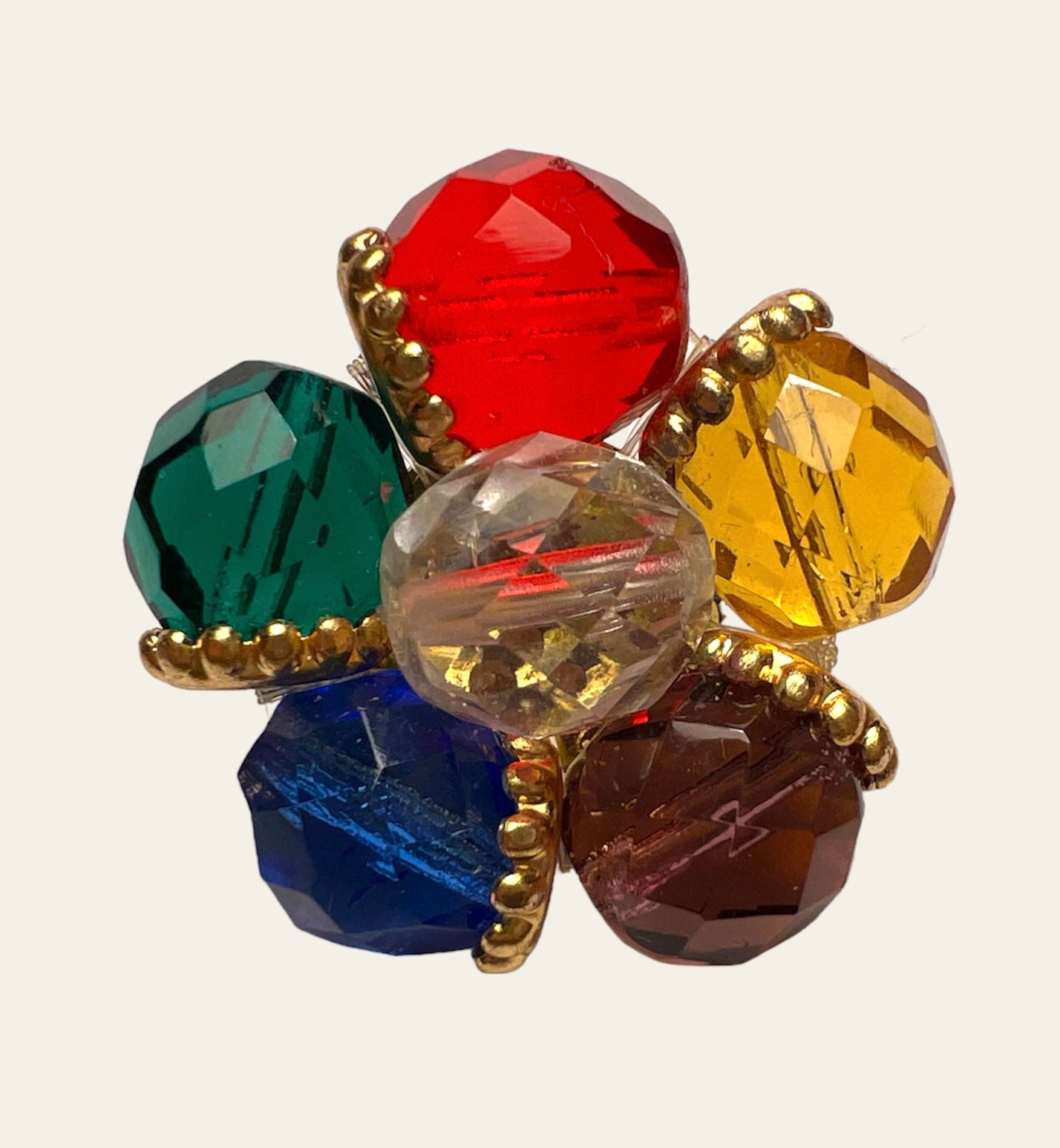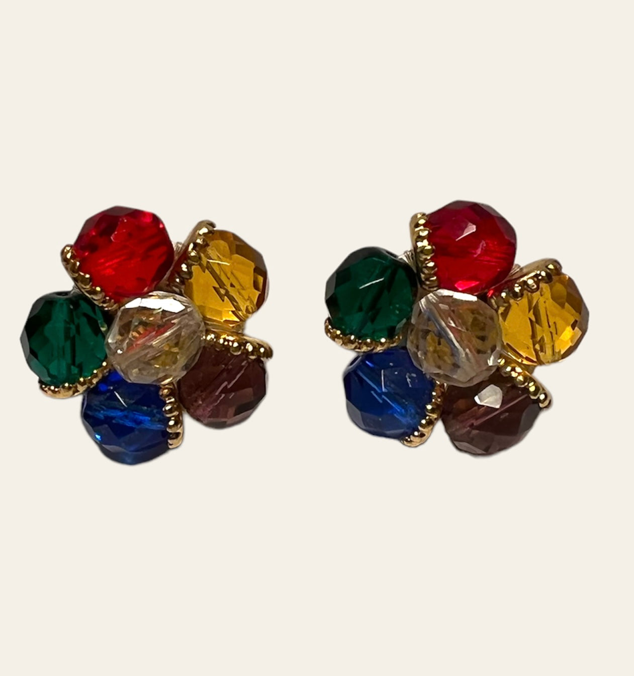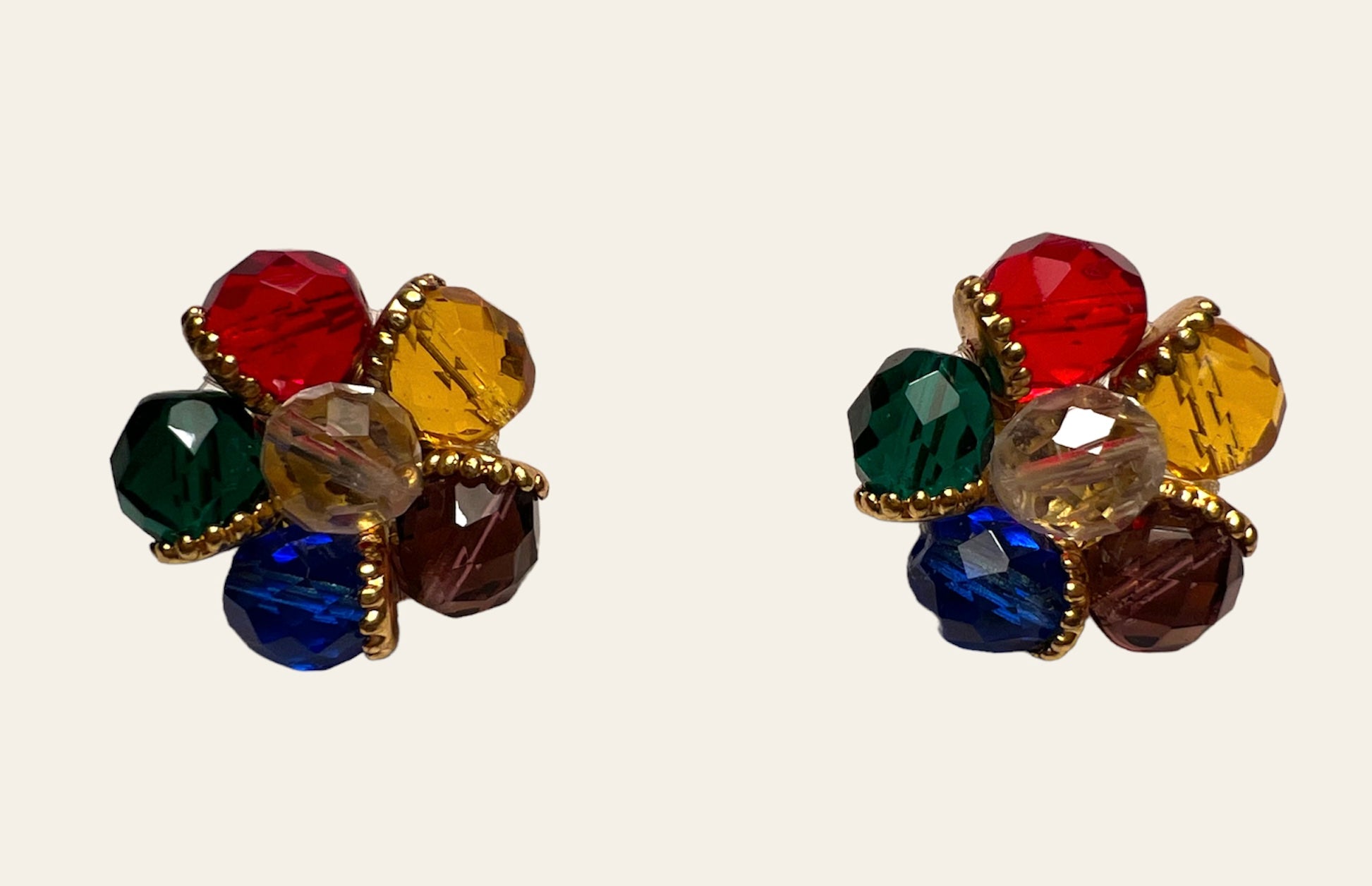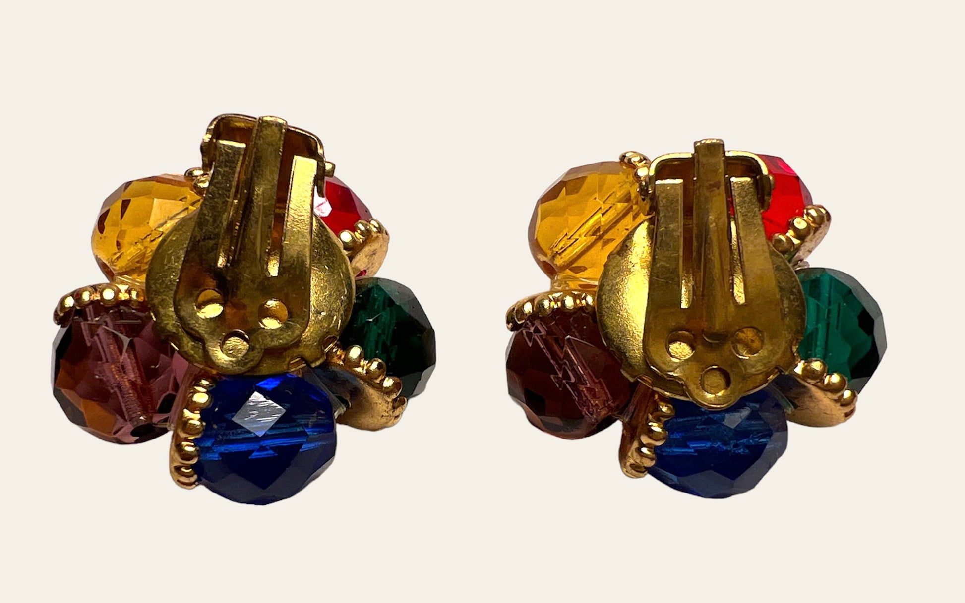Unmarked Post War multicoloured (red, green, yellow, blue and purple) clip on earrings.