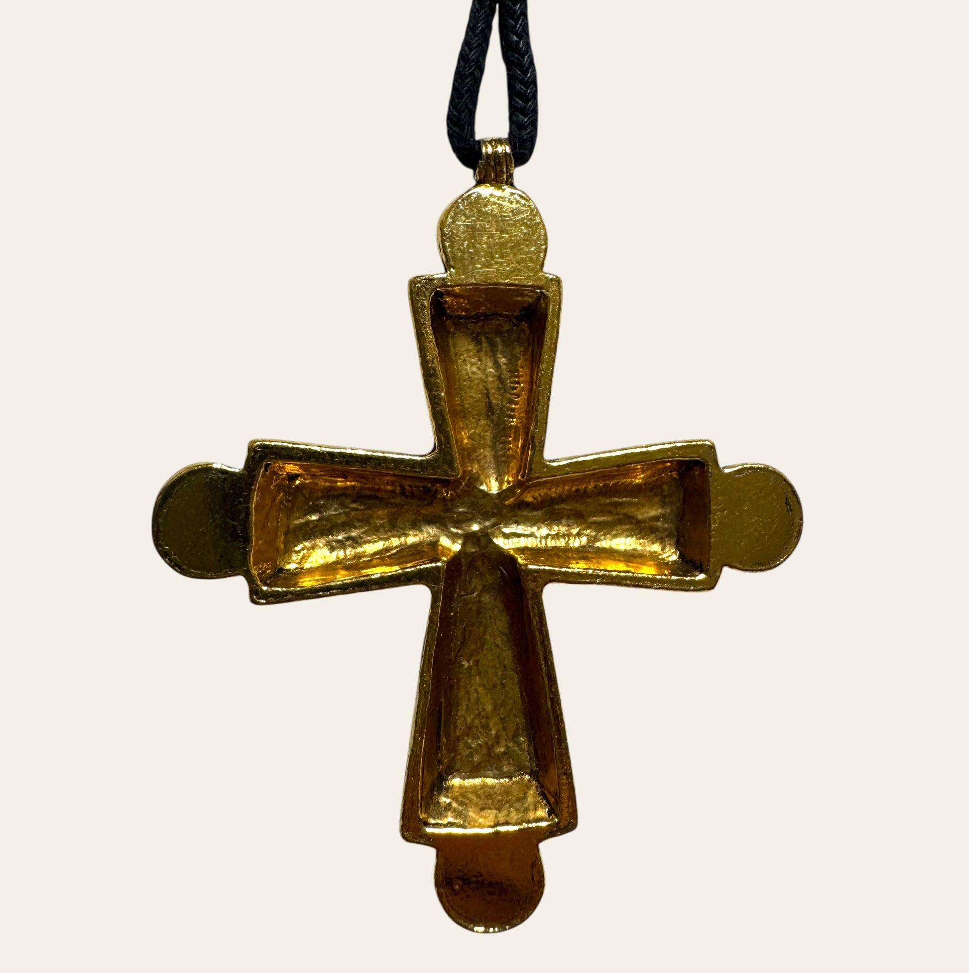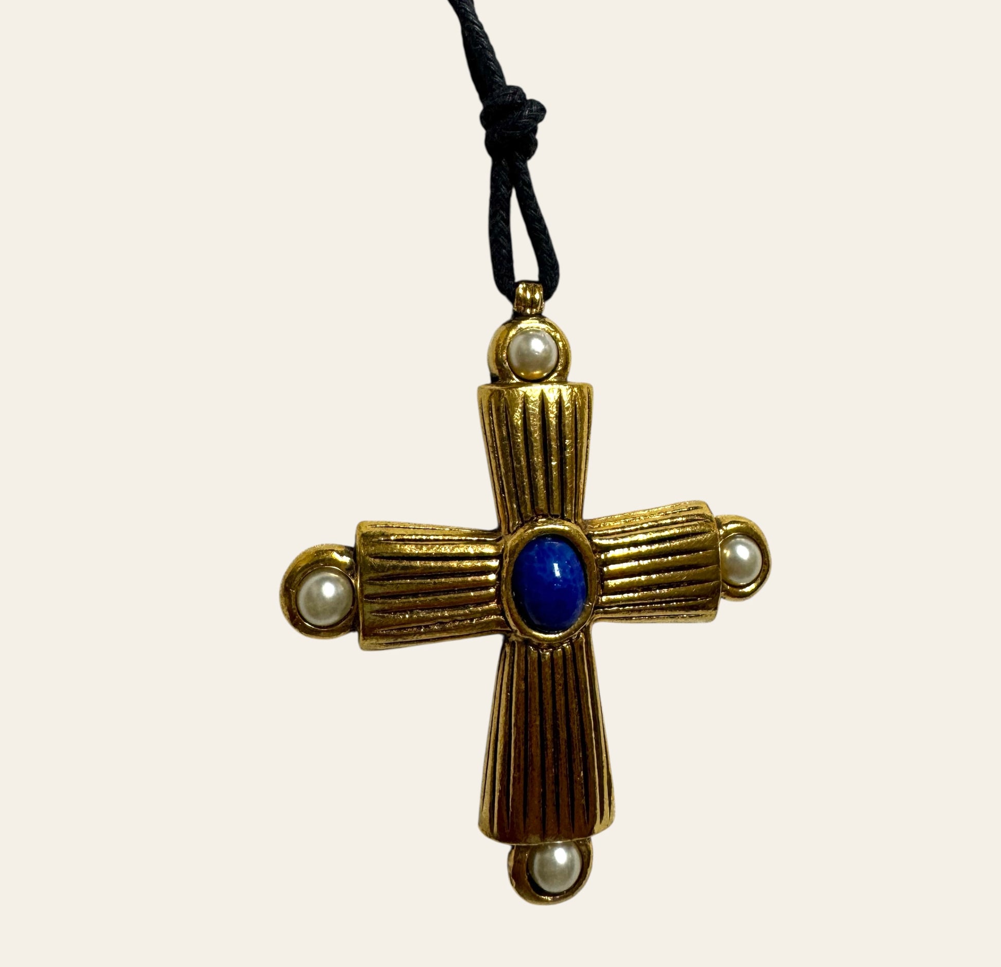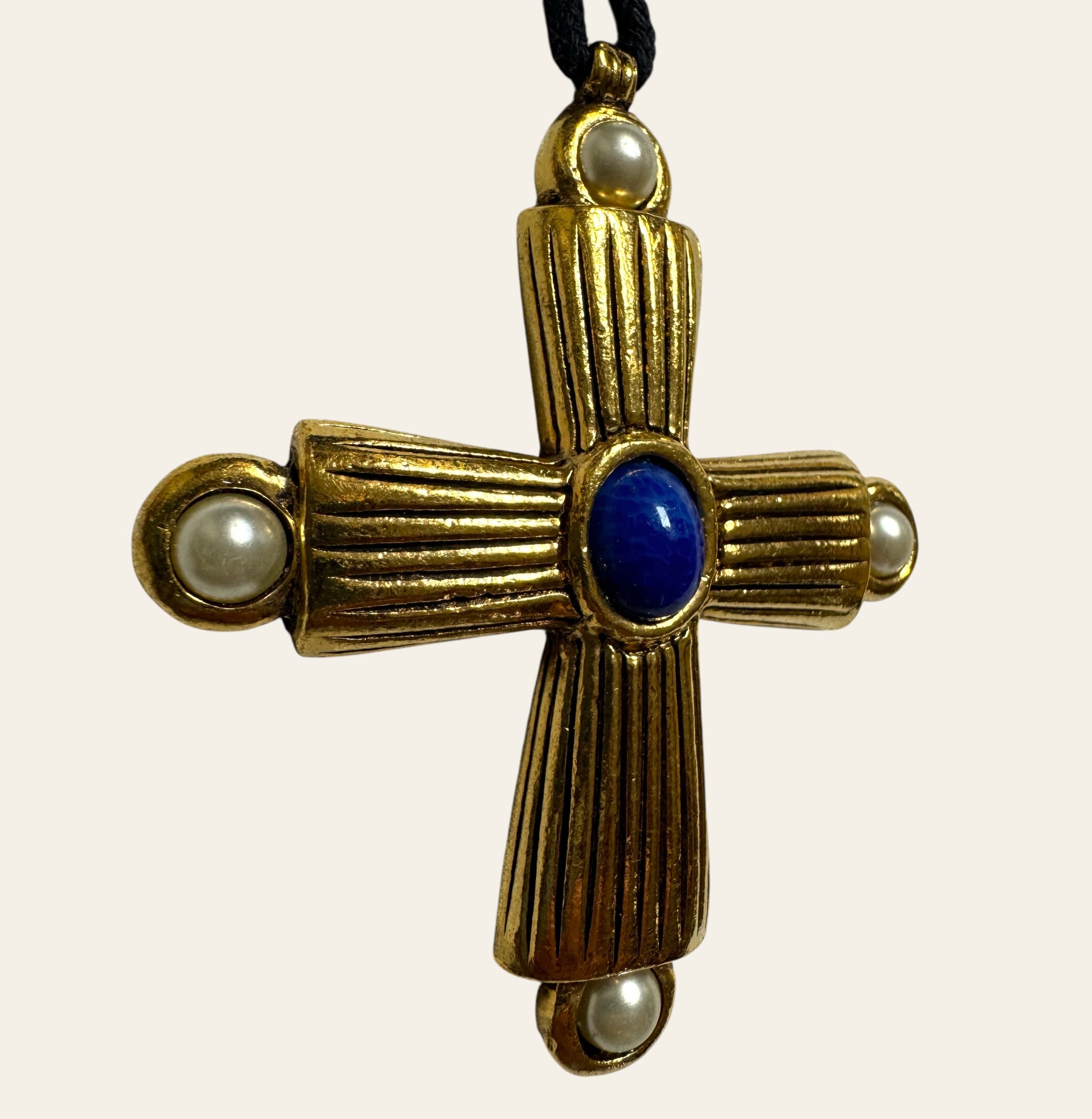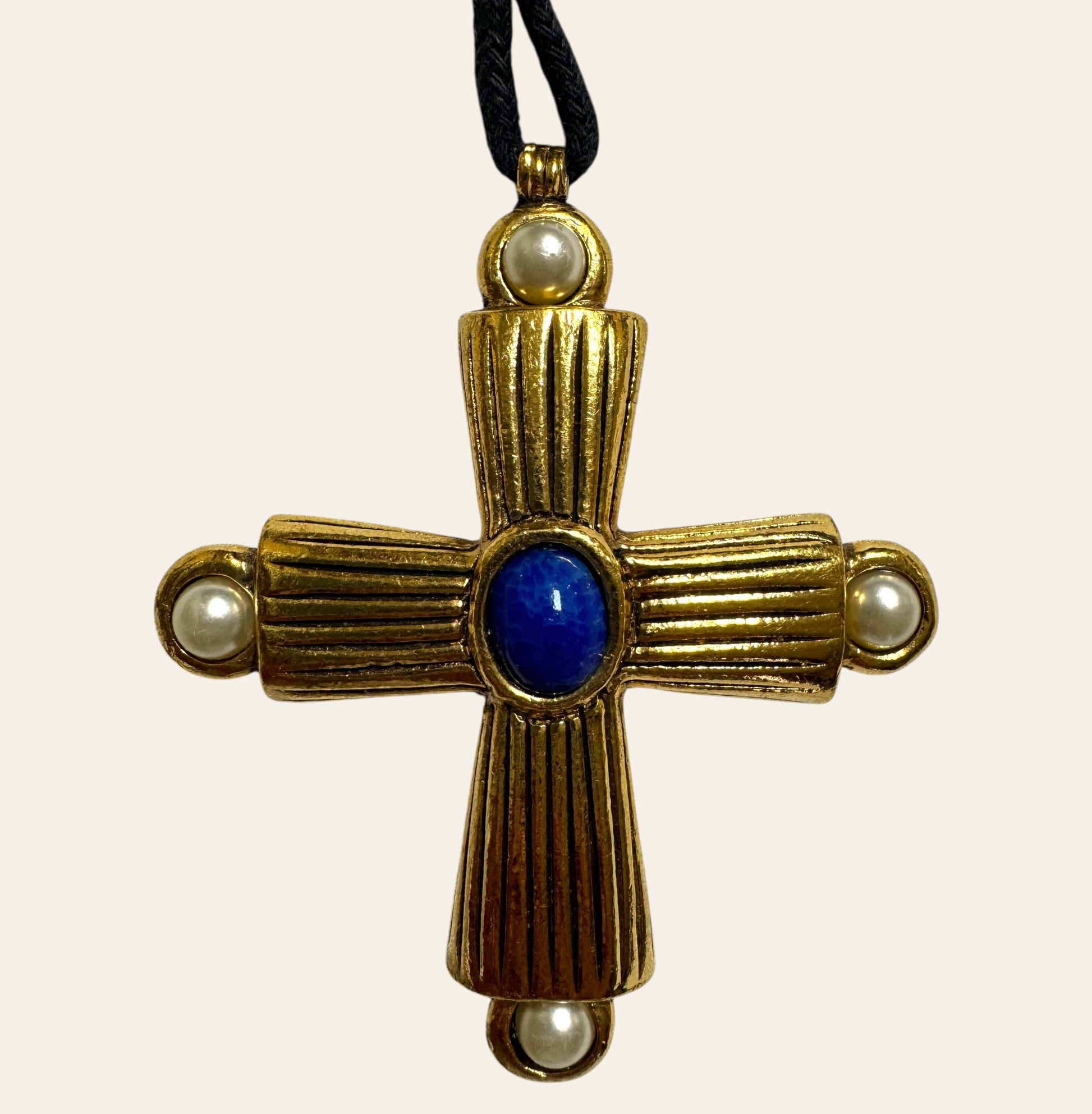 This statement runway Cross evoking the splendor of a medieval reliquary, is cast in warm, antique gold-toned metal with a bold, ribbed texture. At the heart of the cross lies a deep lapis-blue cabochon, radiant and regal. Each arm of the cross is crowned with a luminous faux pearl, softening the structure with graceful femininity. The result is a balance between sacred geometry and vintage glamour. Black cord is included (can be replaced with a chain for styling versatility.