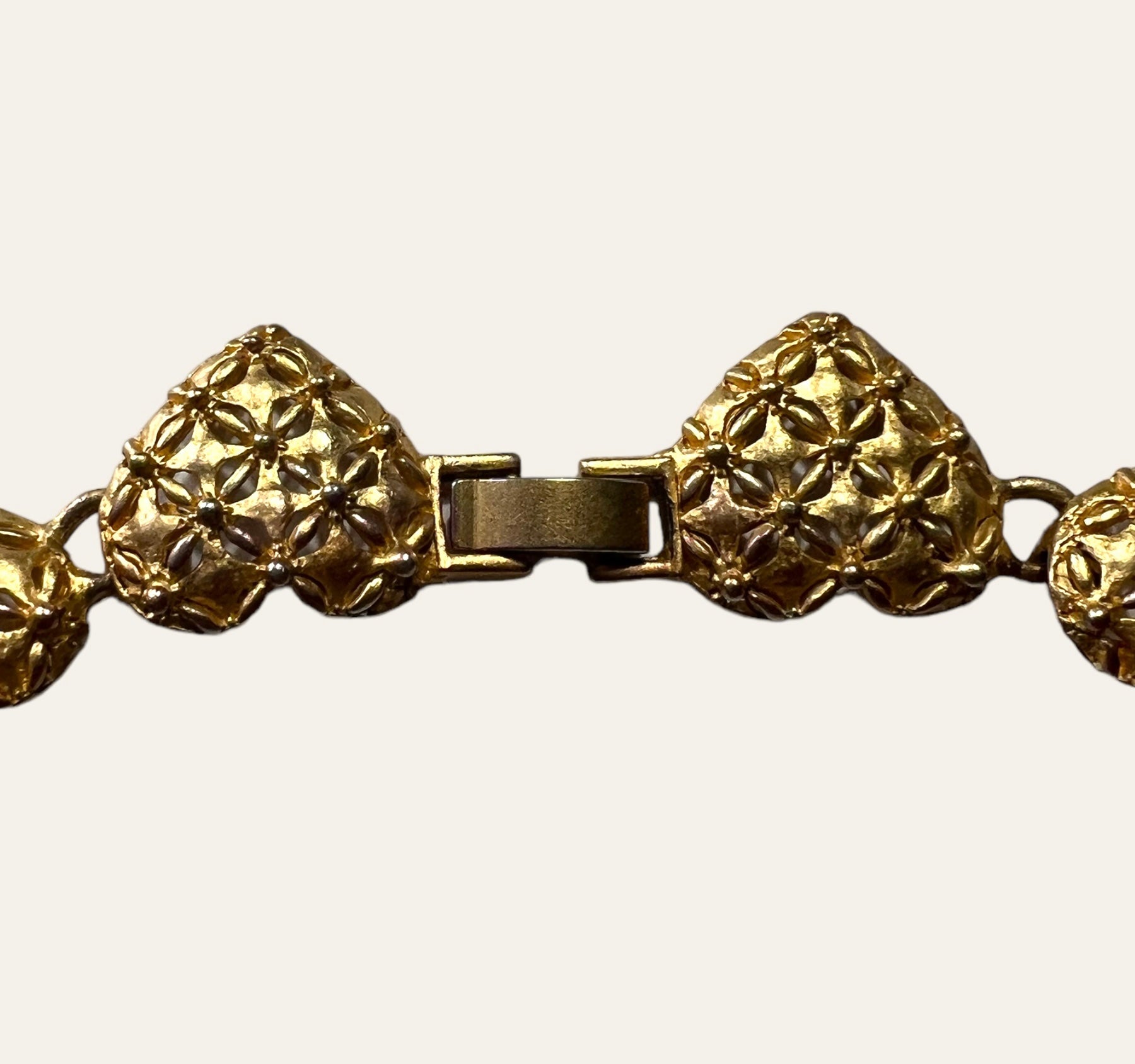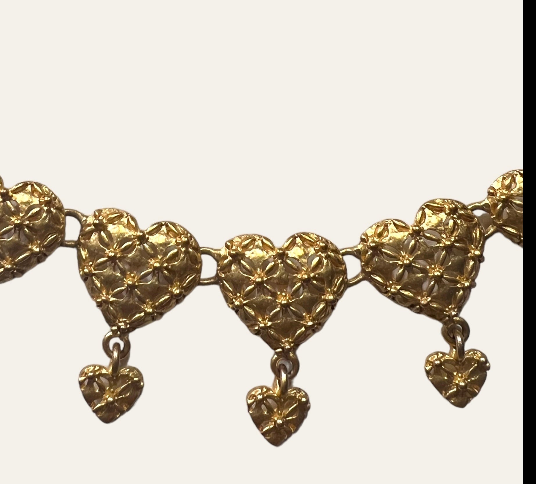 This is a lovely unsigned vintage filigree gold tone heart link necklace with dangling heart charms. SO pretty and cute!