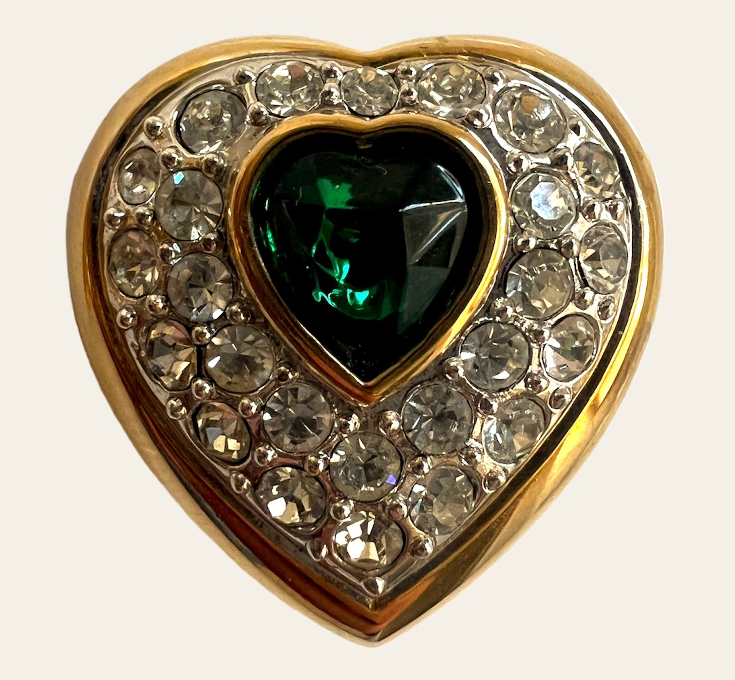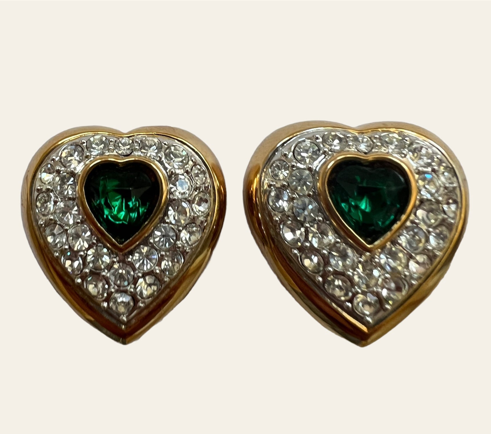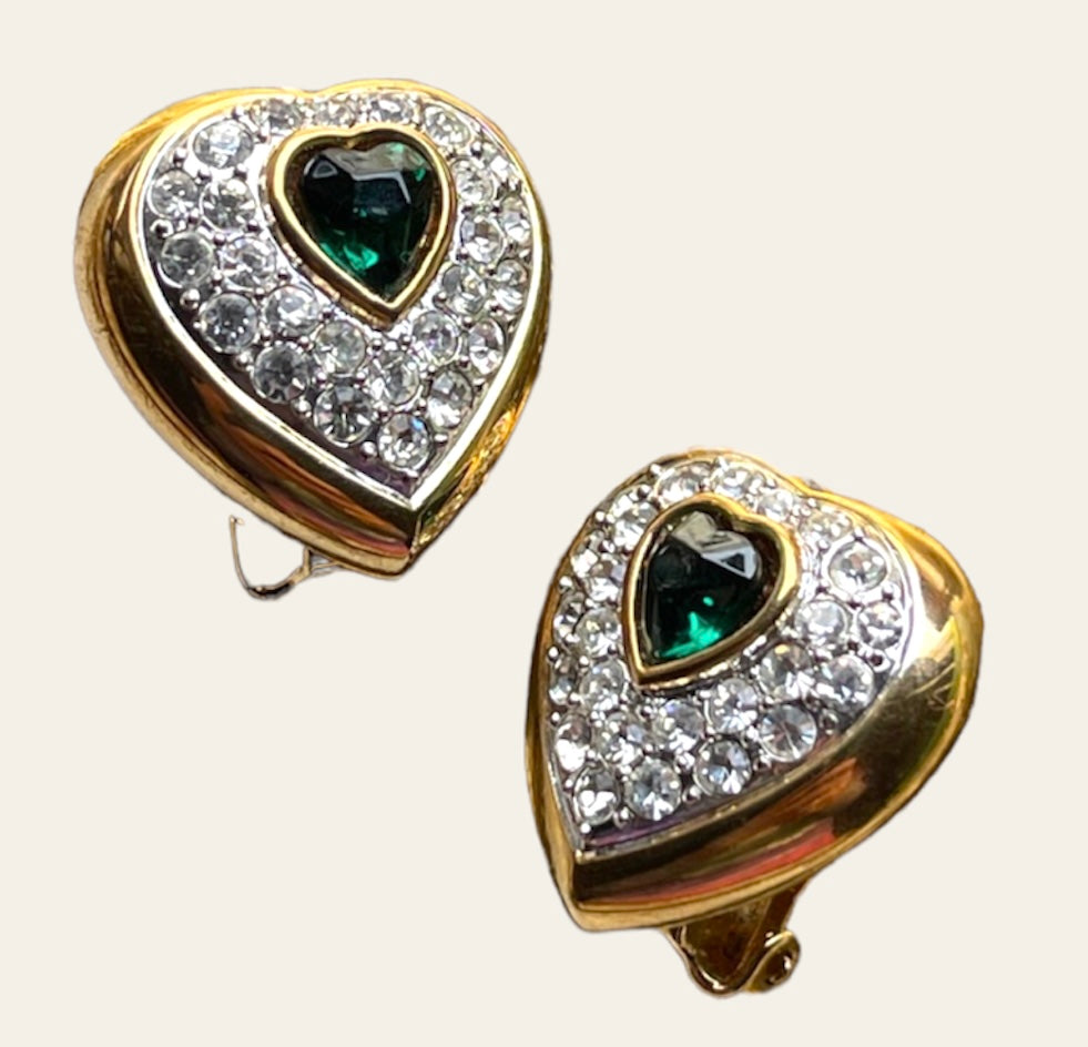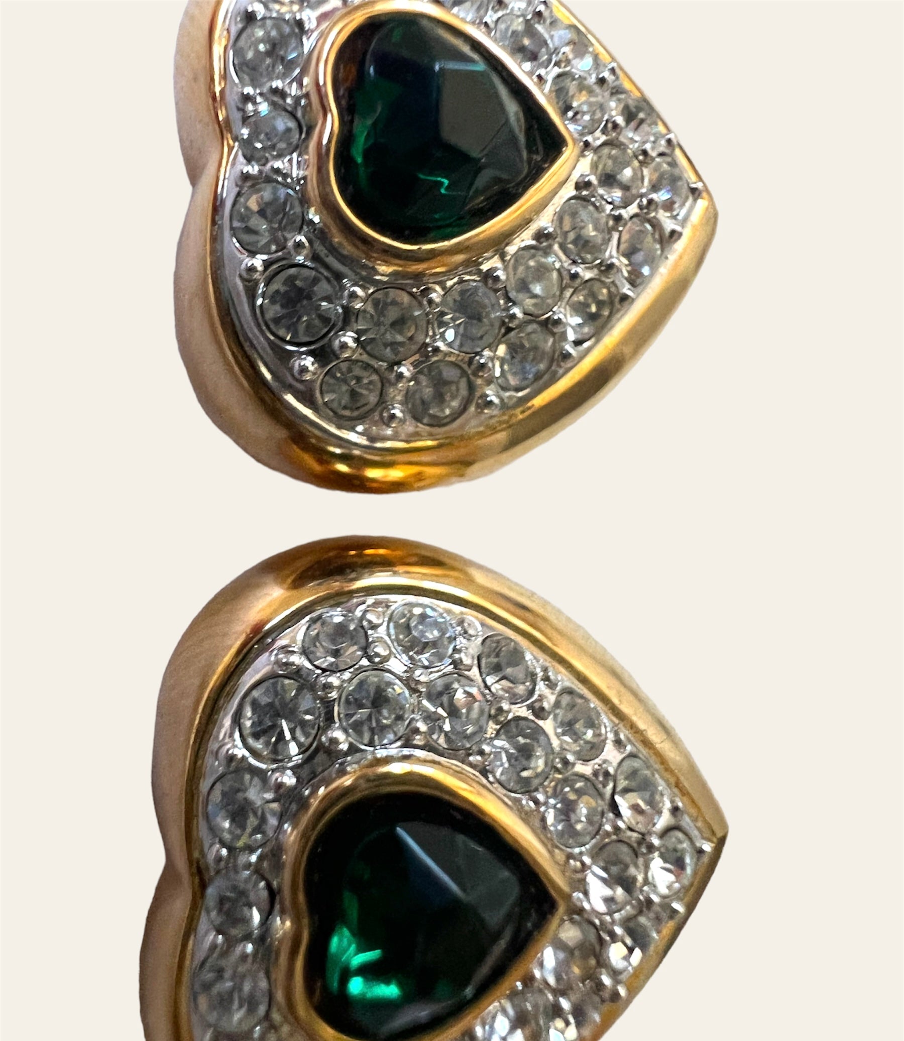 Sparkling unmarked Clip On Heart Shaped Earrings in a gold tone and rhinestones with a crystal green heart in the centre.