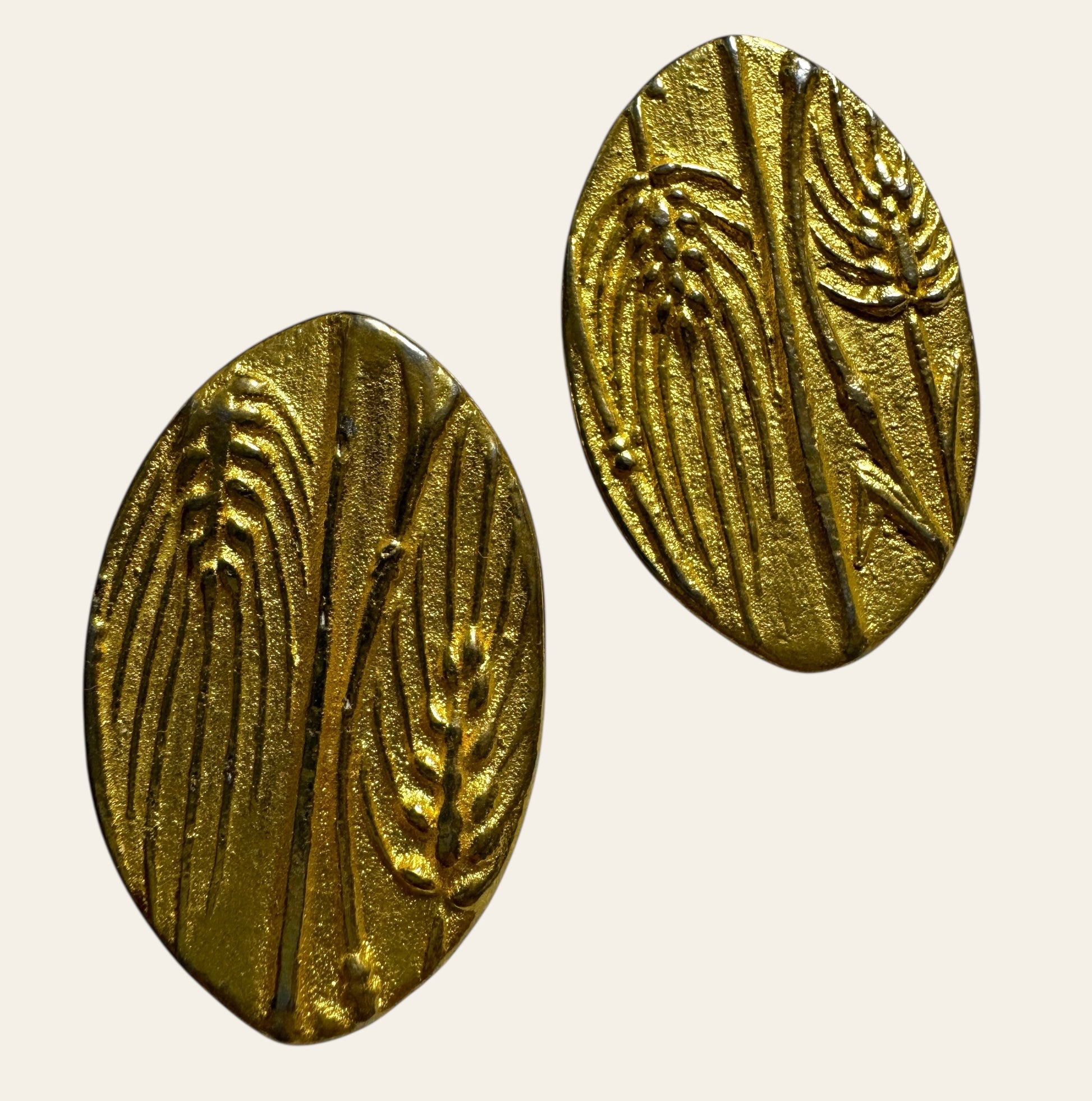 A rare and elegant pair of oval shaped vintage clip-on earrings cast in a rich, brushed gold-tone finish, embossed with the timeless motif of wheat stalks, a sacred symbol of harvest, fertility, and divine abundance. Each earring features a minimalist relief of golden wheat, rendered with fluid, vertical lines that evoke both nature and ancient artifact. The subtle oval shape gives a refined, sculptural feel—evoking Phoenician seals, Byzantine tokens, or sun-drenched fields in high summer.