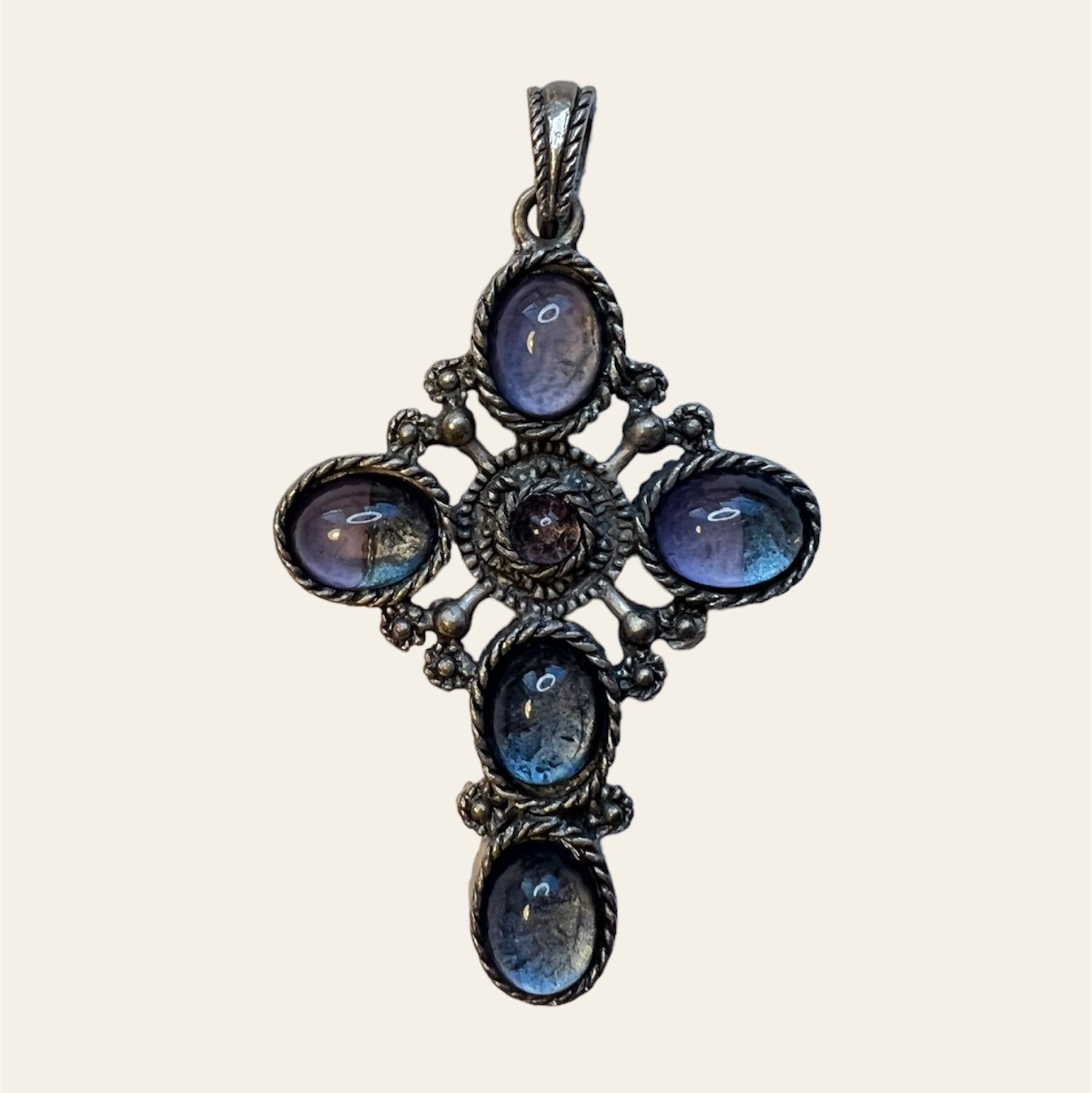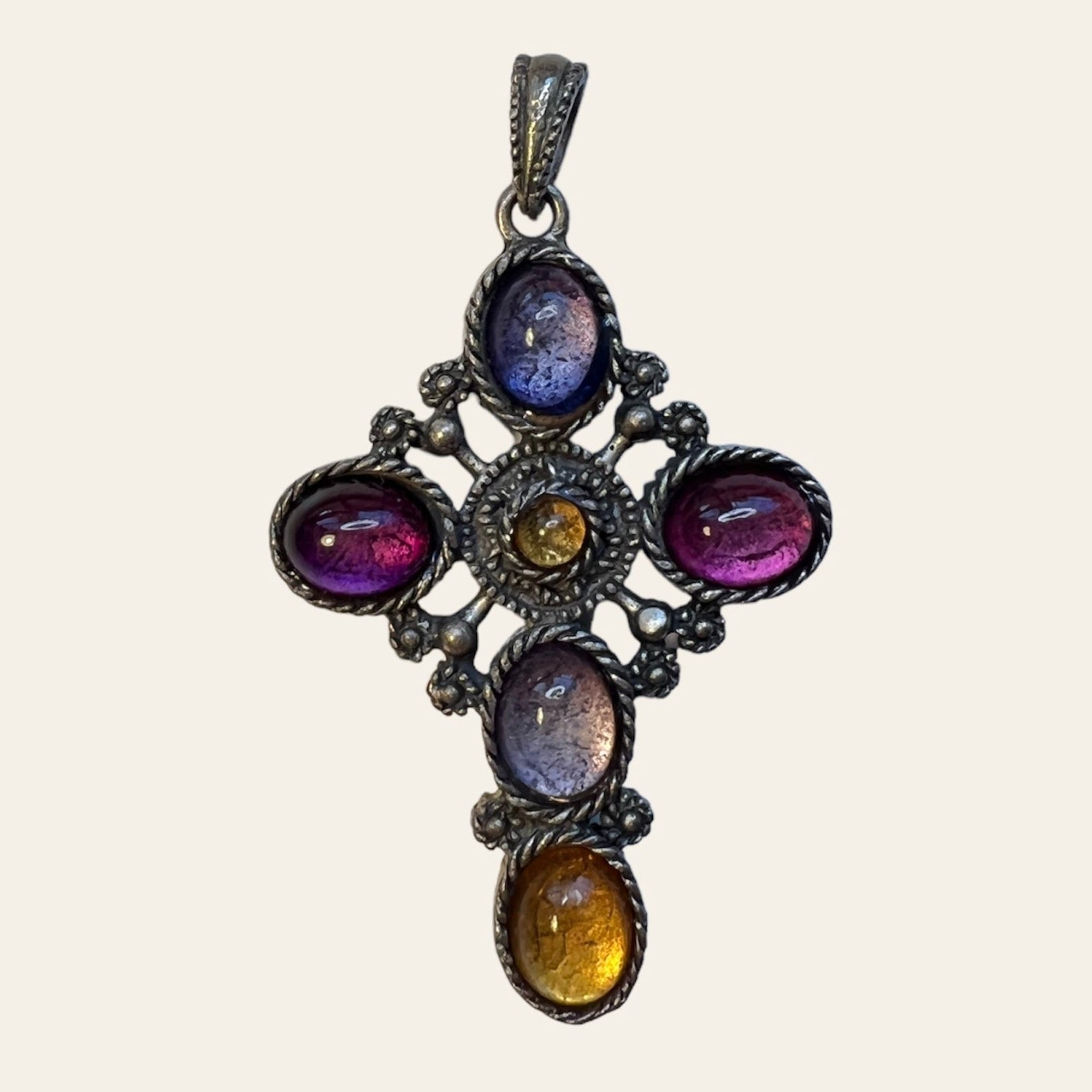 Two-sided silver tone Cross with purple, yellow and hot pink stones.