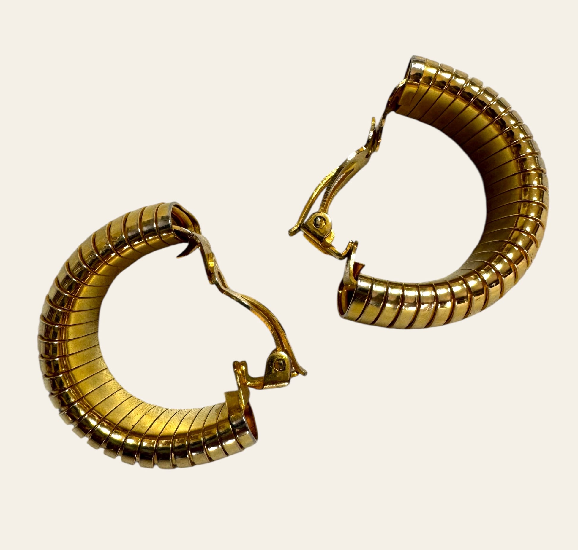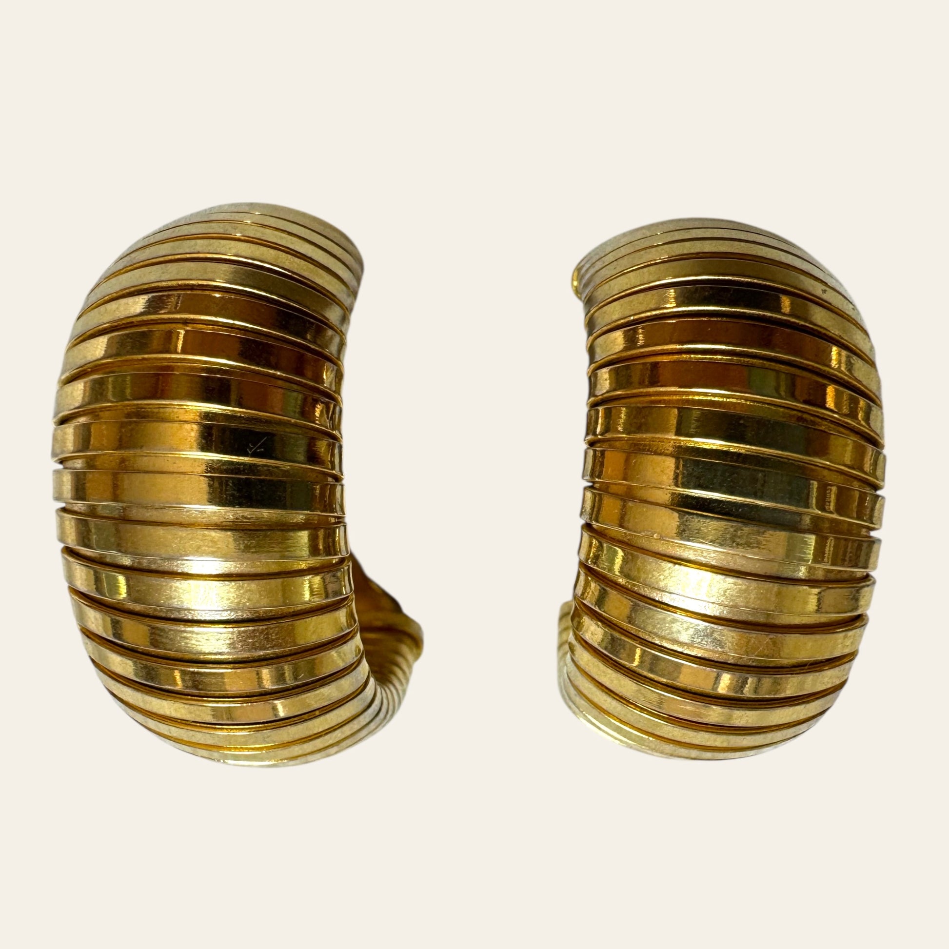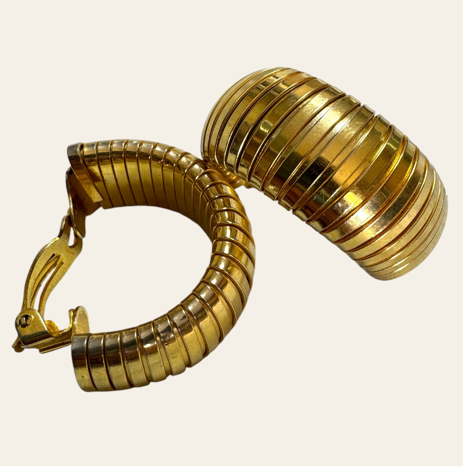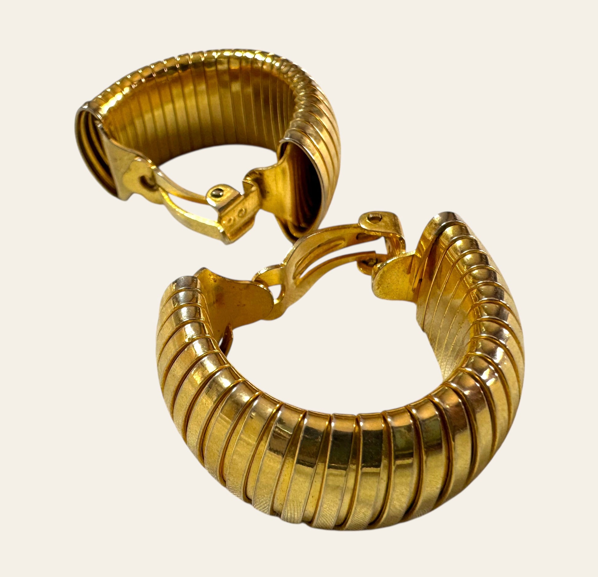 Sculptural and striking, these vintage hoop clip on earrings feature a bold ribbed design in a radiant gold-tone finish. Their domed silhouette and structured lines offer a retro elegance. Romy's fav timeless with a powerful 1980s edge.