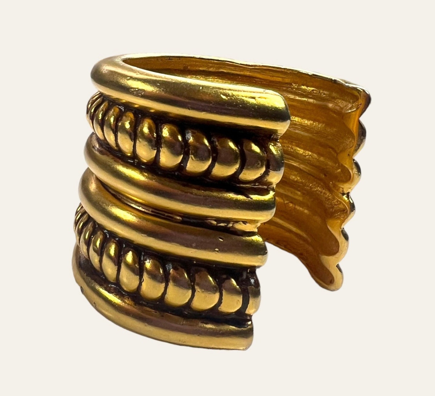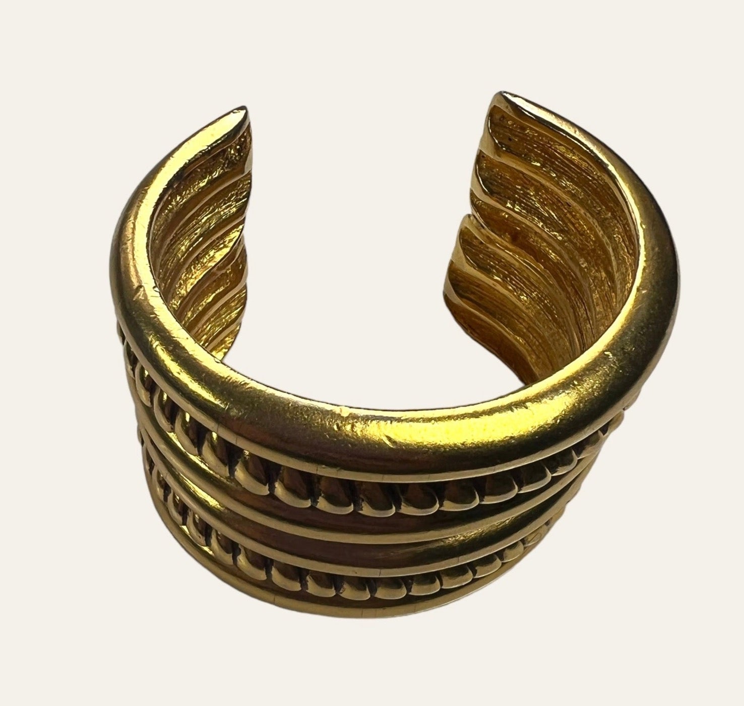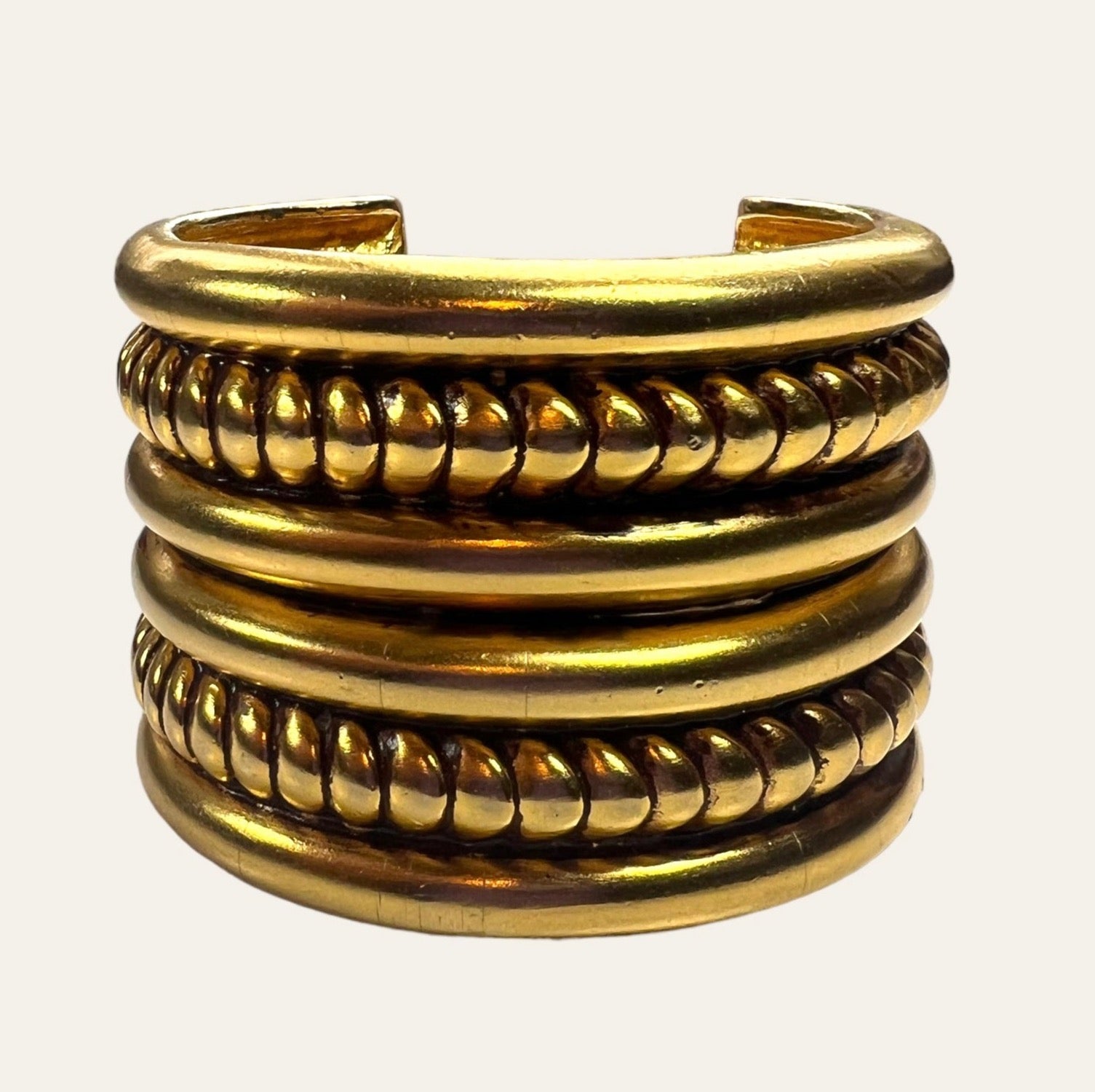 Unsigned stunning eye-catching cuff bracelet in a rich gold tone. Pictures are part of the description. It is heavy and looks expensive. A Romy's fav!