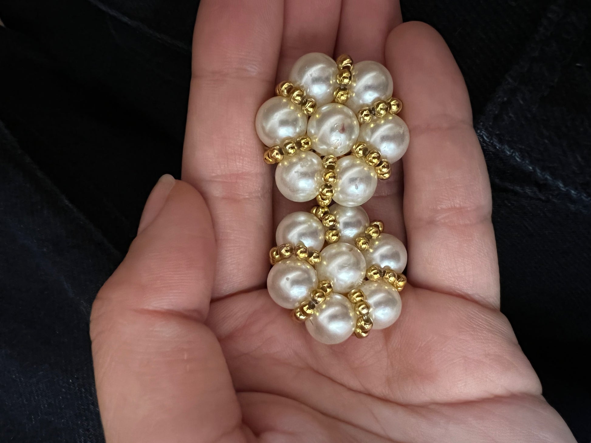 In good vintage condition. Clips are secure. However please check pictures as they are part of the description. The scratched one is the one I am wearing in the picture, so it's not really noticeable.