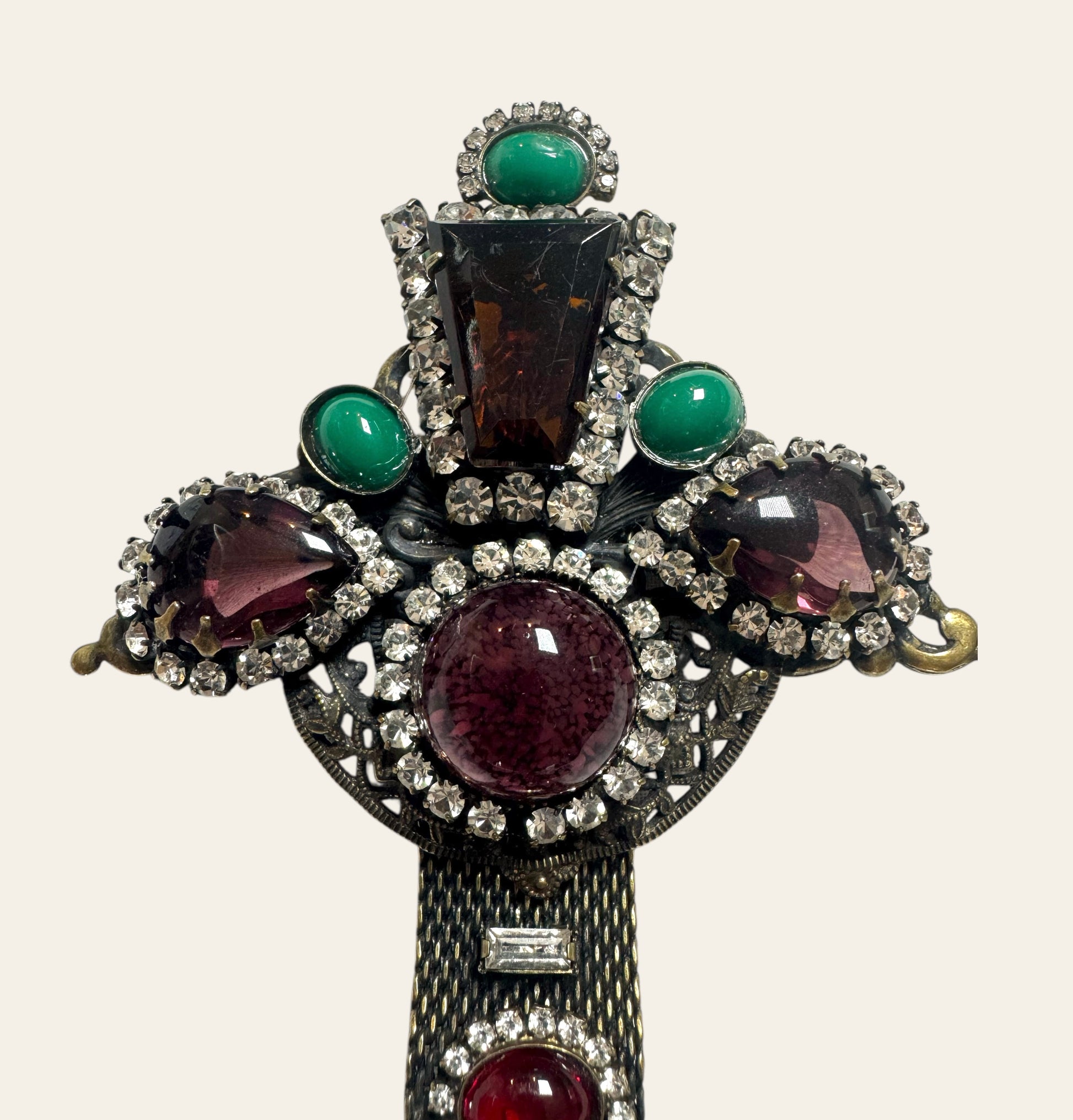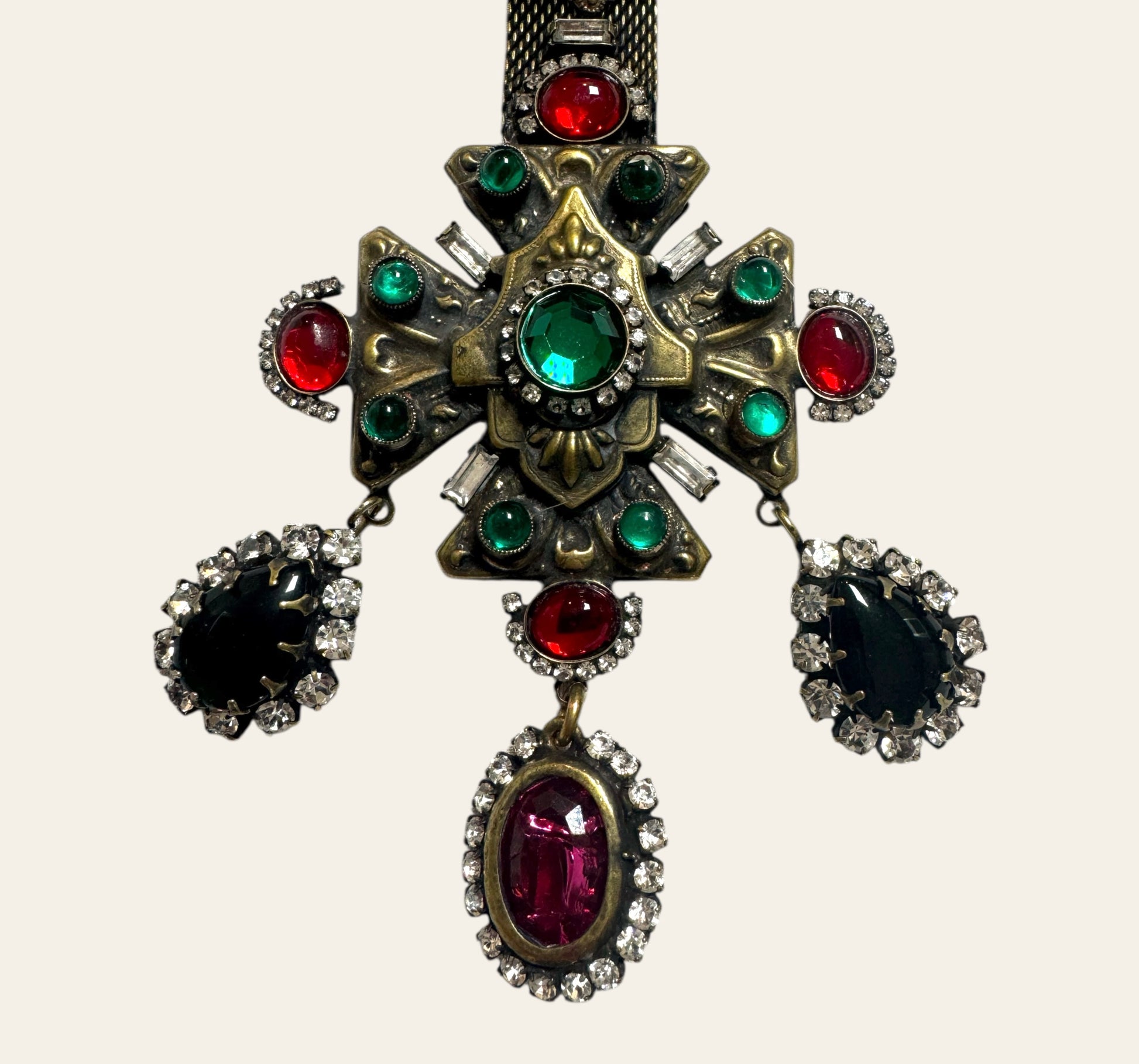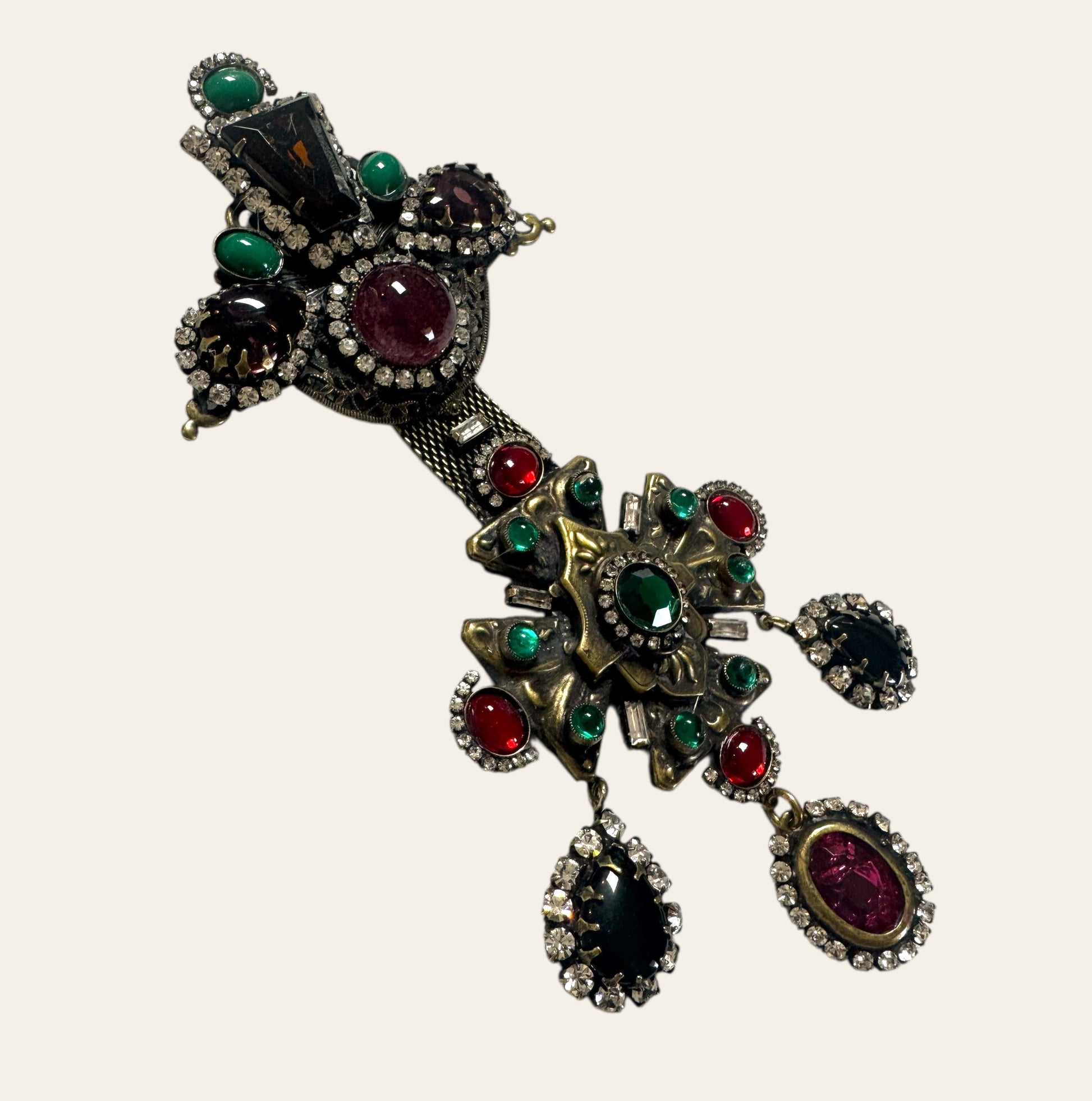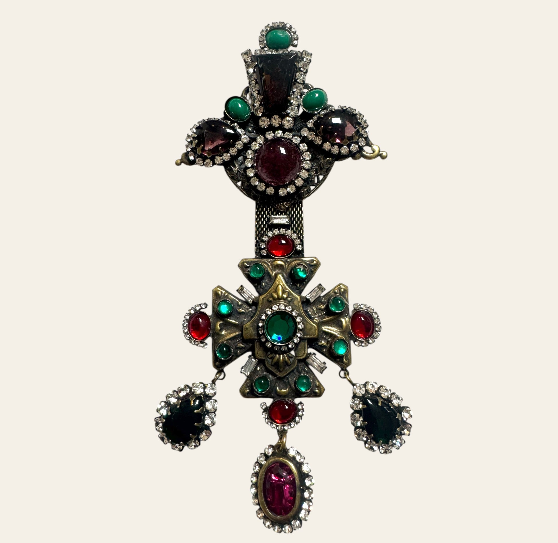 From the central cross extend three sumptuous dangles, one large magenta oval cabochon, flanked by dramatic teardrop stones rimmed in icy white rhinestones, adding movement and regality. The top half is a sculptural crown-like formation set with oversized burgundy and forest green stones, giving the entire piece a towering architectural presence.