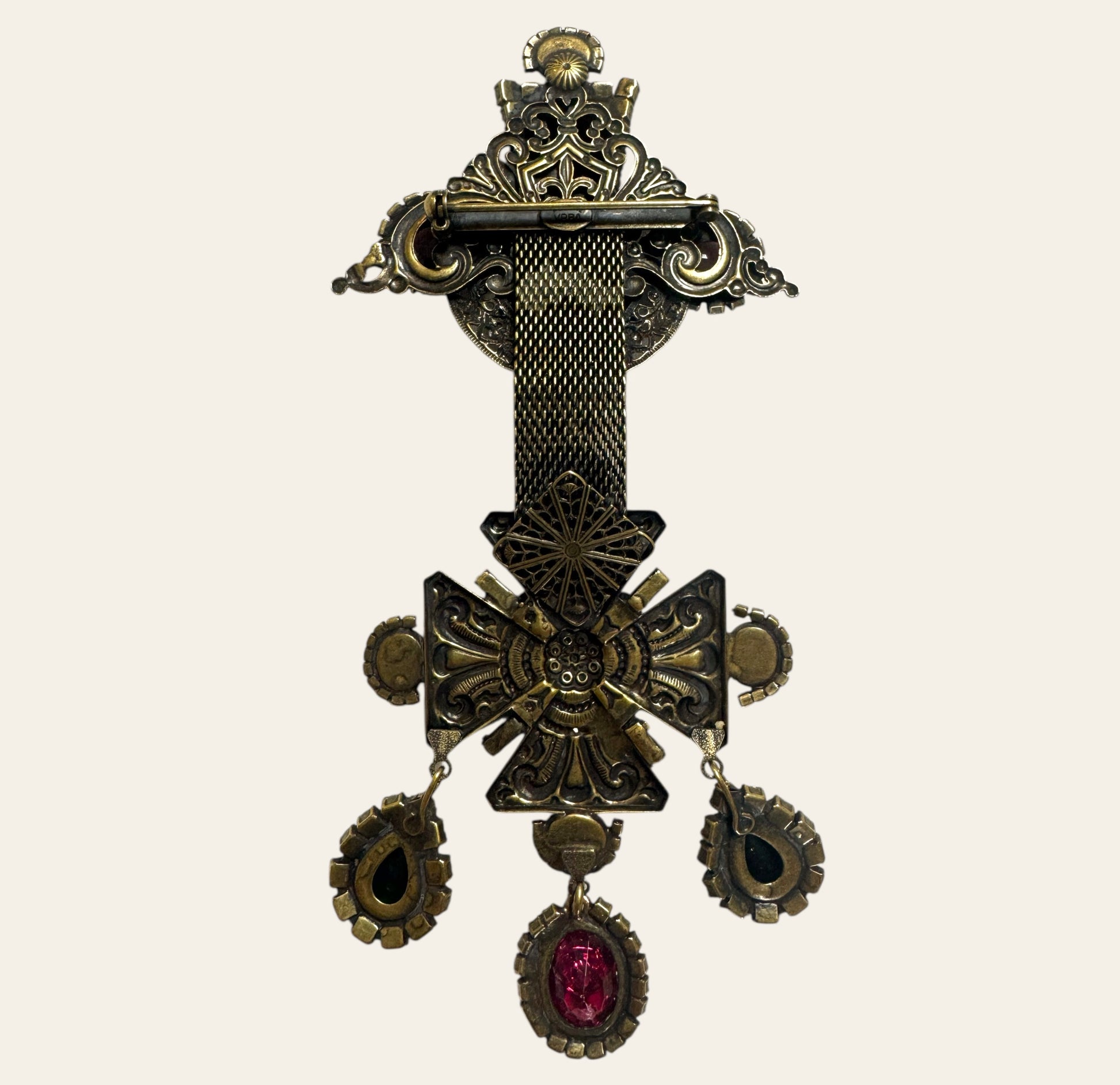 The reverse is equally ornate: engraved with intricate scrollwork, starburst engravings, and an openwork structure that reveals Vrba’s signature craftsmanship. The piece fastens securely with a horizontal pinback, designed to anchor its majestic weight.