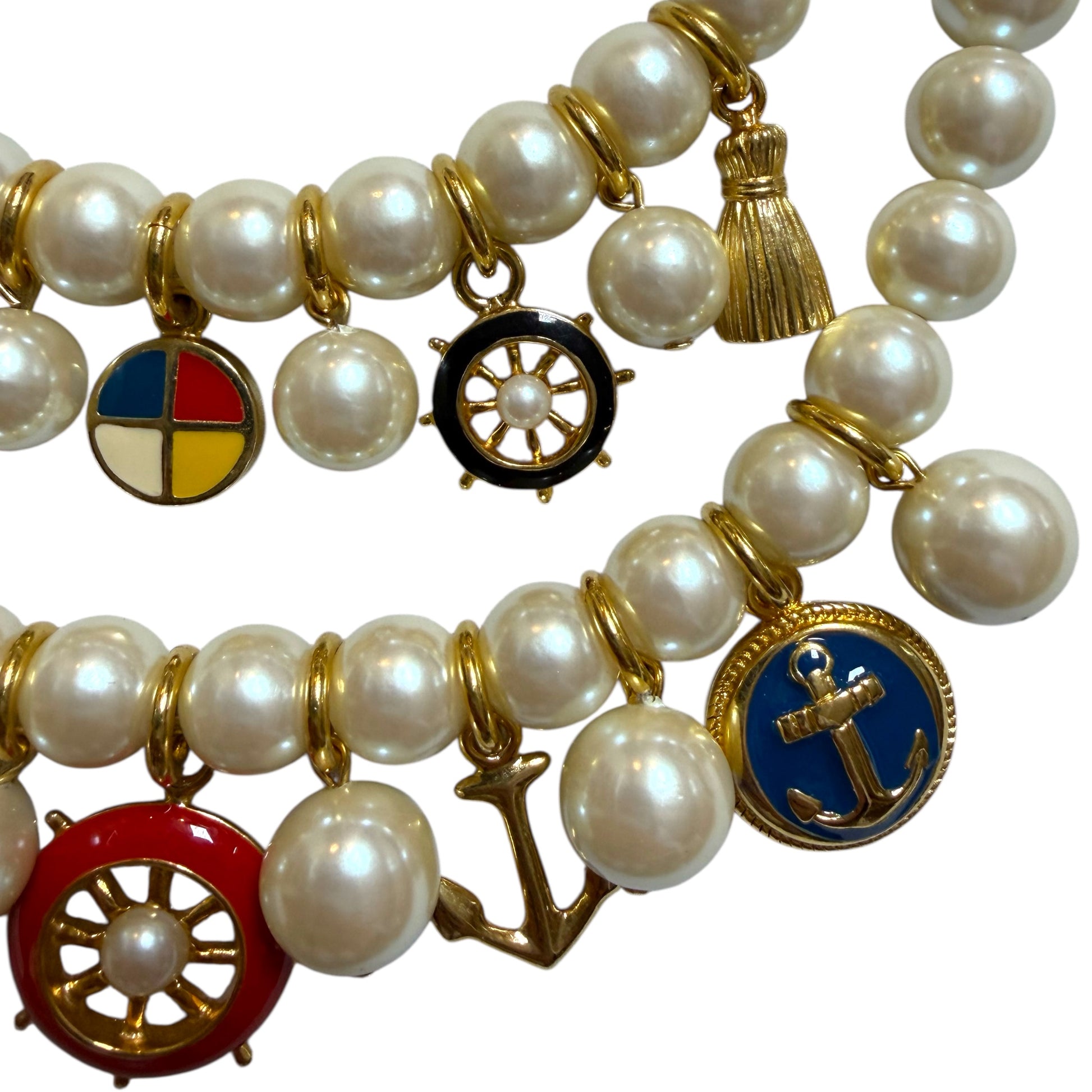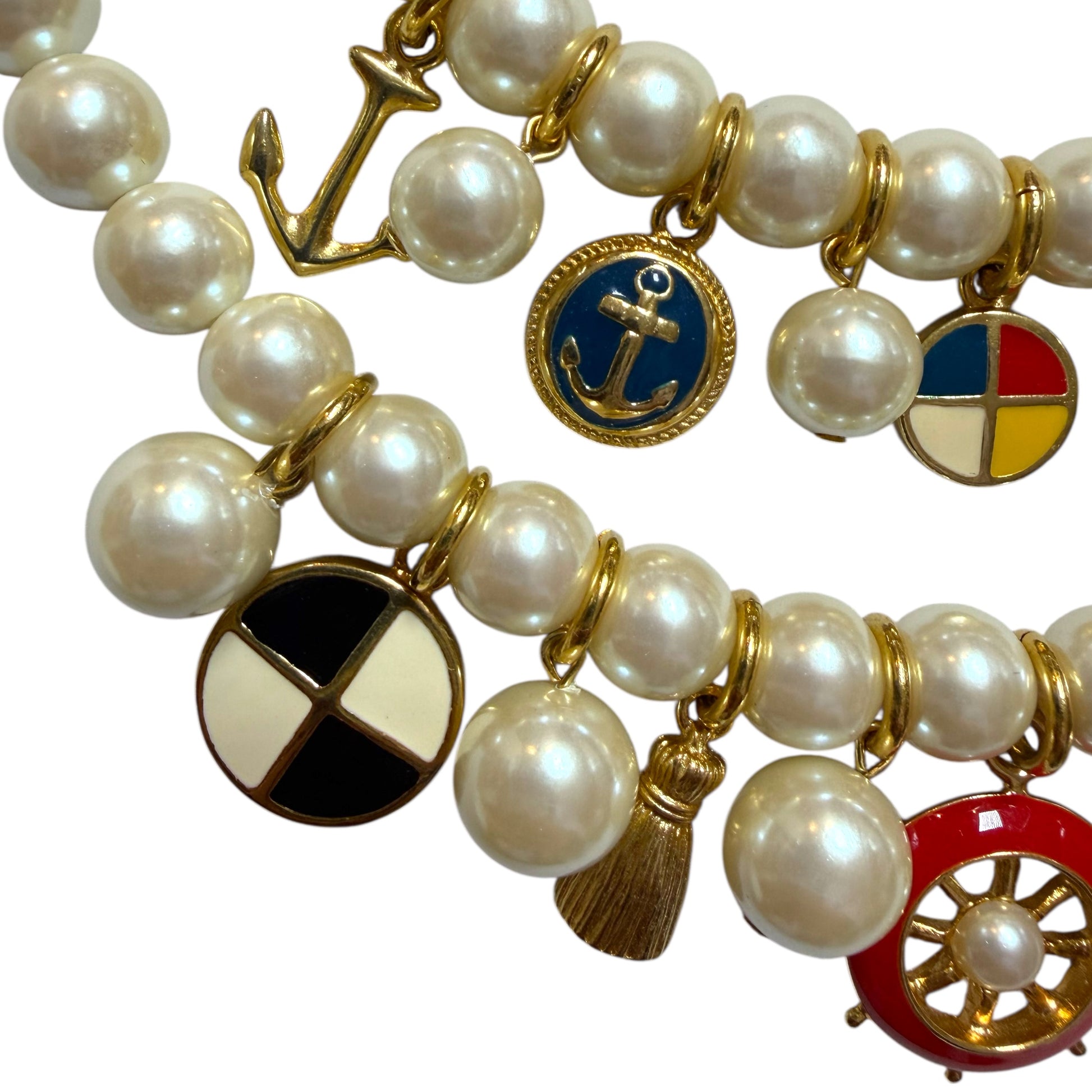 This signed Marvella necklace features a classic double strand of high-quality faux pearls, finished with an assortment of gold-tone nautical charms. The charms include anchors, medallions, and maritime motifs detailed with enamel accents, adding contrast and character to the design.