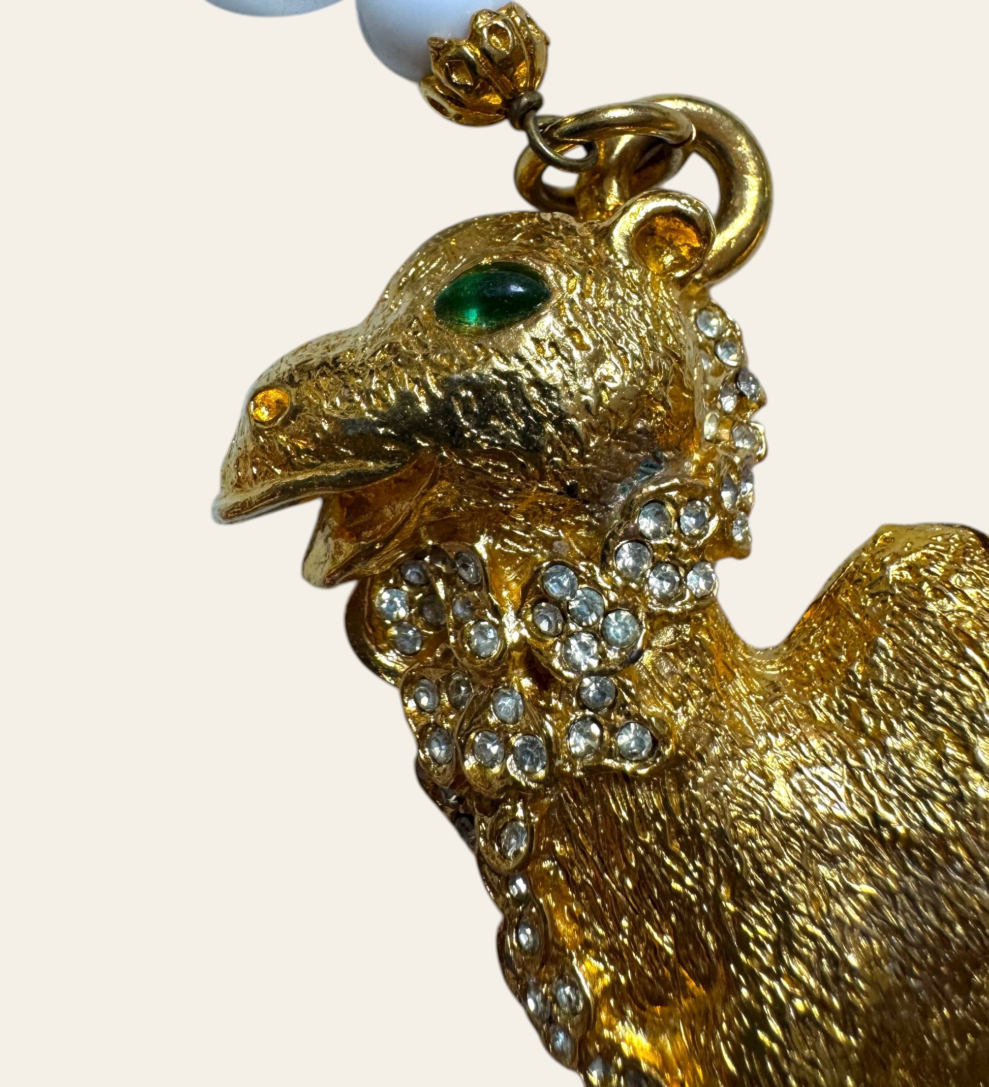 An extraordinary vintage signed Alexis Kirk necklace featuring two majestic gold-tone camels encrusted with rhinestones and crowned with deep green crystal eyes. This sculptural masterpiece captures Kirk’s signature bold, mythological aesthetic — both surreal and regal. The piece hangs from a double gold chain accented with white, pearl, and tiger eye beads, which I personally reworked to replace three missing originals.
