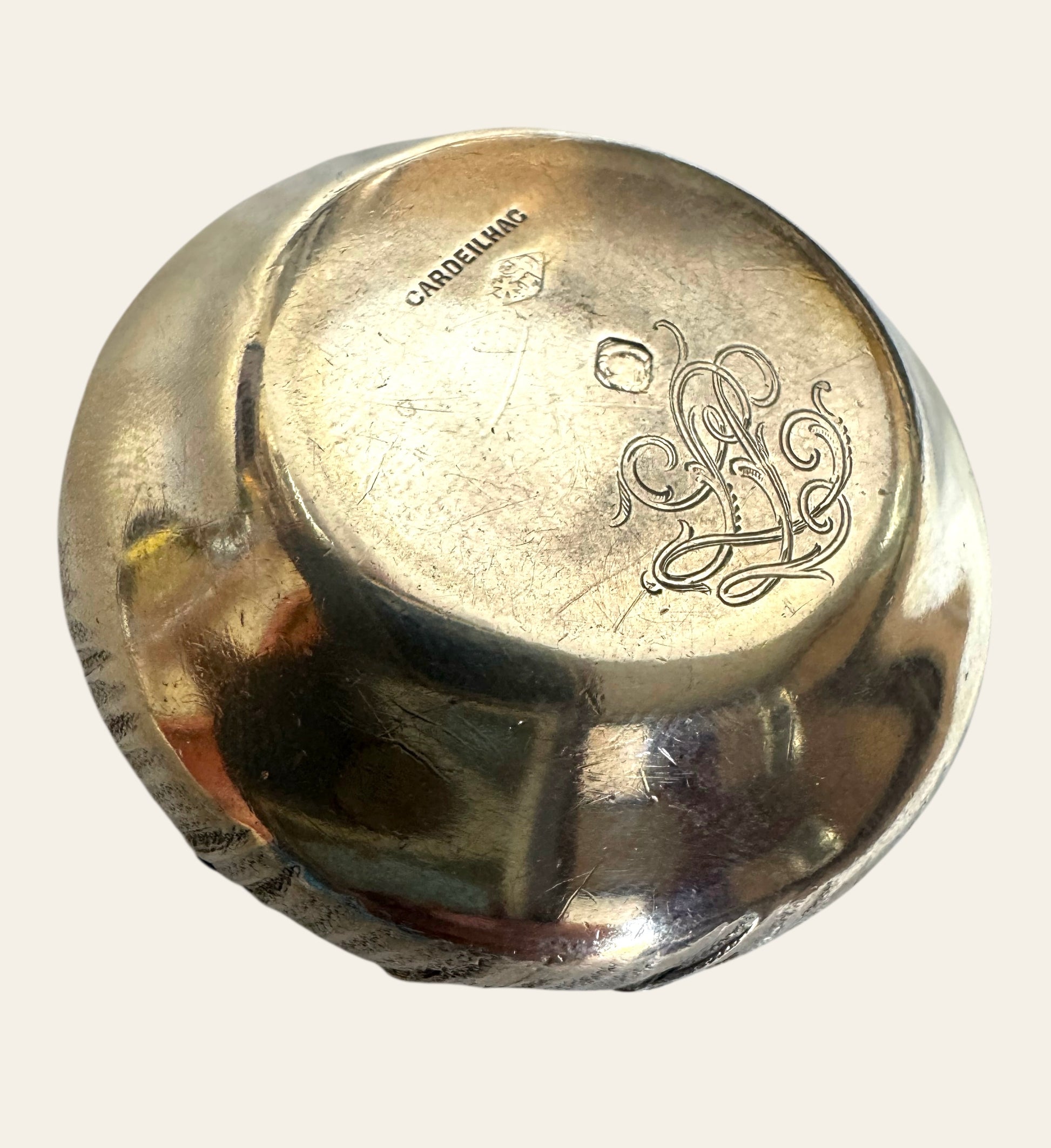 Hand-engraved initials flow like lace on the base, carrying the intimacy of a bygone Parisian boudoir. The silver has aged into a warm patina, soft and golden around the curves, revealing both its authenticity and its beauty. The mark “CARDEILHAC” confirms its noble origin, an echo of the Maison’s reputation for sensual craftsmanship and refined proportion.