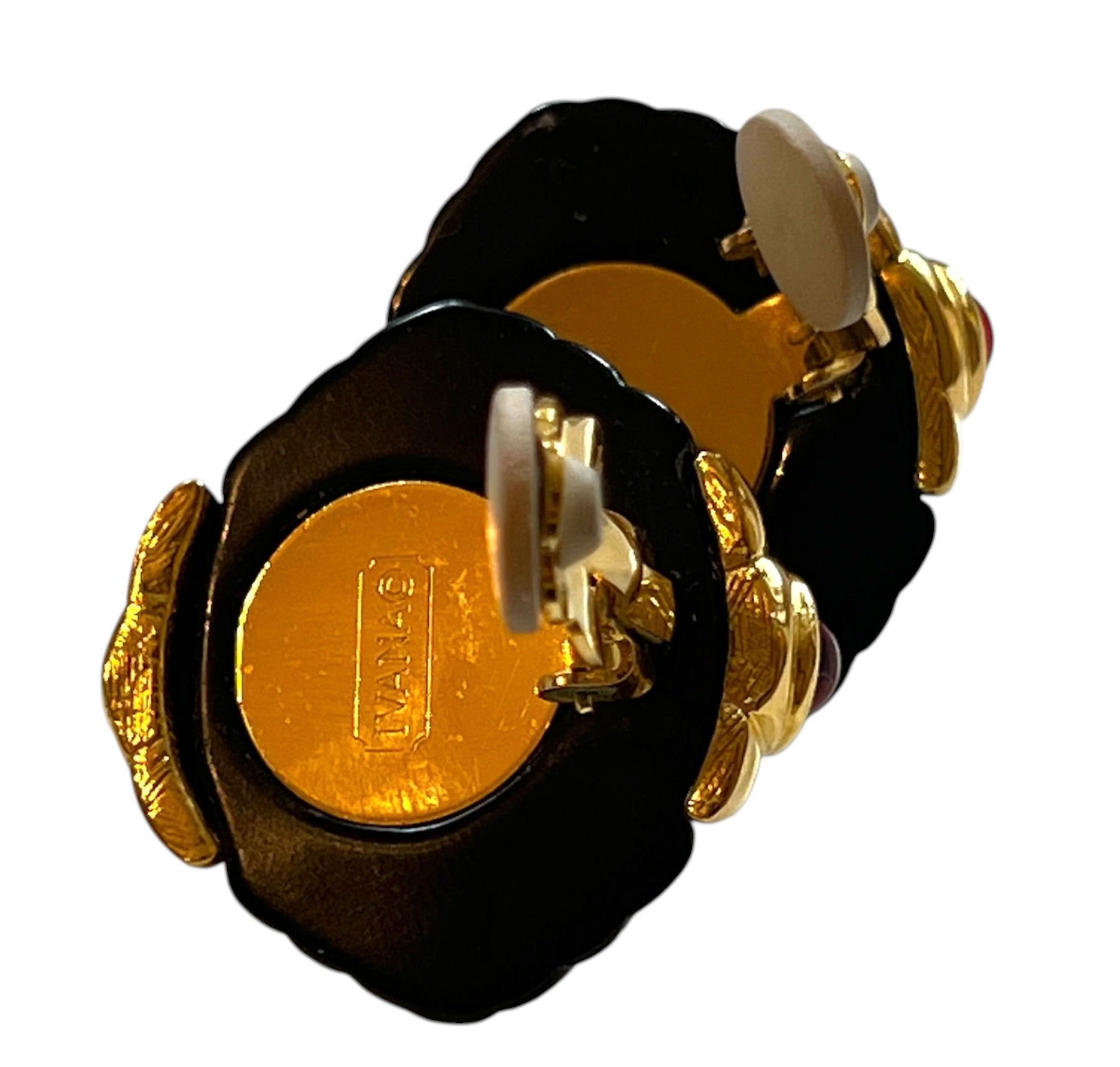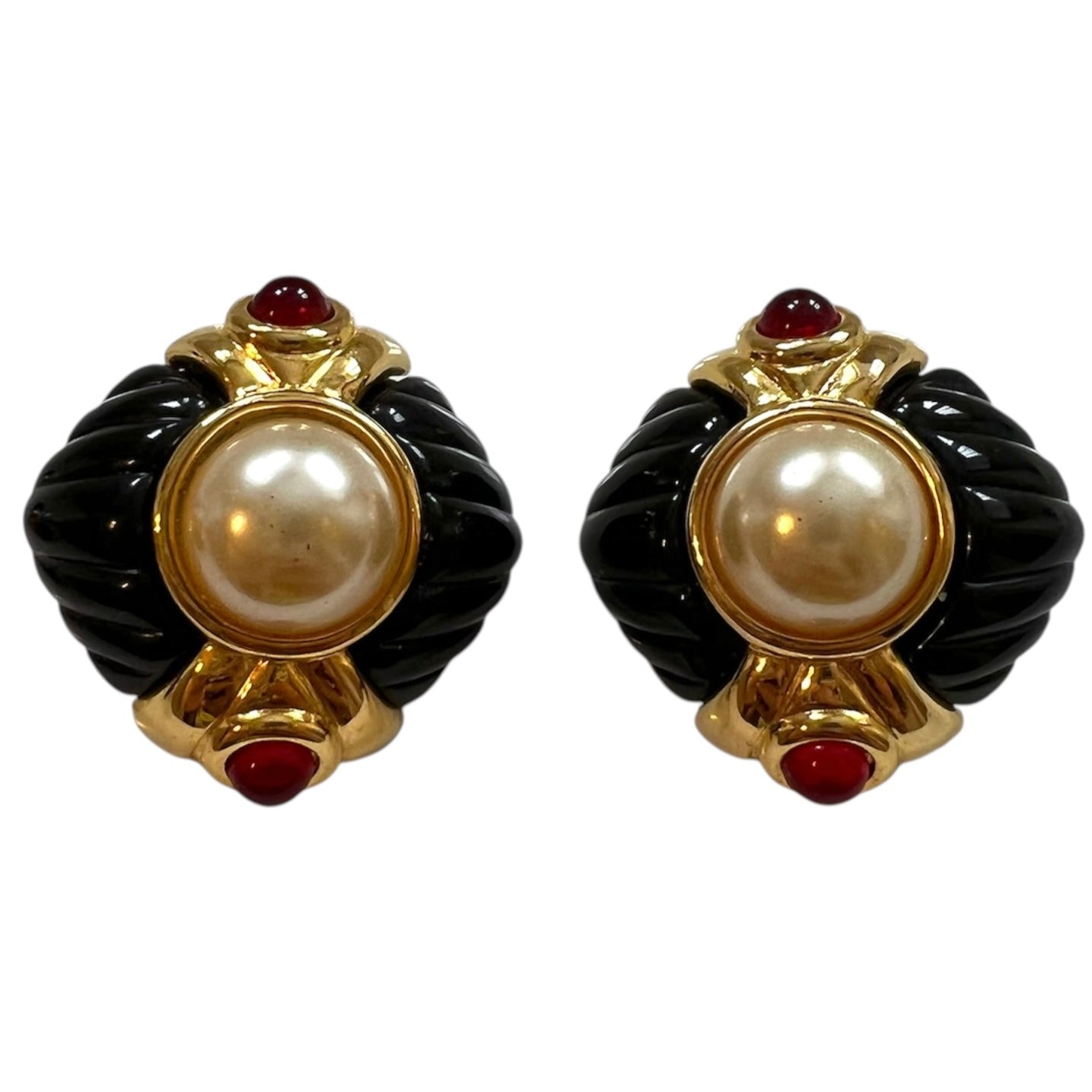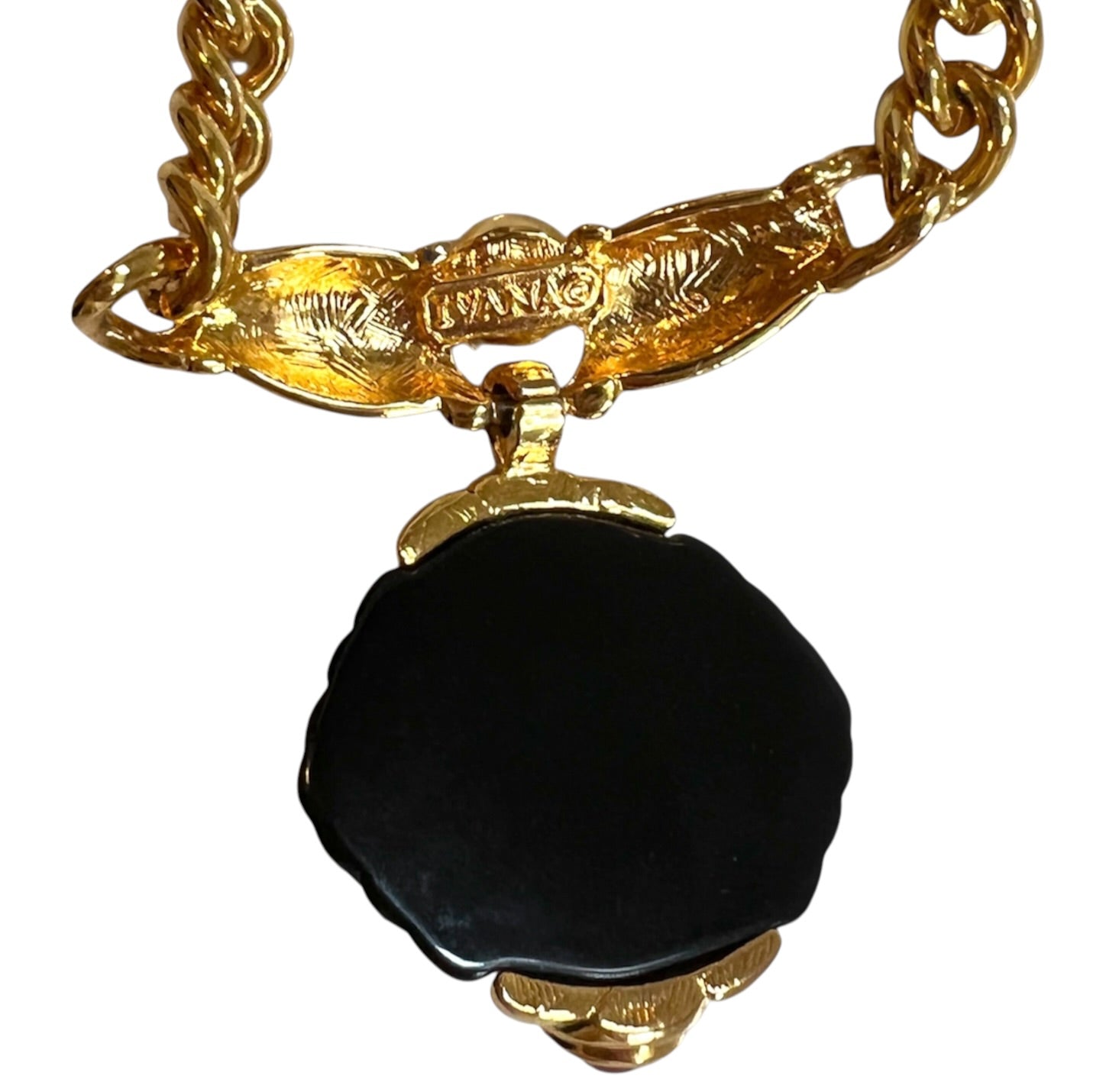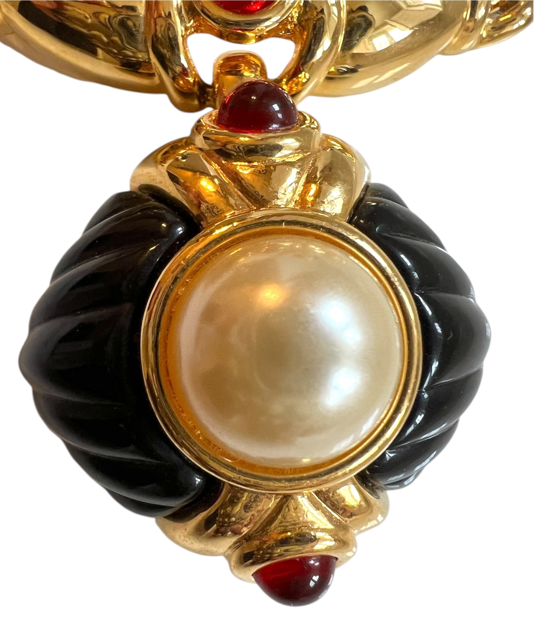 1980's set perfect for any formal event, signed "Ivana"(formal wife of Donald Trump) on the back of all pieces. Clip on earrings match exactly the pendant. It's a gold tone link choker with a faux pearl drop in the centre of a black glass pendant and with highlights of red glass cabochons.